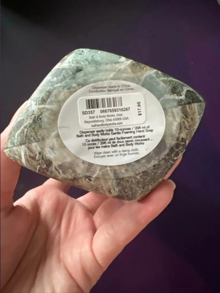 19This is a Bath & Body Works refillable soap dispenser, perfect for adding a touch of elegance to your bathroom or kitchen. It holds 10 ounces of foaming hand soap and features a lovely marble design. It is in new condition, never used, ready to adorn your sink! * Brand: Bath & Body Works * Capacity: 10 ounces * Design: Marble I'm pricing it at $10 CAD. Similar soap dispensers can be found for around $8-$15, so this is a fair deal! If you're reading this, it's still available!