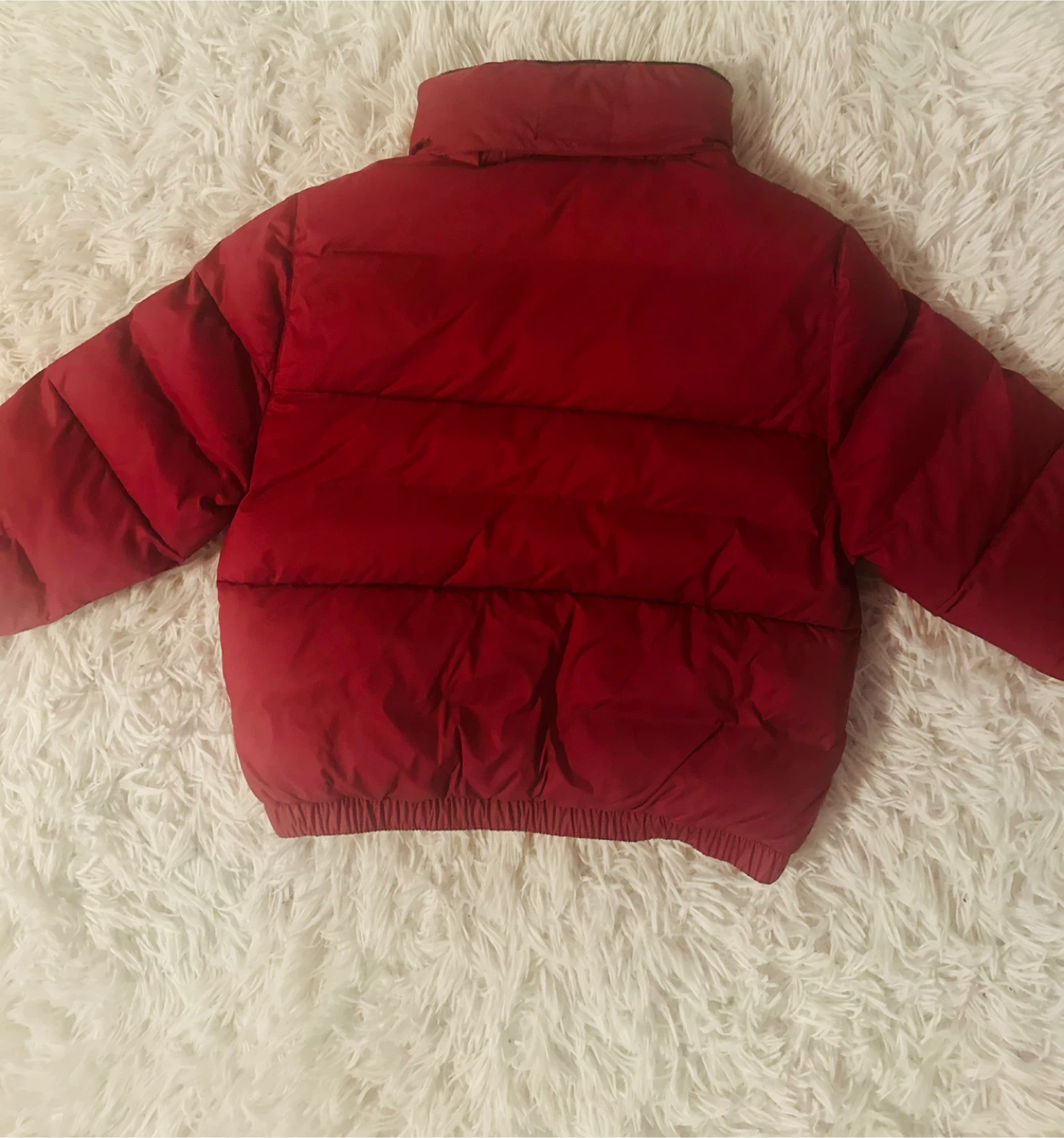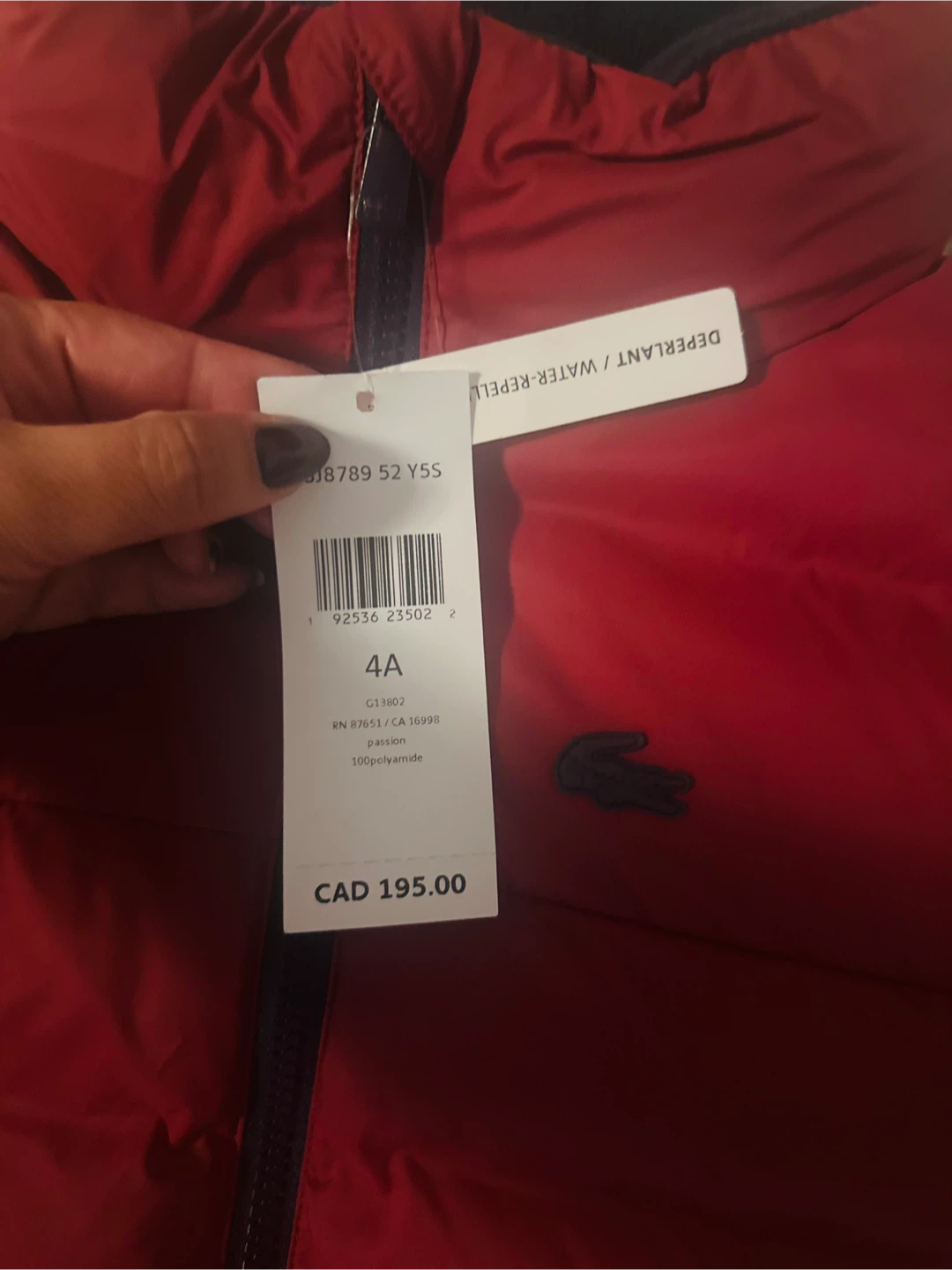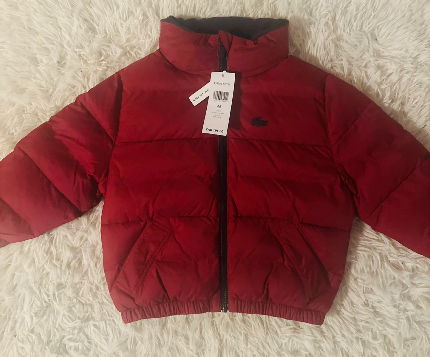 Here's a cozy red Lacoste puffer jacket for your little one! It's a size 4A and made of 100% polyamide. The tag shows it was originally CAD $195. It's water-repellent, perfect for keeping them warm and dry!