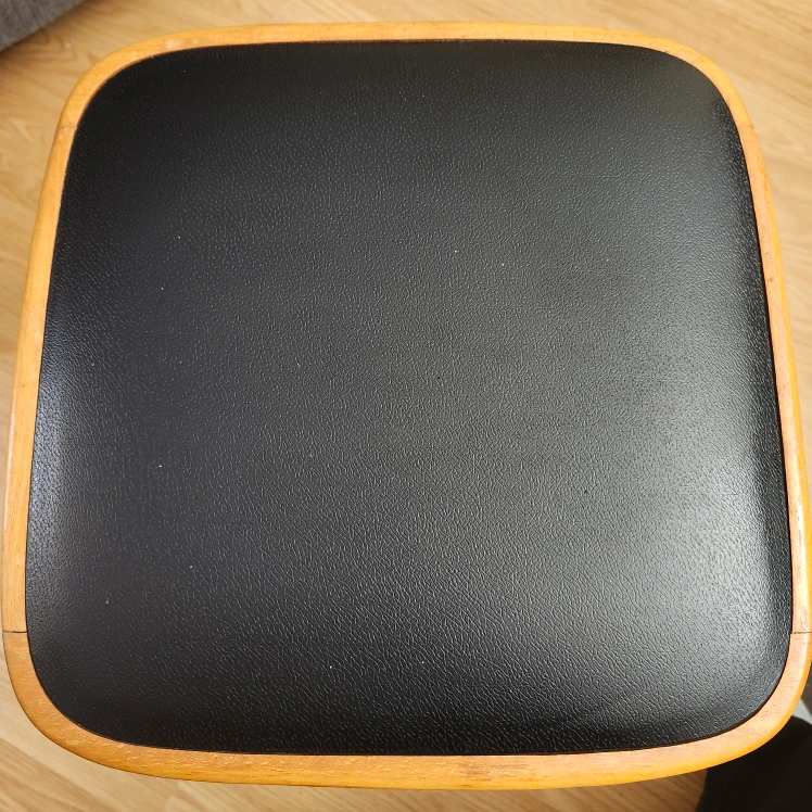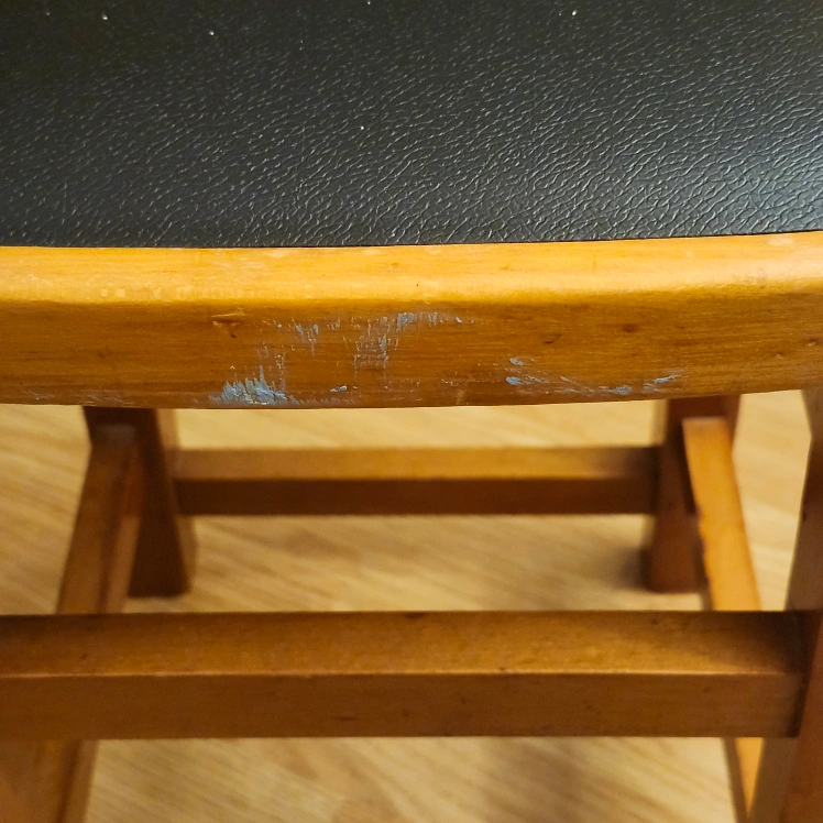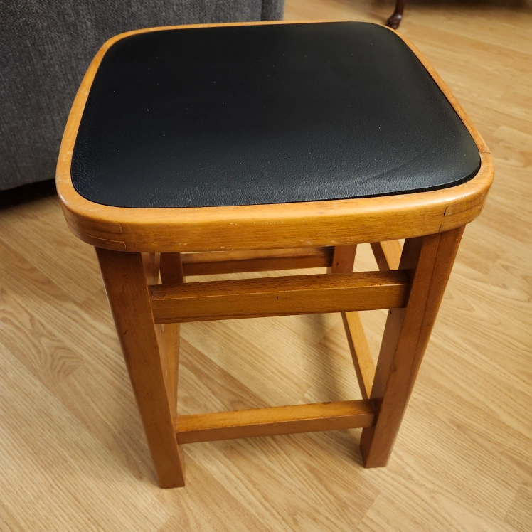 Selling a sturdy wooden stool with a comfy black leather seat! It measures approximately 13 inches across the top and stands about 18 inches tall. Perfect as a little side stool or extra seating. Has a little bit of paint on 1 side showing in 1 picture.