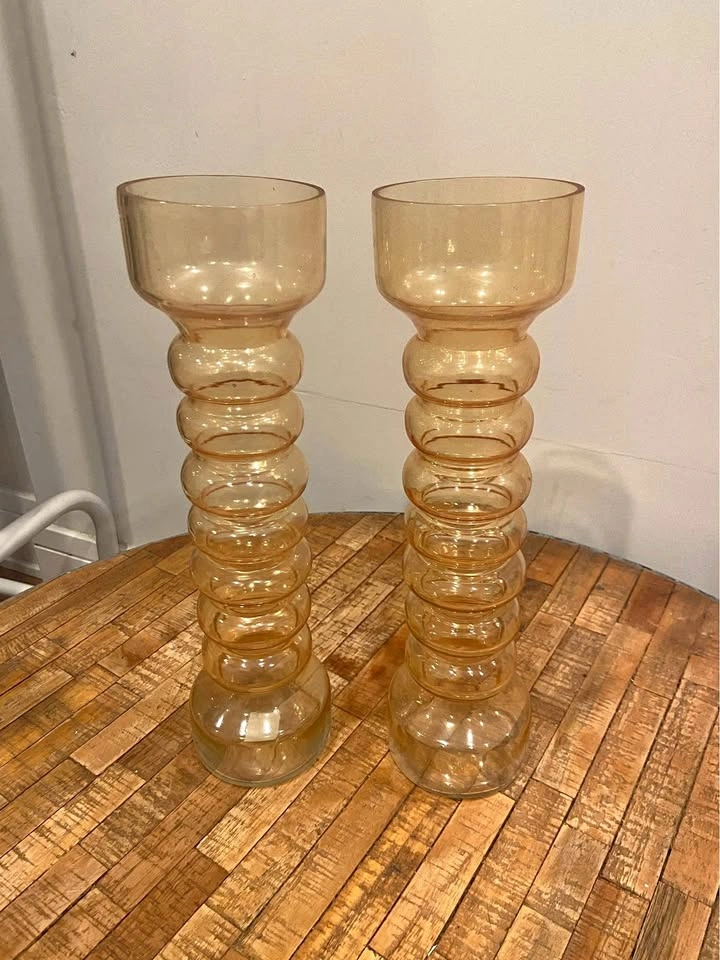 Translucent satin yellow finish highlights the curved silhouette of these glass candle holders. Great accents for an art deco, MCM, modern chic, eclectic fireplace.