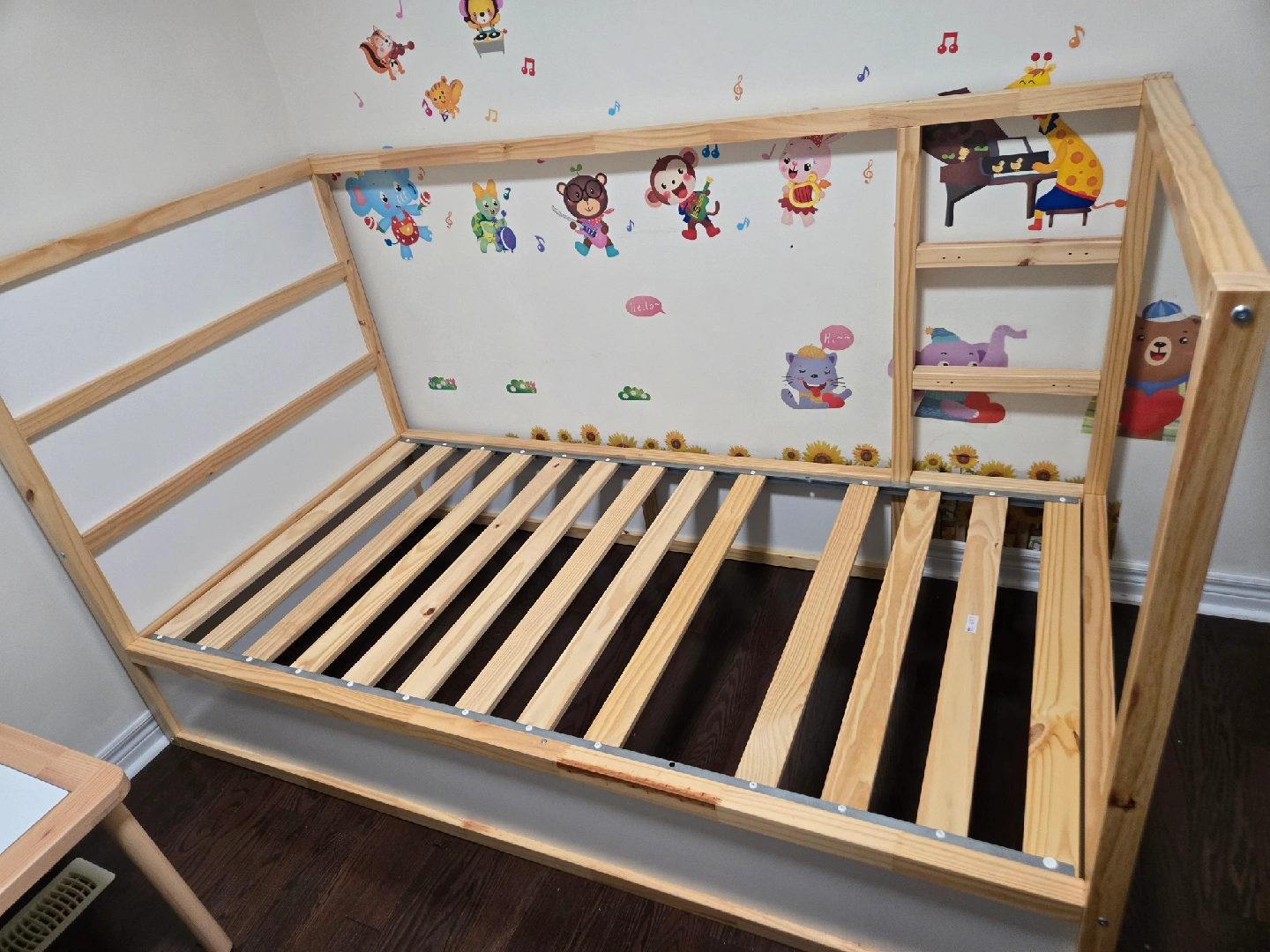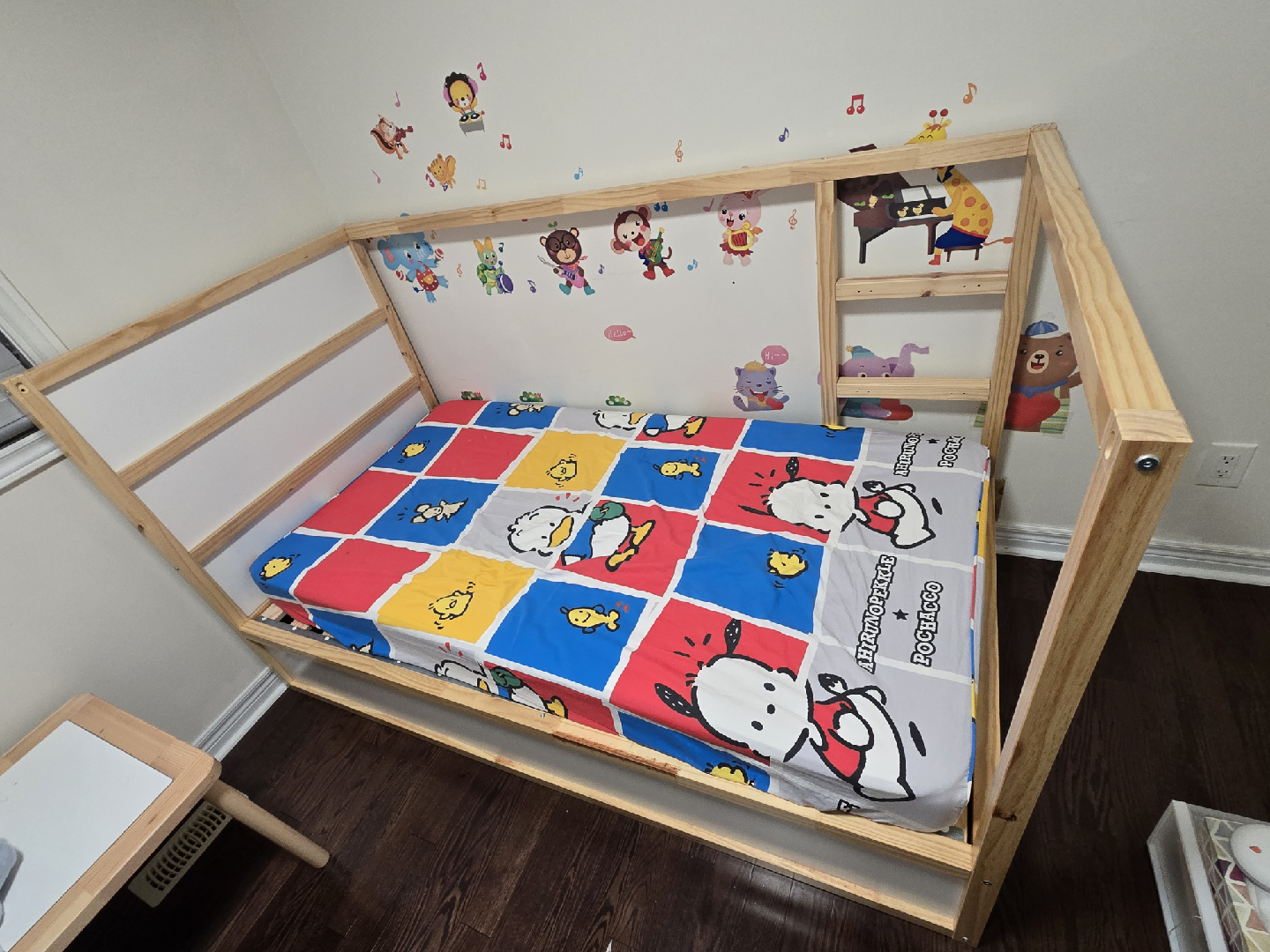 Ikea Kids house bed frame in great condition! It's a fun and unique bed that my child has outgrown. The frame is sturdy and easy to assemble. I have disassembled to some larger pieces as shown in the picture. Screws are also packed in sealer bags. Perfect for creating a cozy and imaginative space for your little one. Lightweight latex mattress sold separately at $50.