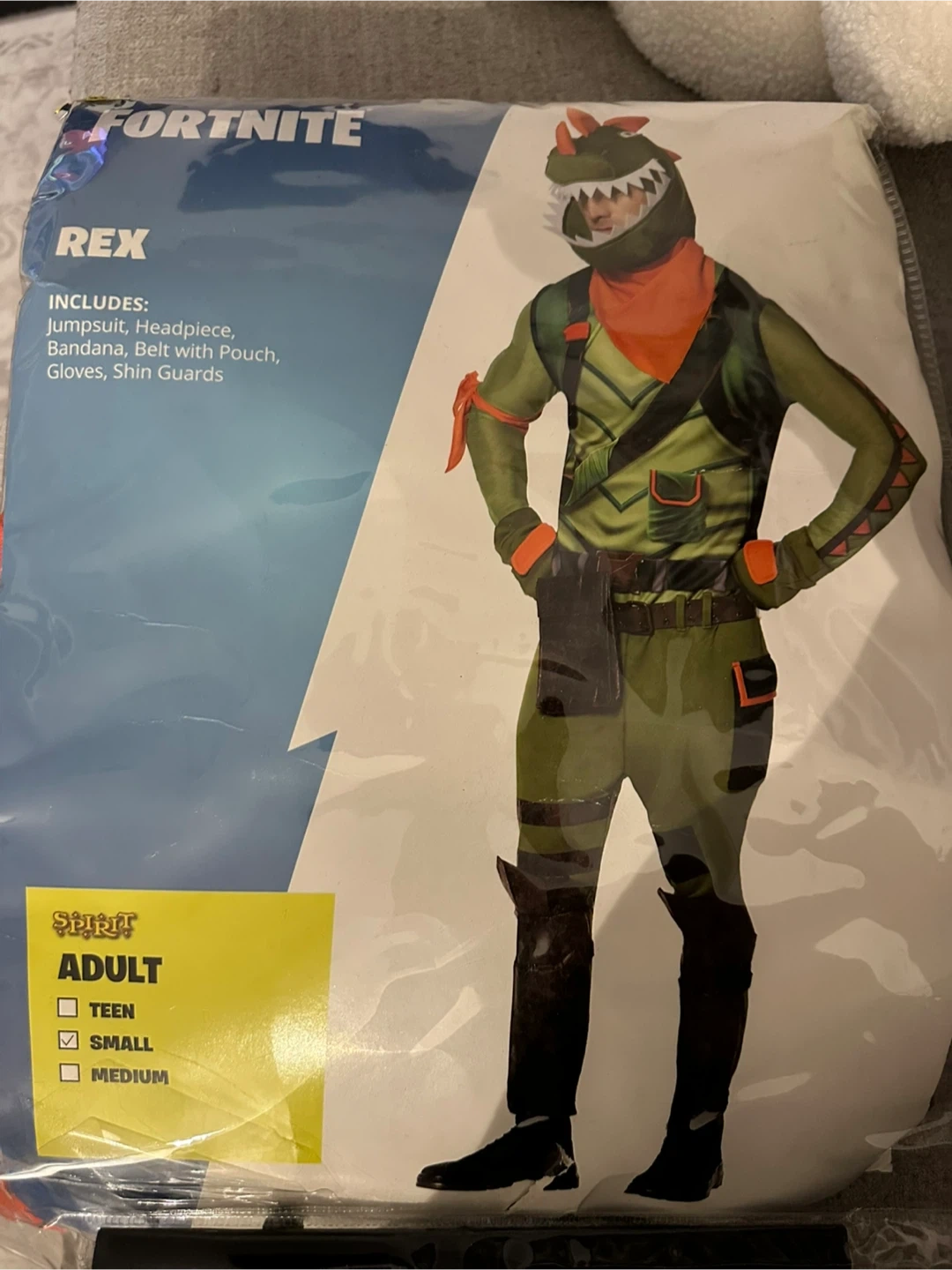 Selling a Fortnite Rex costume for adults, size small! This costume includes a jumpsuit, headpiece, bandana, belt with pouch, gloves, and shin guards. Perfect for Halloween or cosplay!