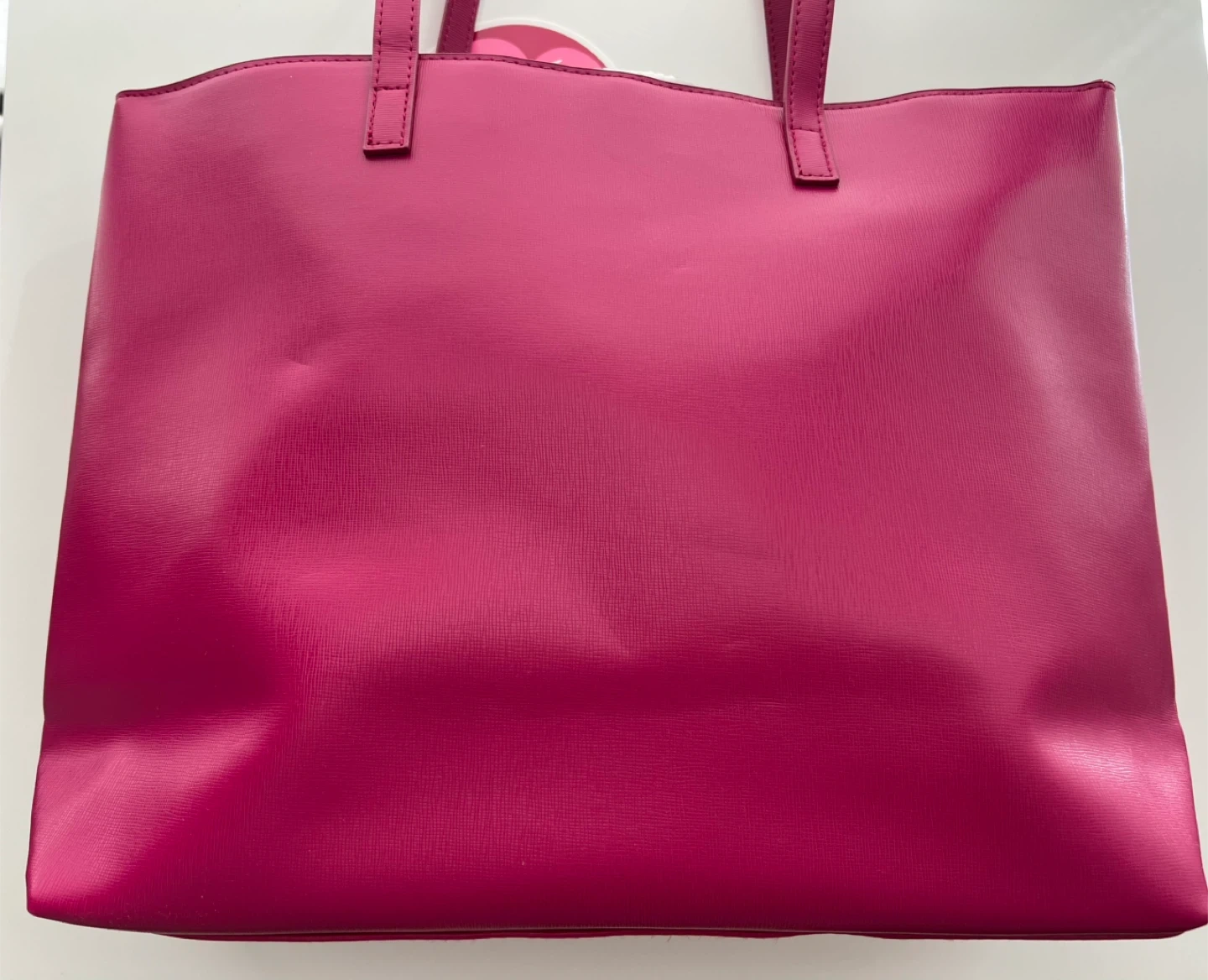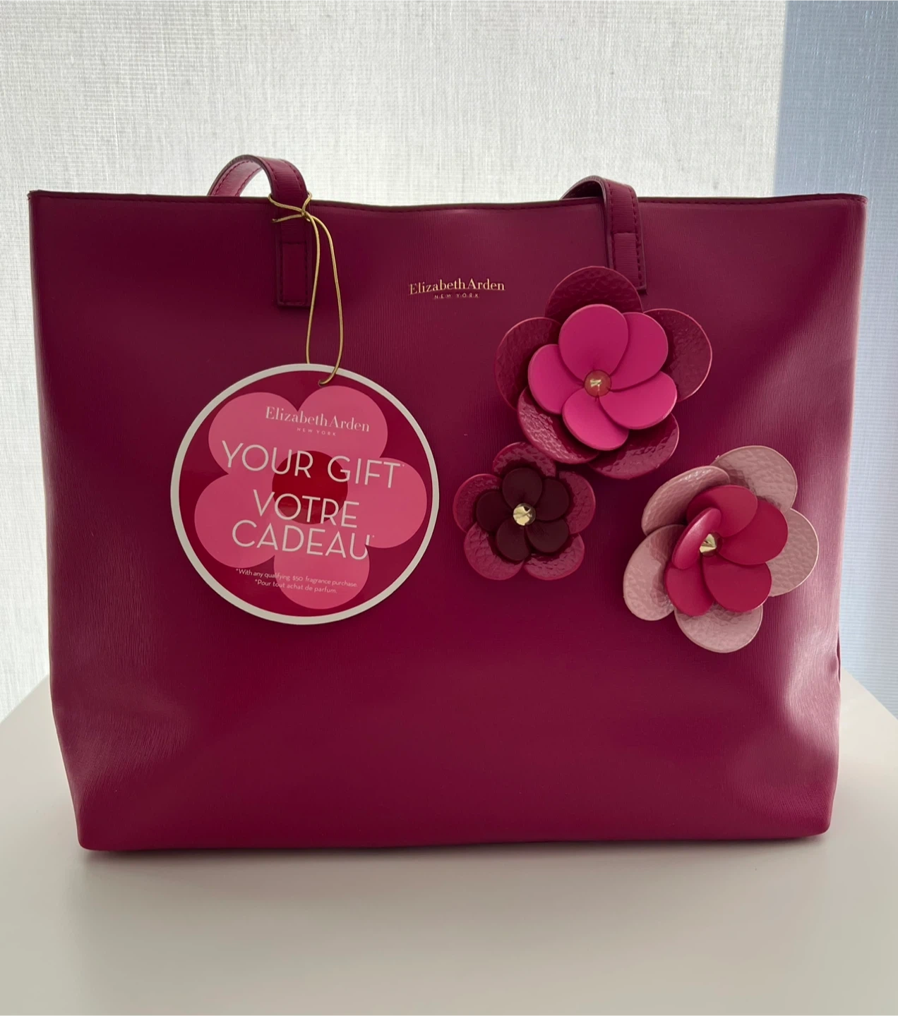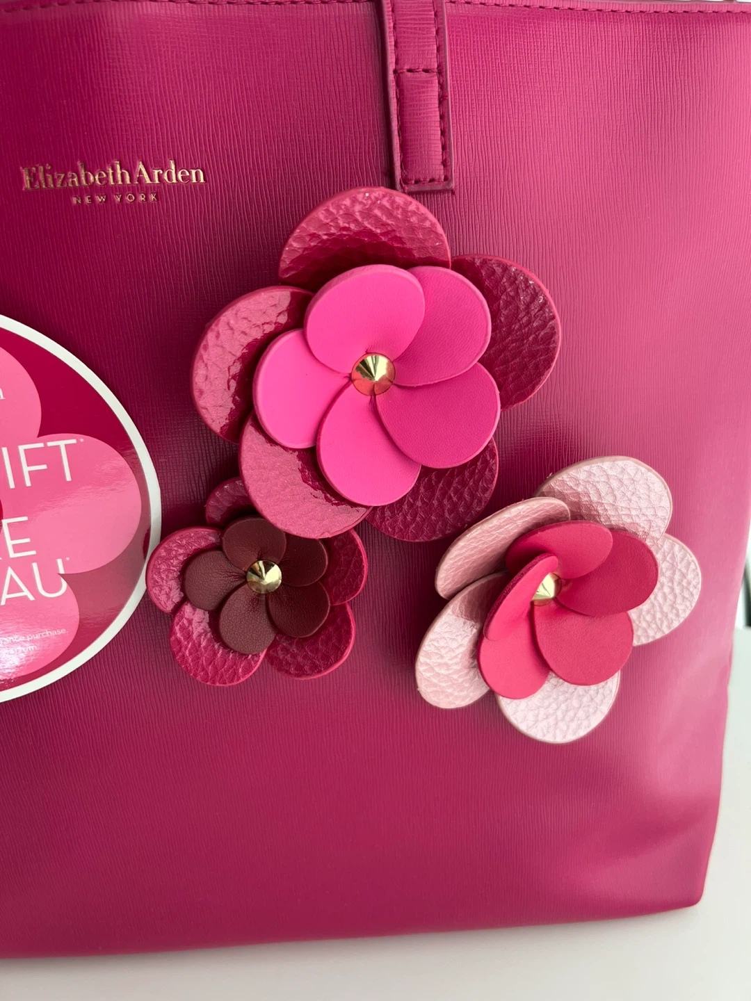 This is a cute Elizabeth Arden tote bag in a lovely shade of pink! It features flower embellishments on the front. Perfect for carrying your essentials in style