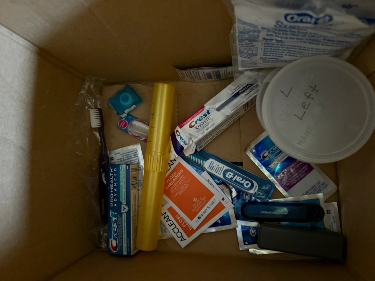 Unused toothbrushes, dental floss, teeth whitening strips (expired), tooth paste, plastic containers for dentures etc.