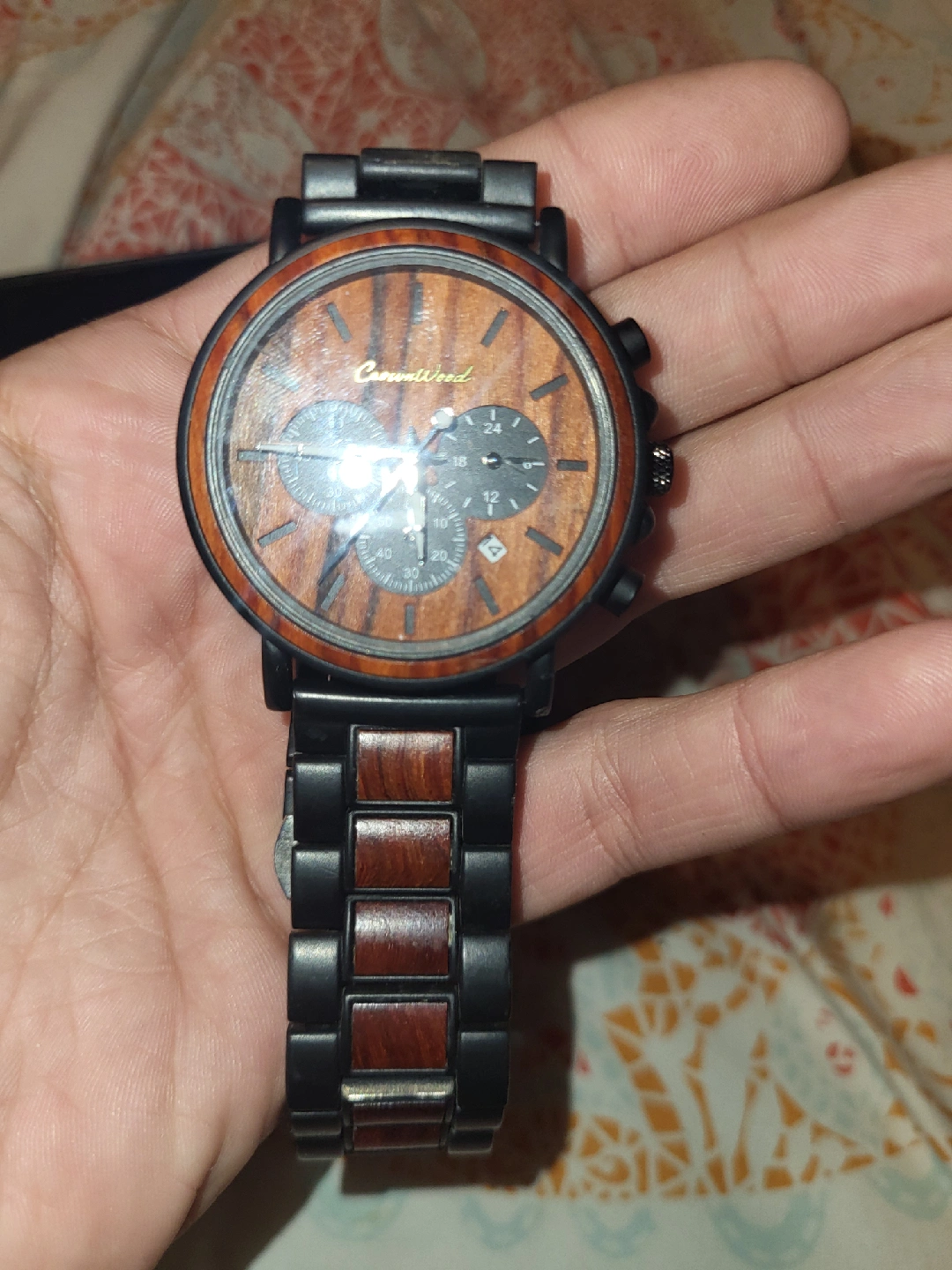 Selling a CarrantWood watch with a unique wooden face and black metal band. It's in great condition and ready for a new owner! The watch features a chronograph design and would make a stylish addition to any outfit