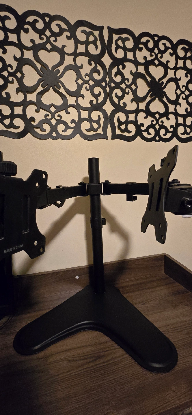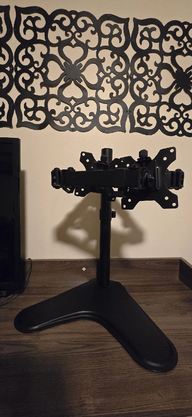 I'm selling a like new black dual monitor desk mount stand, perfect for optimizing your workspace! This stand is in great condition and can hold two monitors up to 30", freeing up valuable desk space and improving ergonomics.