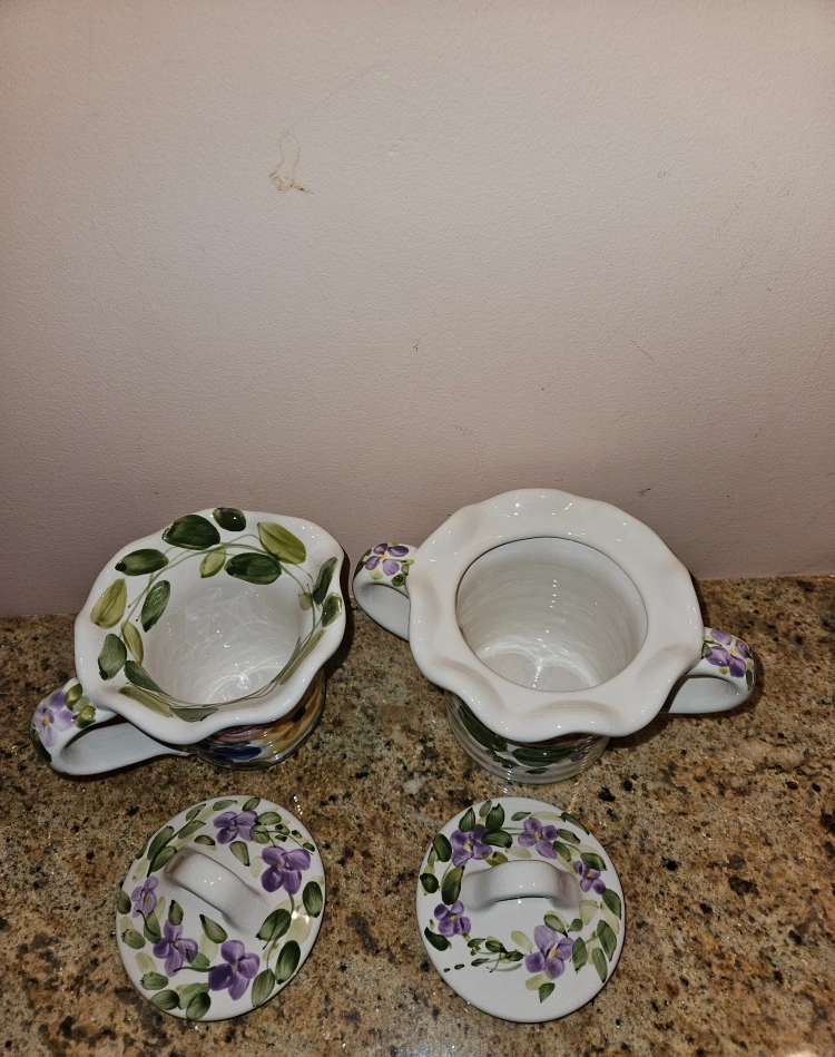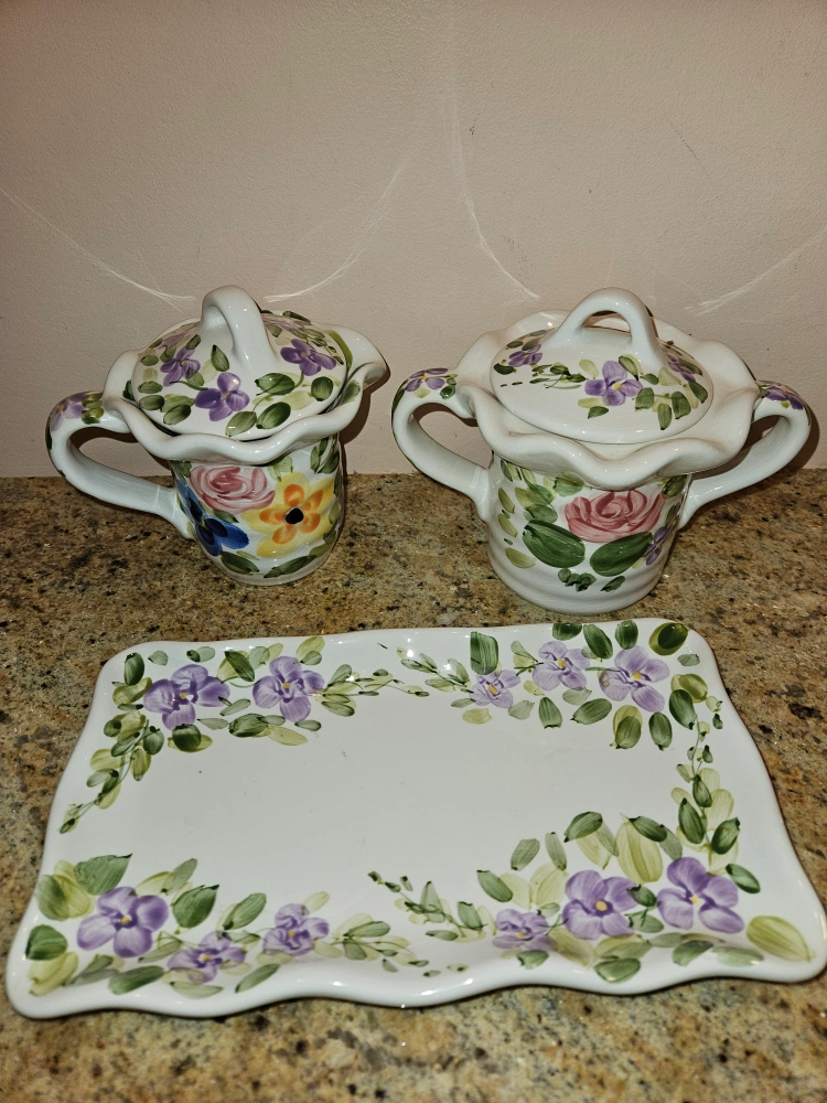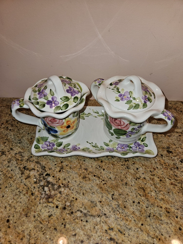 Here's a lovely floral sugar bowl and tray set! The set includes two sugar bowls with lids and a matching tray. The bowls and tray are decorated with beautiful floral designs in purple, pink, and green. They would be a charming addition to any table setting