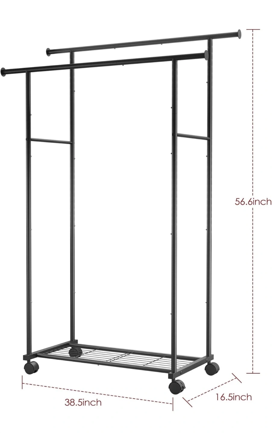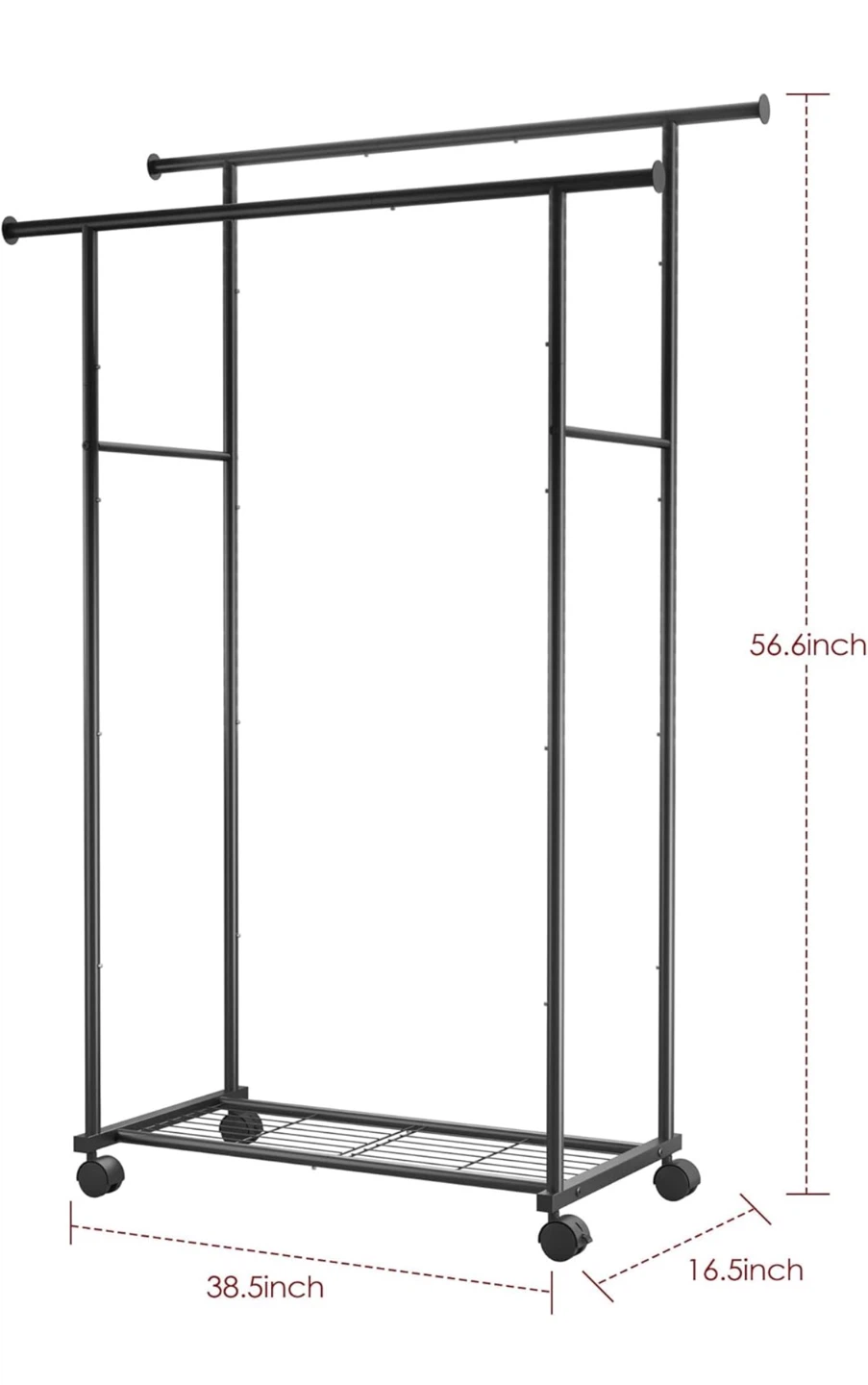 This black metal clothes rack is perfect for adding extra storage to your closet or laundry room. It features a double rod design and has dimensions of 56.6 inches in height, 38.5 inches in width, and 16.5 inches in depth. It's new, and ready for a new home!
