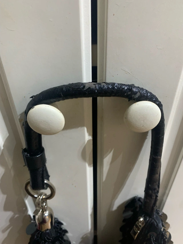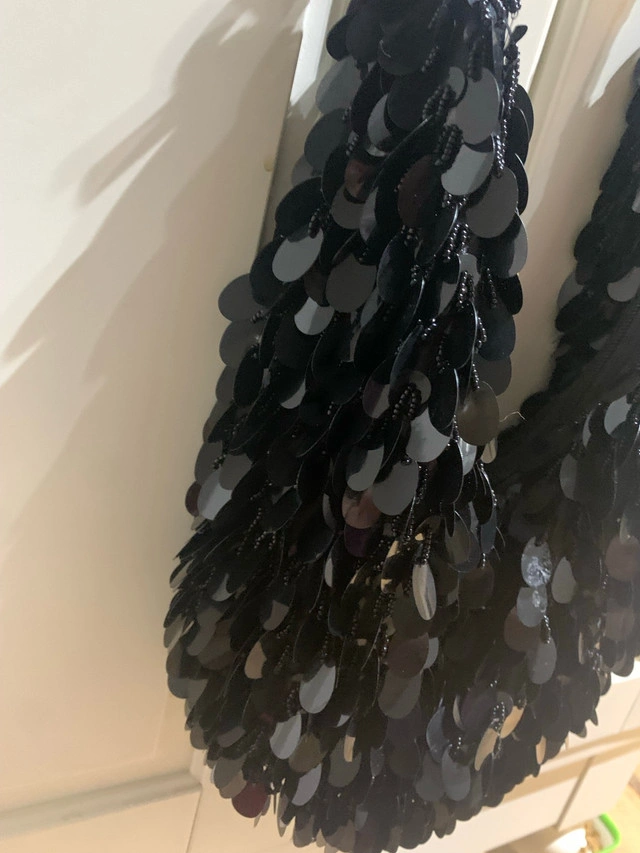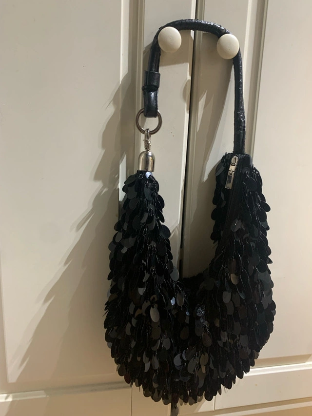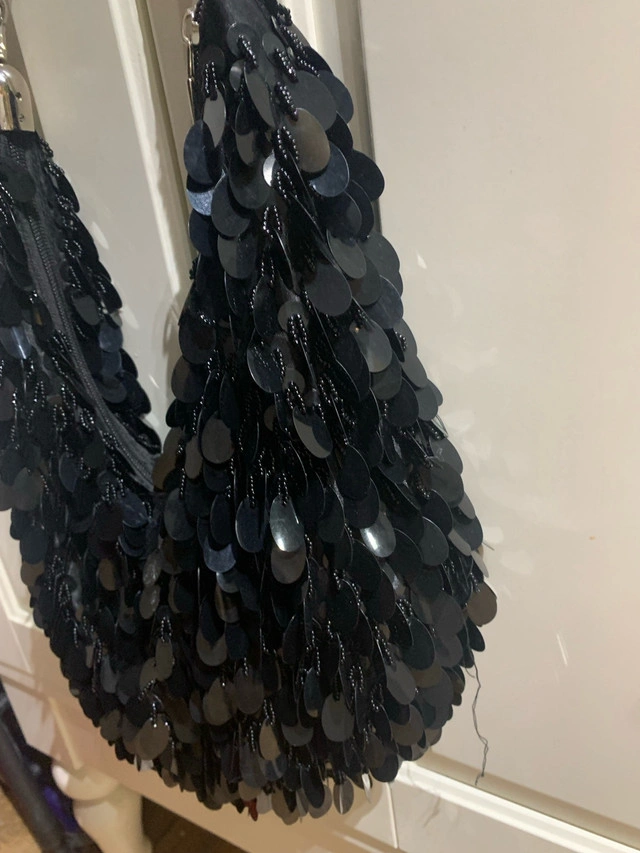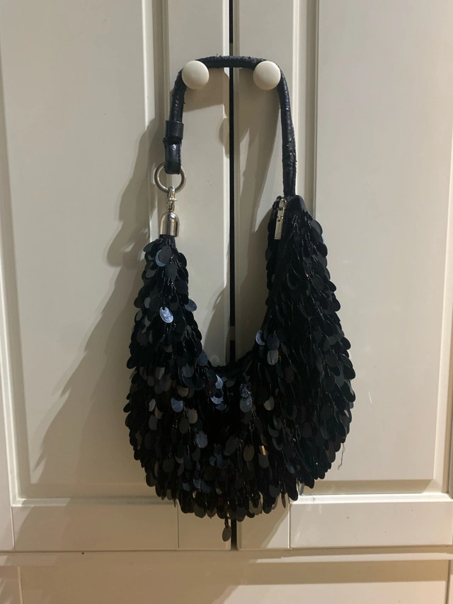 This used sequin bag features a dazzling array of black sequins, perfect for adding a touch of sparkle to any outfit. Please note that the handle shows signs of wear and tear, as pictured. She's not just a bag; she's a statement! Embrace the shimmer and let this sequin sensation spice up your wardrobe. If the ad is up, the bag is available!