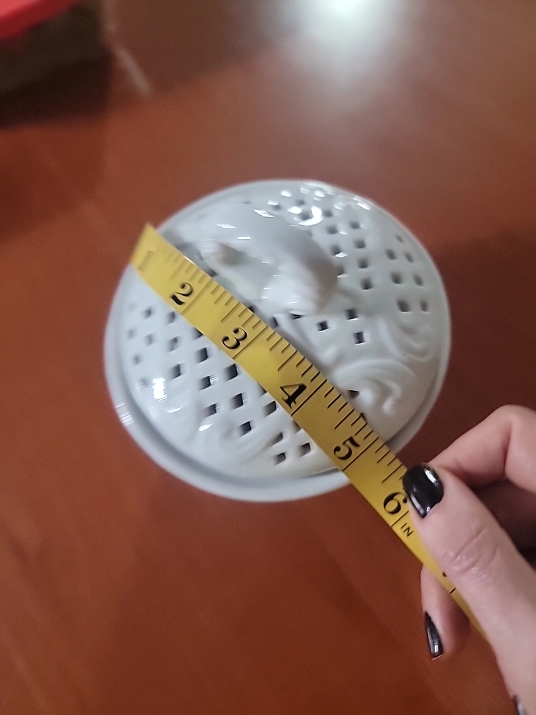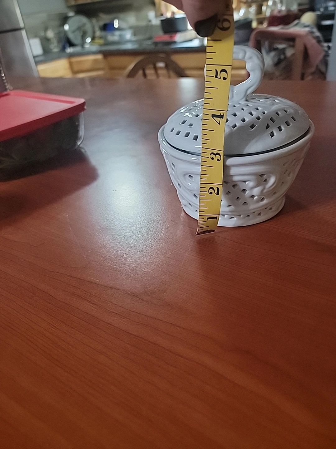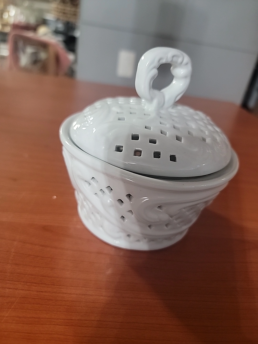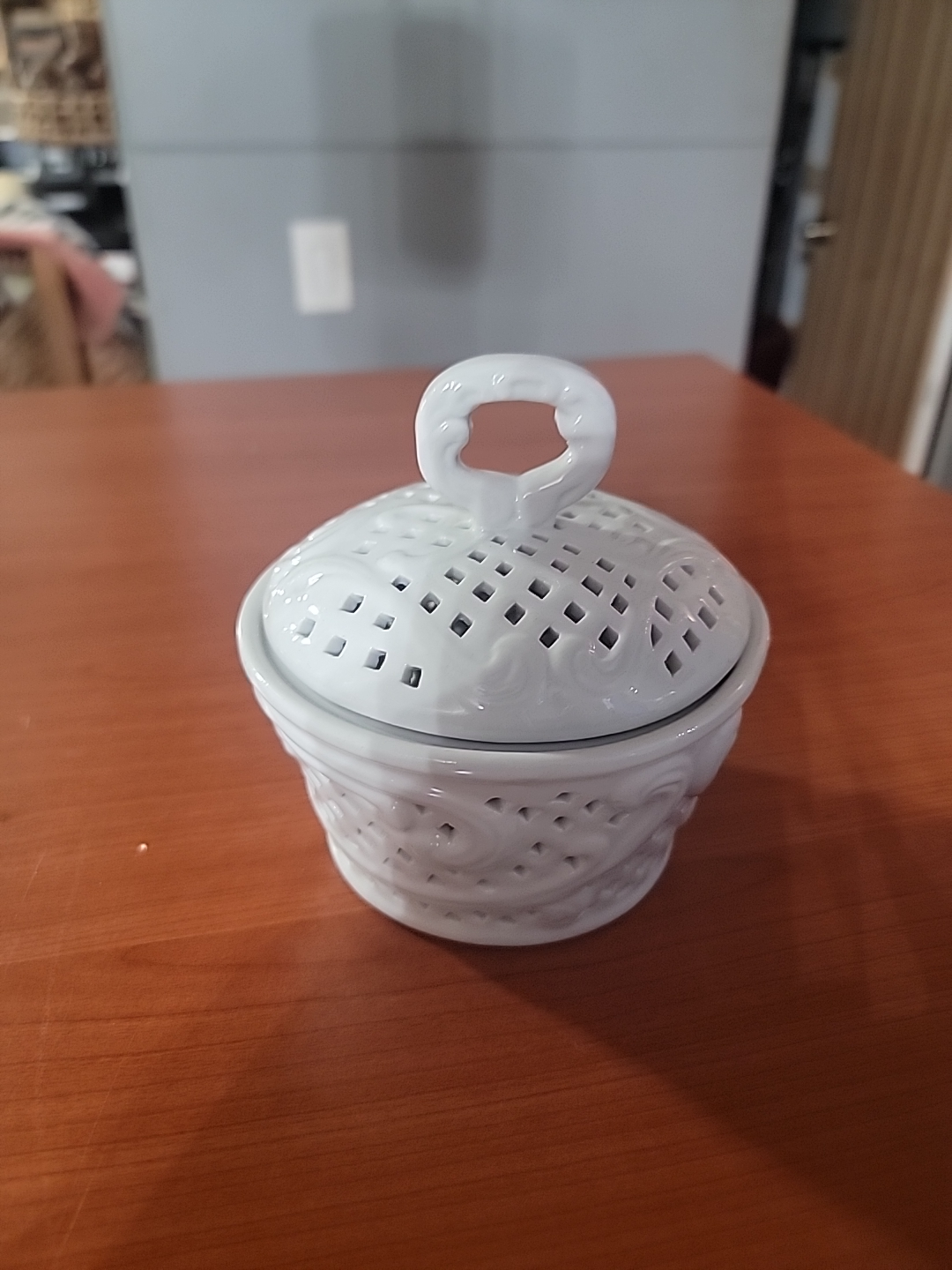 Here is a lovely RR Treasures porcelain covered dish! It features a beautiful swan design on the lid and intricate latticework details. It measures approximately 6 inches tall and is in great condition!