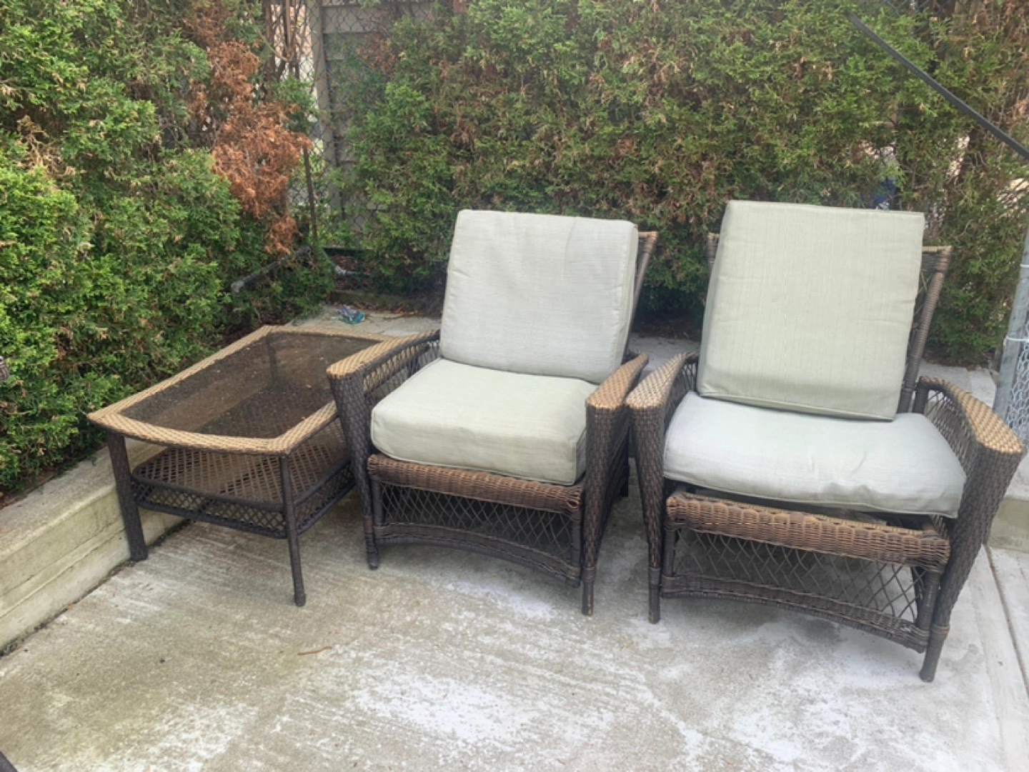 2 chairs ,1 table, 1 love seater . Can sell separate , pick up only , cushion need a cleaning can go in washing machine , i whipped down furniture, I can help load to ur van or suv .