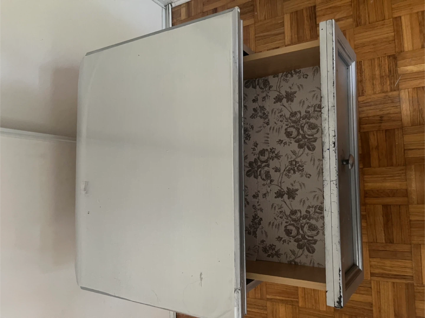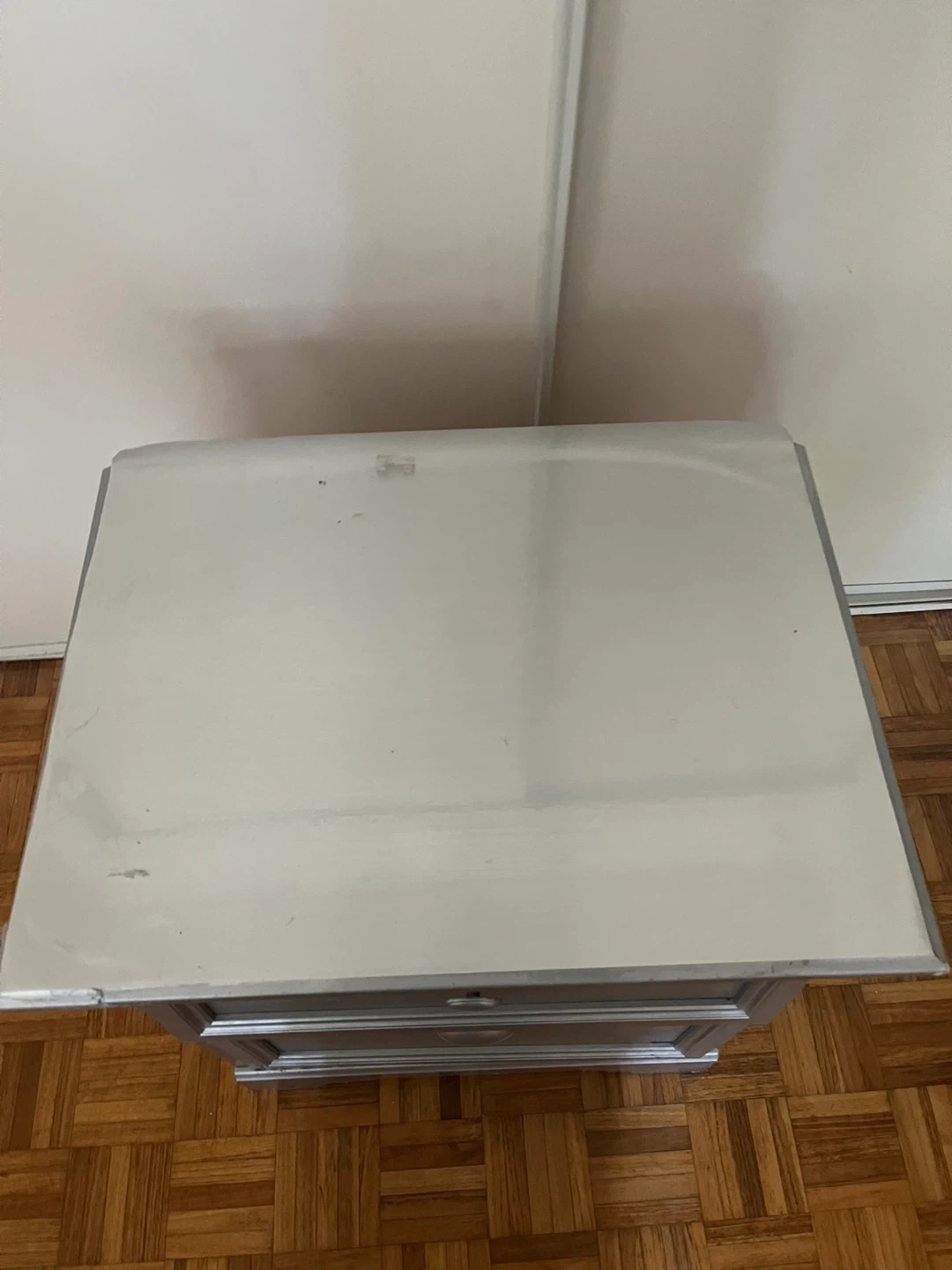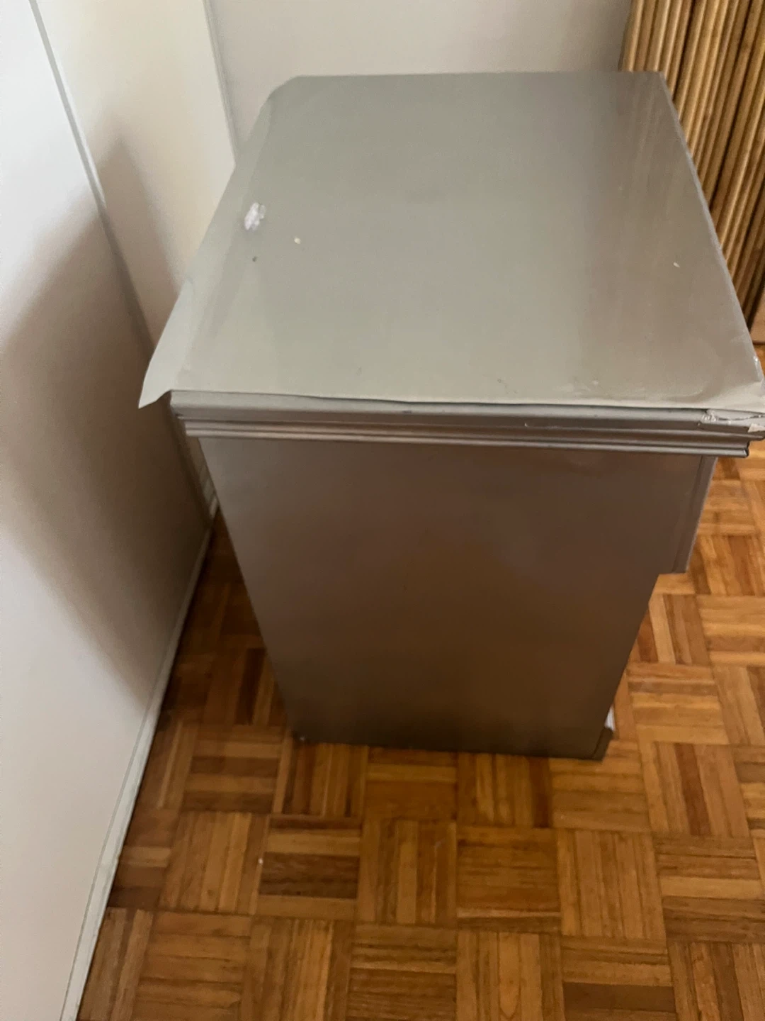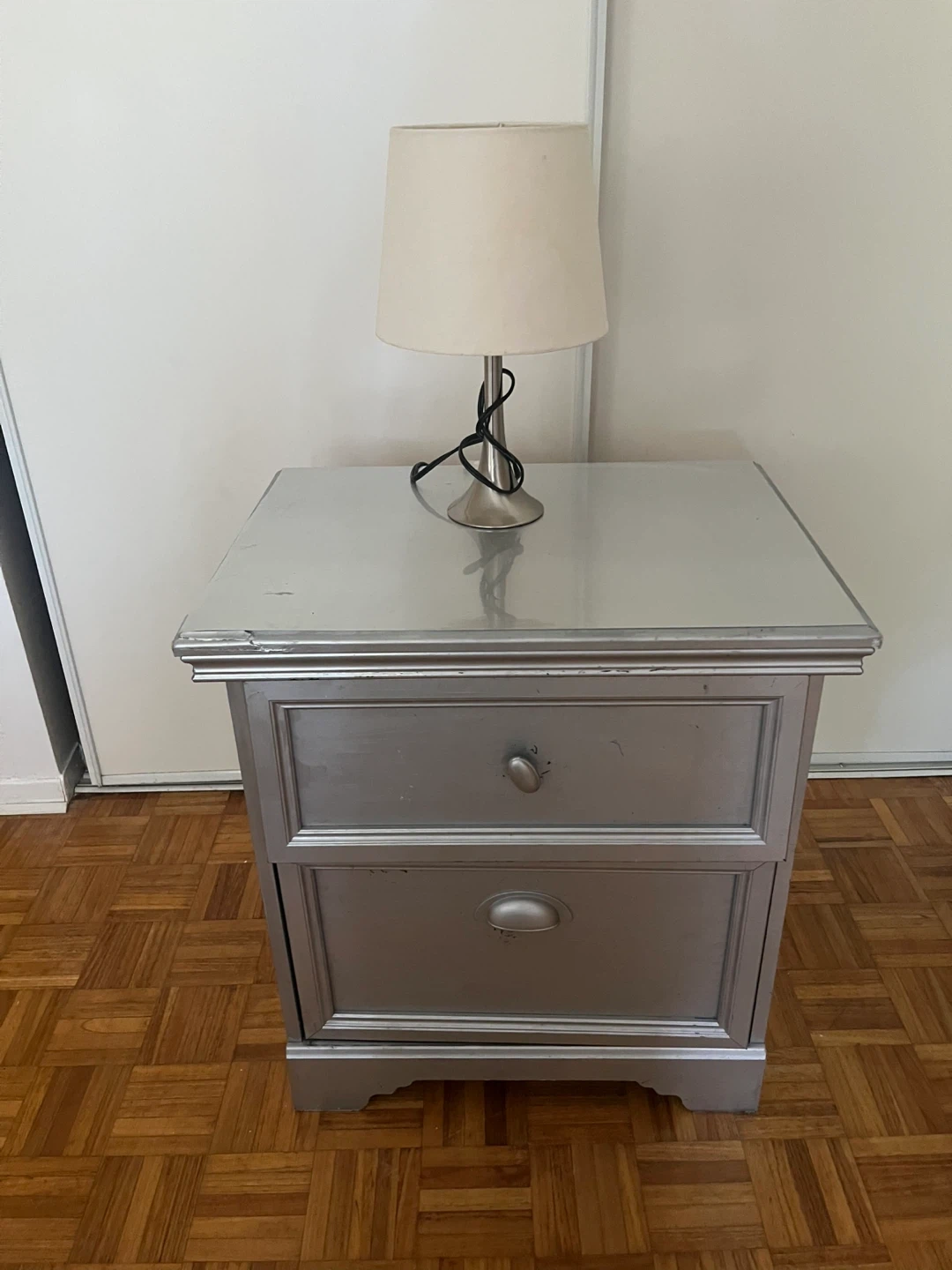 In fair condition, metallic silver drawer, and cupboard style nightstand dresser.