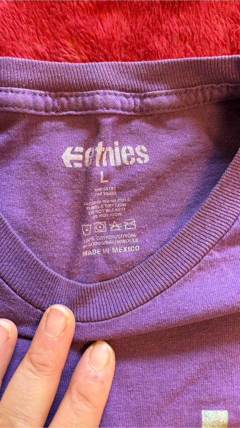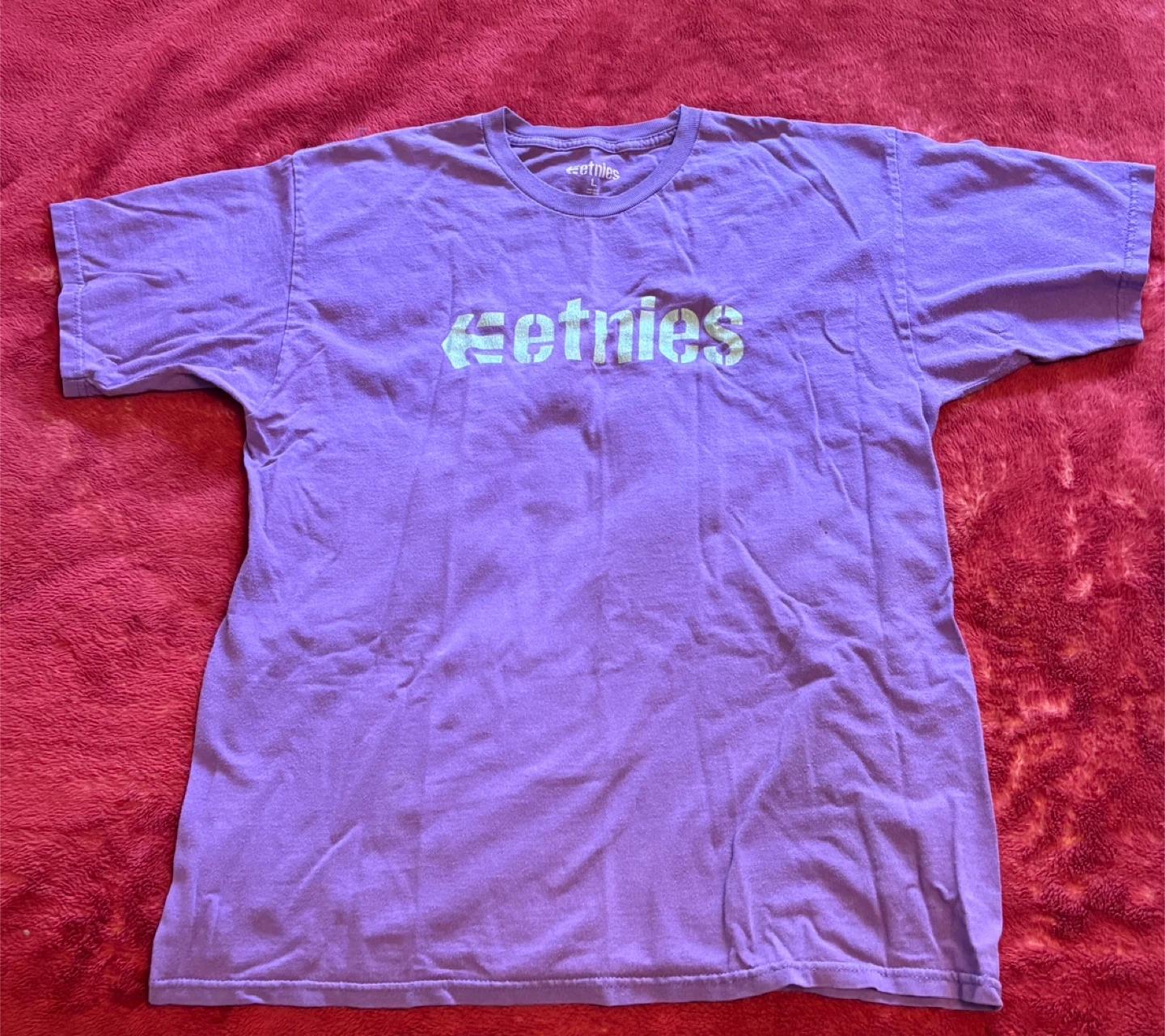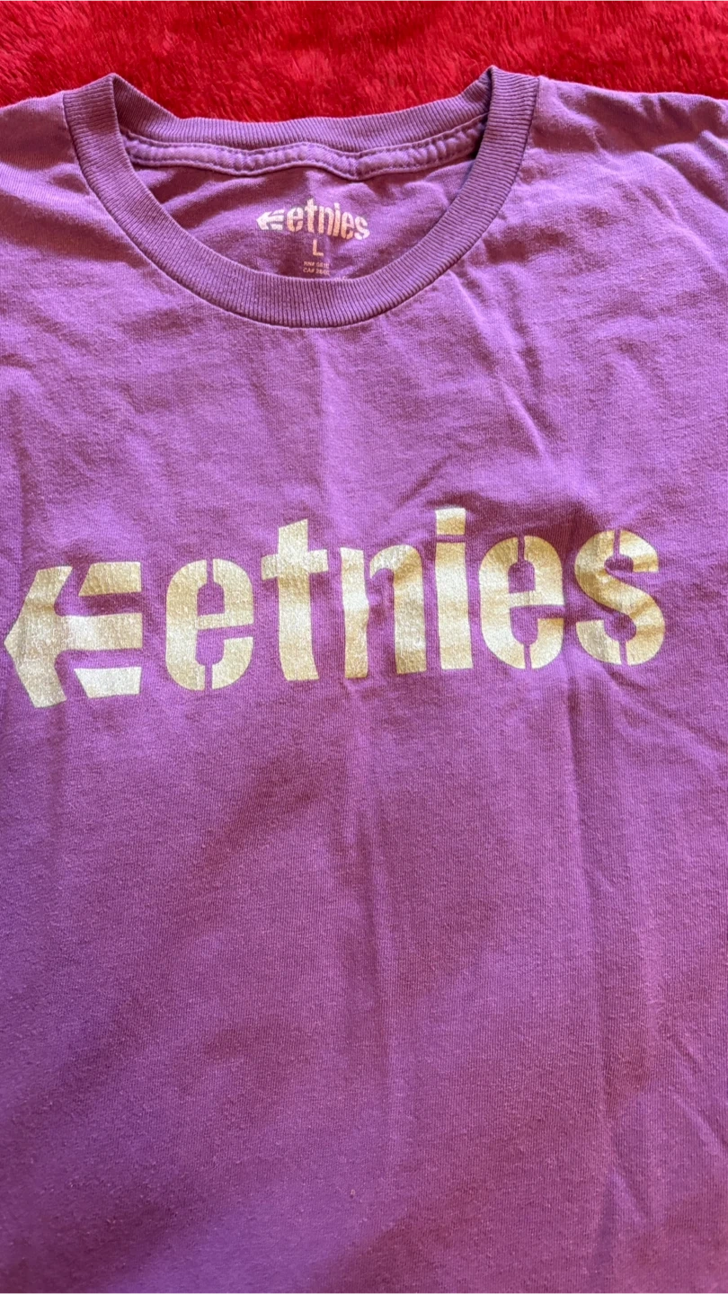 Selling a purple Etnies t-shirt in size large. It's made of 100% cotton and in good condition. Perfect for casual wear!