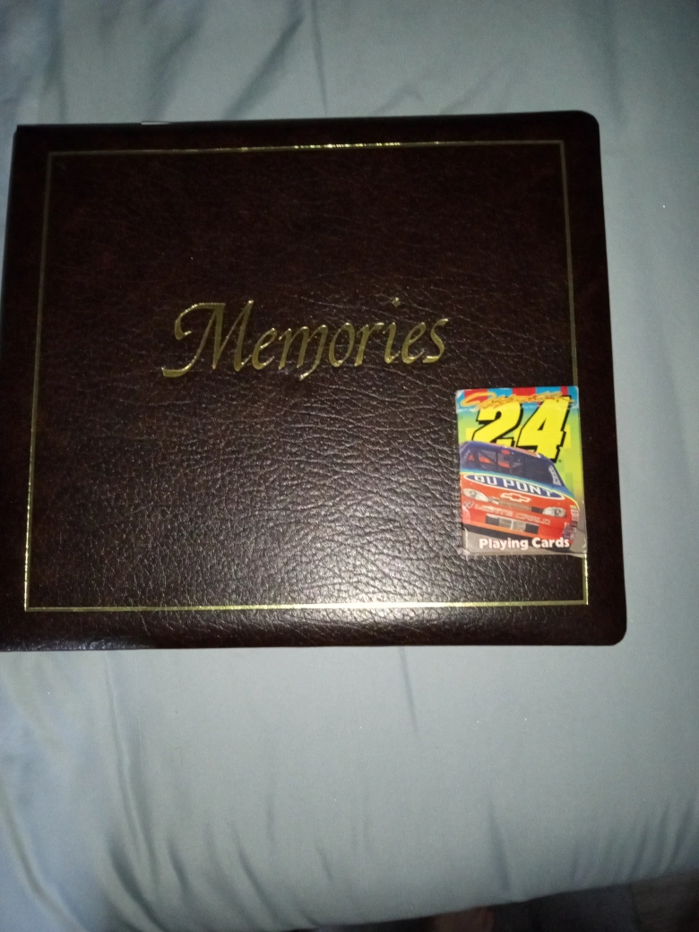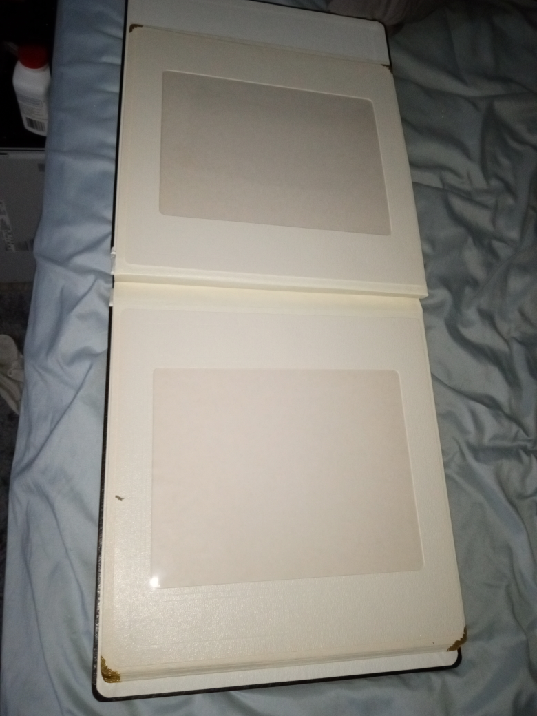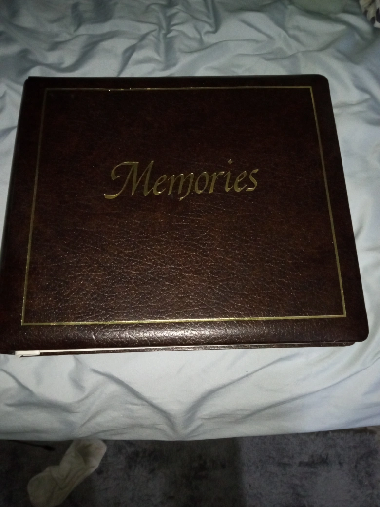 Wedding photo album with a brown leather cover. It has the word "Memories" embossed on the front in gold lettering. Inside, there are pages for photos and sections like "Joined in Holy Matrimony" for wedding memories, as well as spaces for Maid of Honor, Best Man, and other wedding party members. Perfect for keeping your cherished memories safe! only the first page is creased. Easily removed if you like. $20 obo