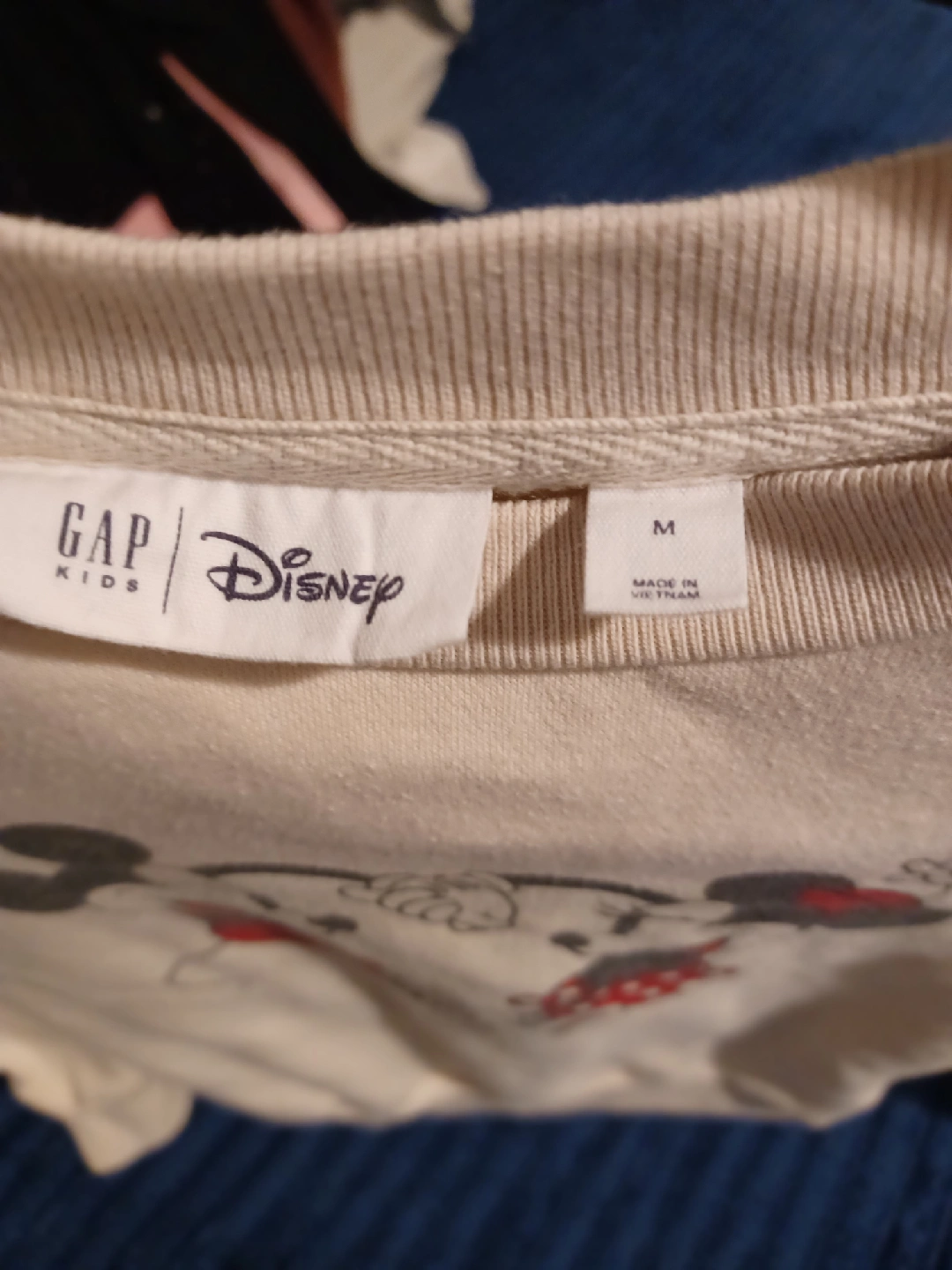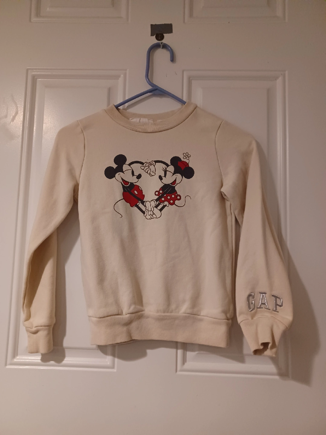 Selling a cute GAP Kids sweatshirt featuring Mickey and Minnie Mouse! It's a size M and in great condition. The color is a soft, off-white. Perfect for any Disney fan!