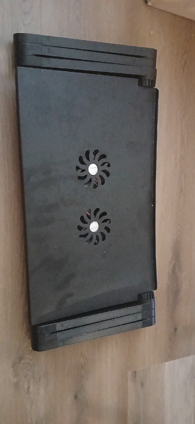 Selling a black adjustable laptop desk. It has built-in cooling fans to keep your laptop from overheating. Perfect for working from home or on the go!