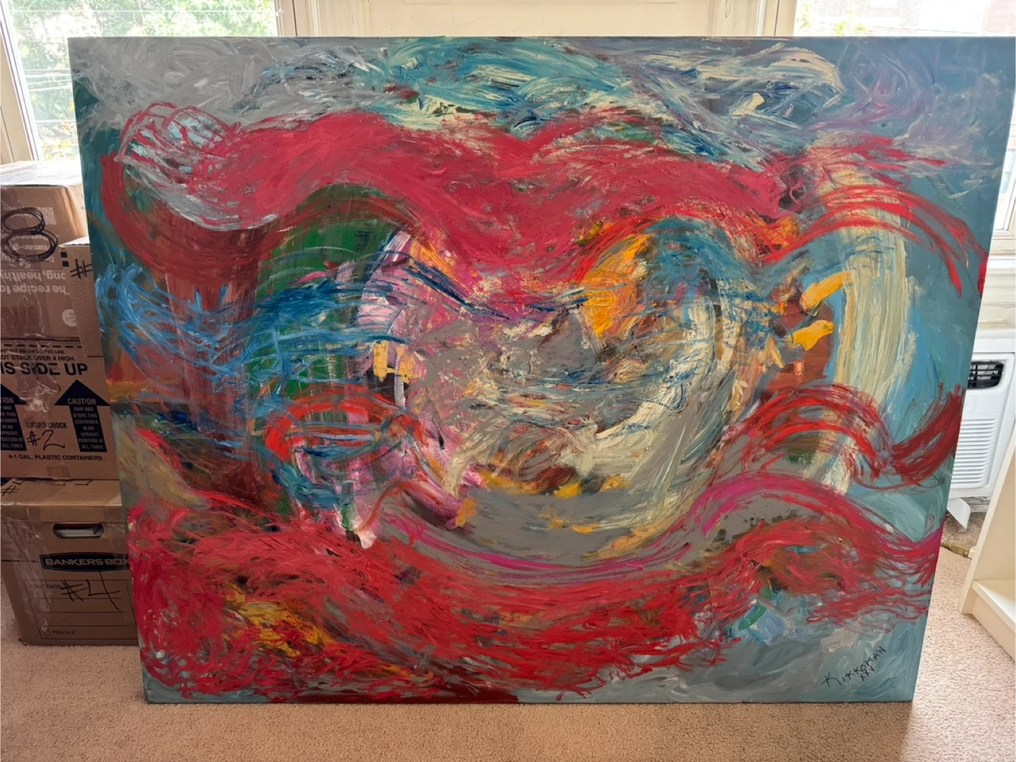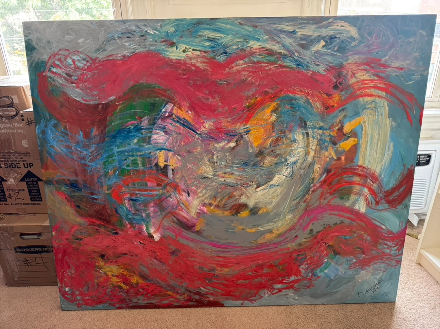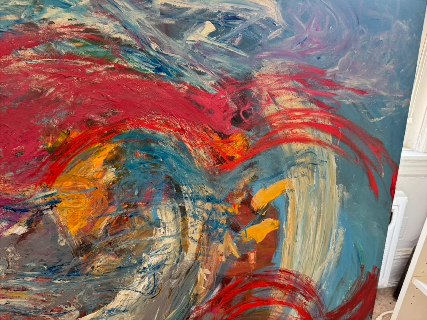 Vibrant colors and bold brush strokes of red, blue, and yellow adding life and color to your home or office.