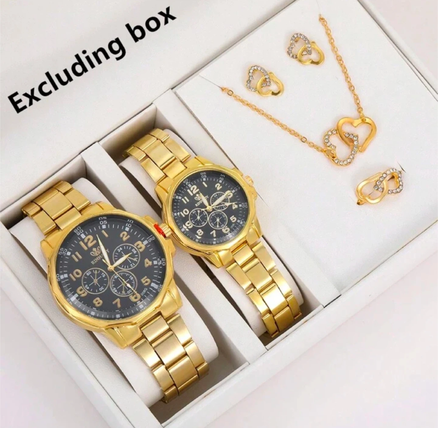 Selling 6 pcs set along with two watches in gold ! These watches come in a box, making them perfect for gifting or keeping for yourself. The watches have a black face with gold numbering. They are in great condition and ready for you!