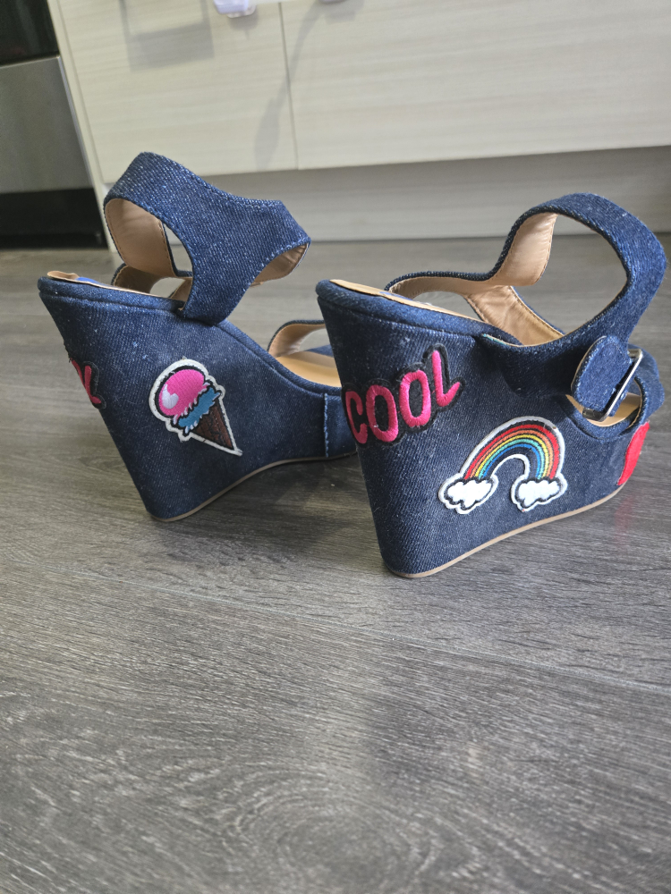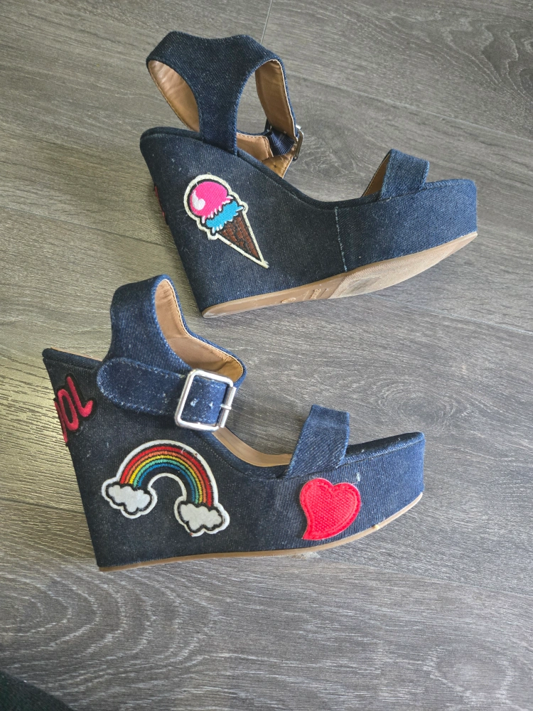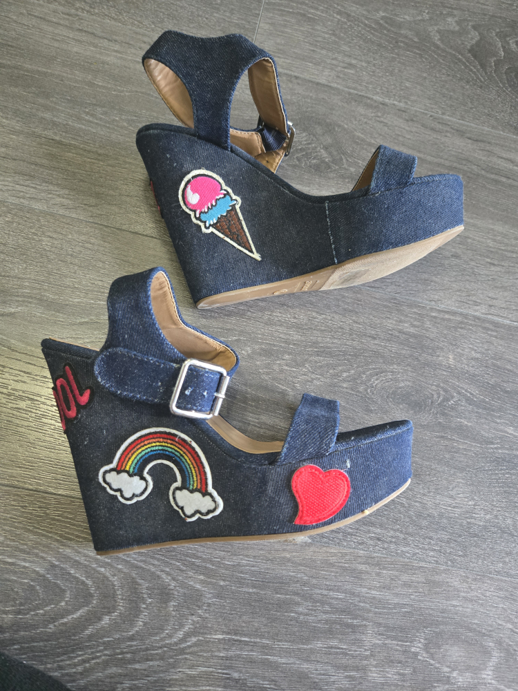 Cute denim wedge sandals in a size 7.5! They feature fun patches like an ice cream cone, rainbow, and heart. Perfect for adding a playful touch to your outfit!
