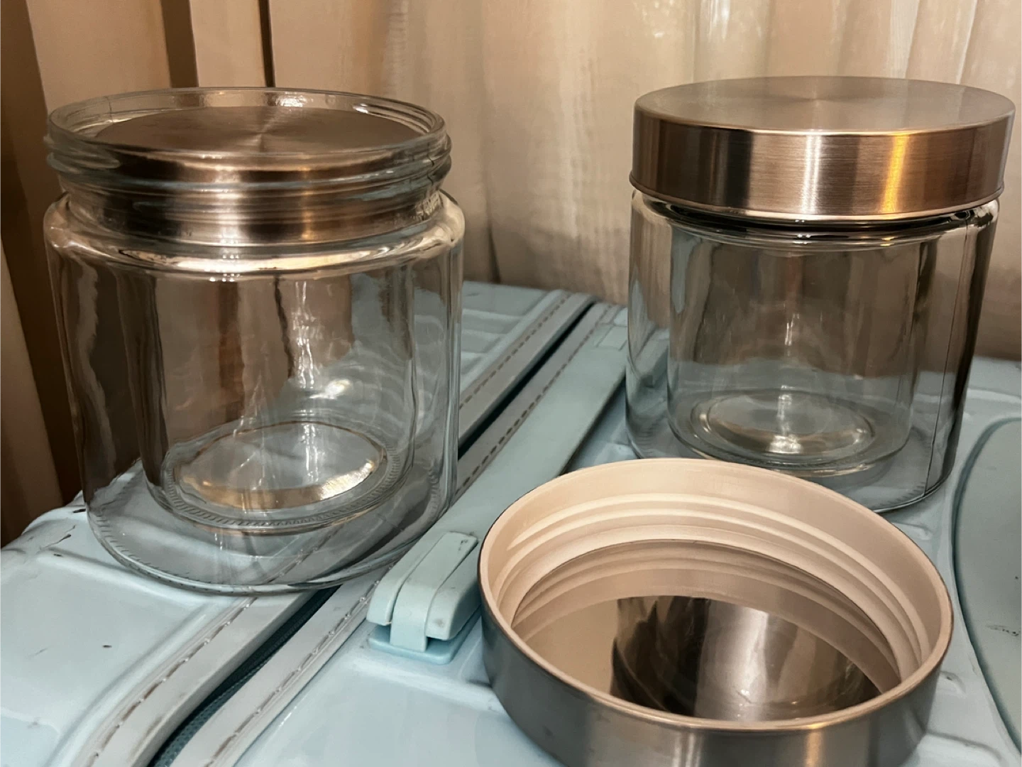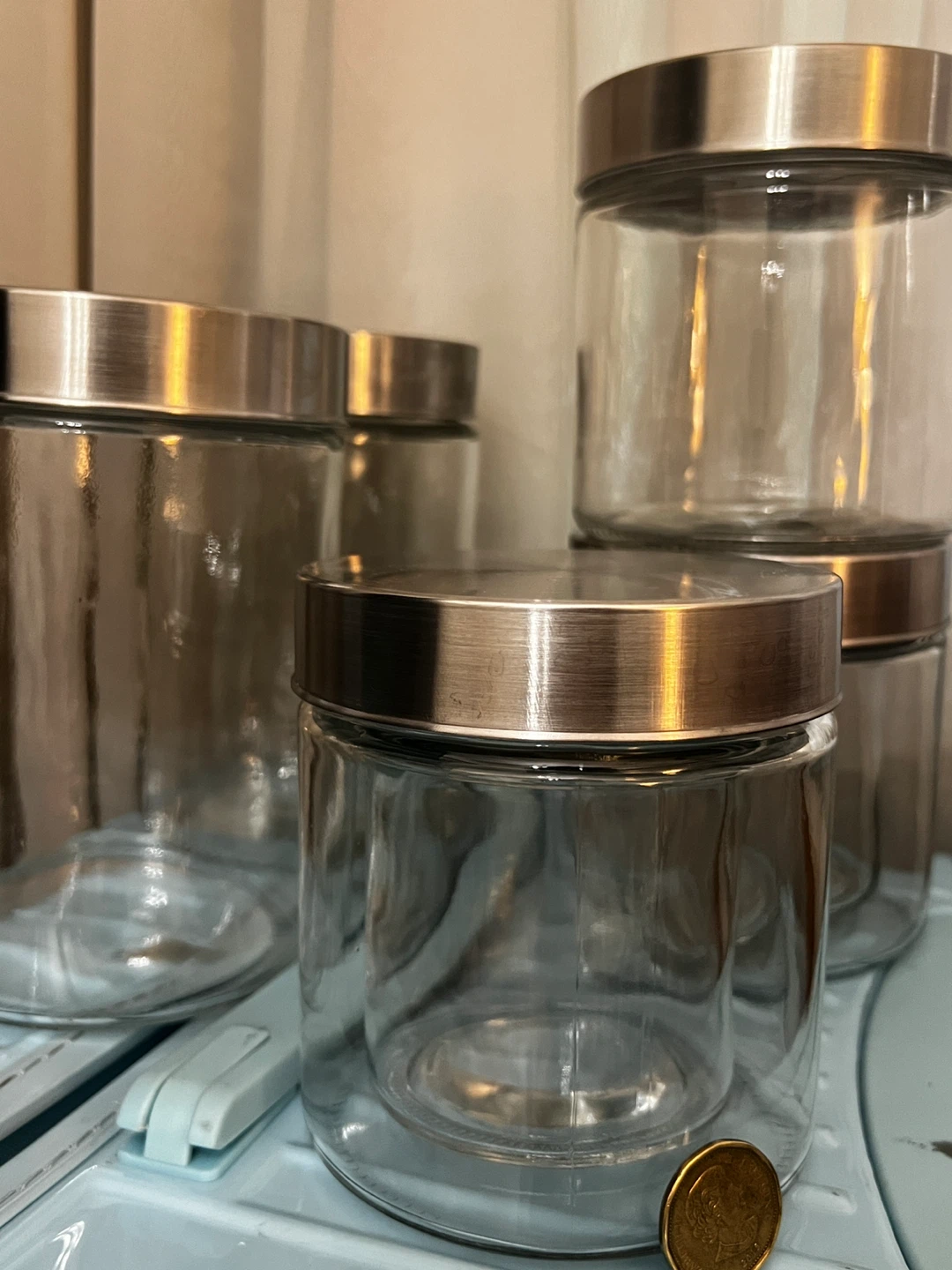 Selling a set of 8 glass jars with brushed metal lids( 2 large, 3 medium , 3 small)