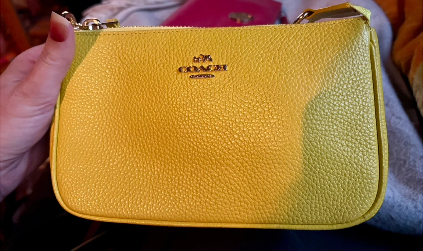 Selling a cute Coach wristlet in a vibrant yellow colour! It's made of textured leather and has a chain detail. Perfect for carrying your essentials when you don't want to bring a big purse! Used once