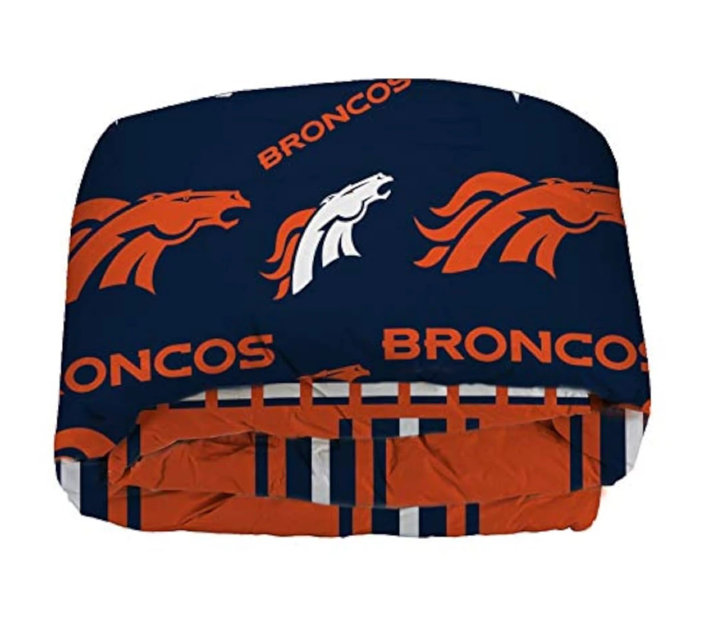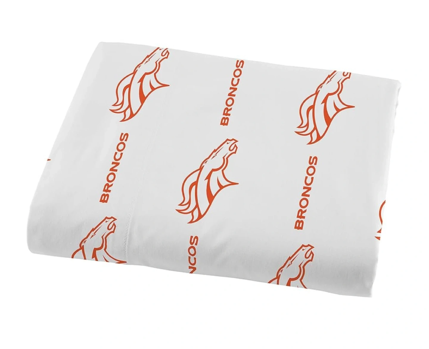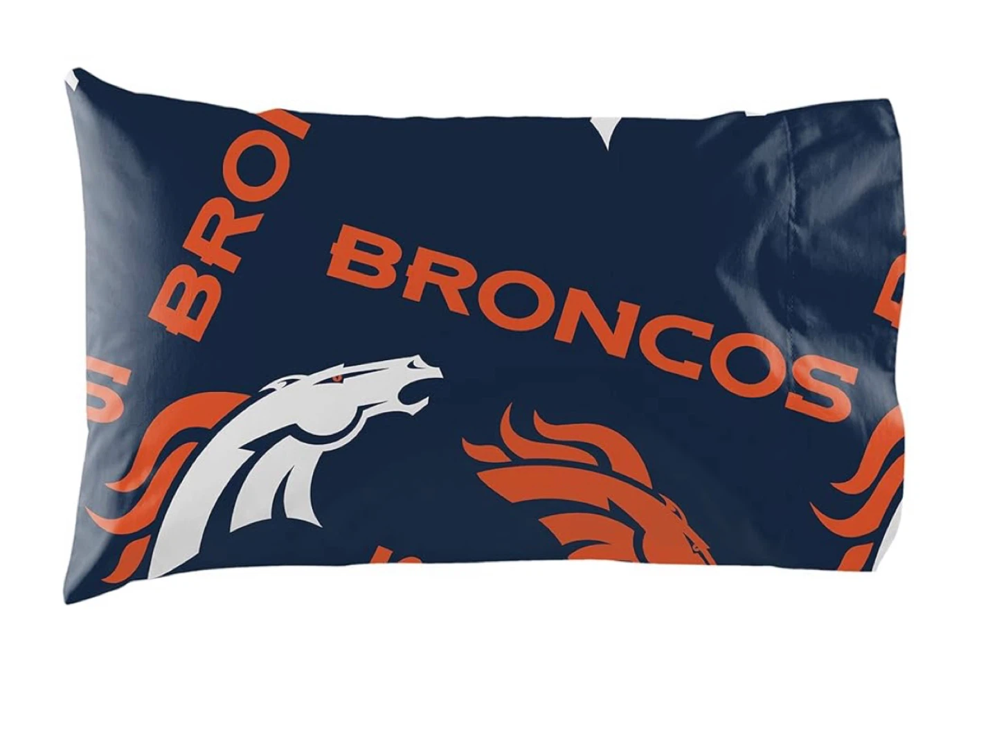 Here's a pillowcase with the Denver Broncos logo and team name printed all over it. It features the team's colors: navy blue and orange, with the Broncos logo in white and orange. Perfect for any Broncos fan!