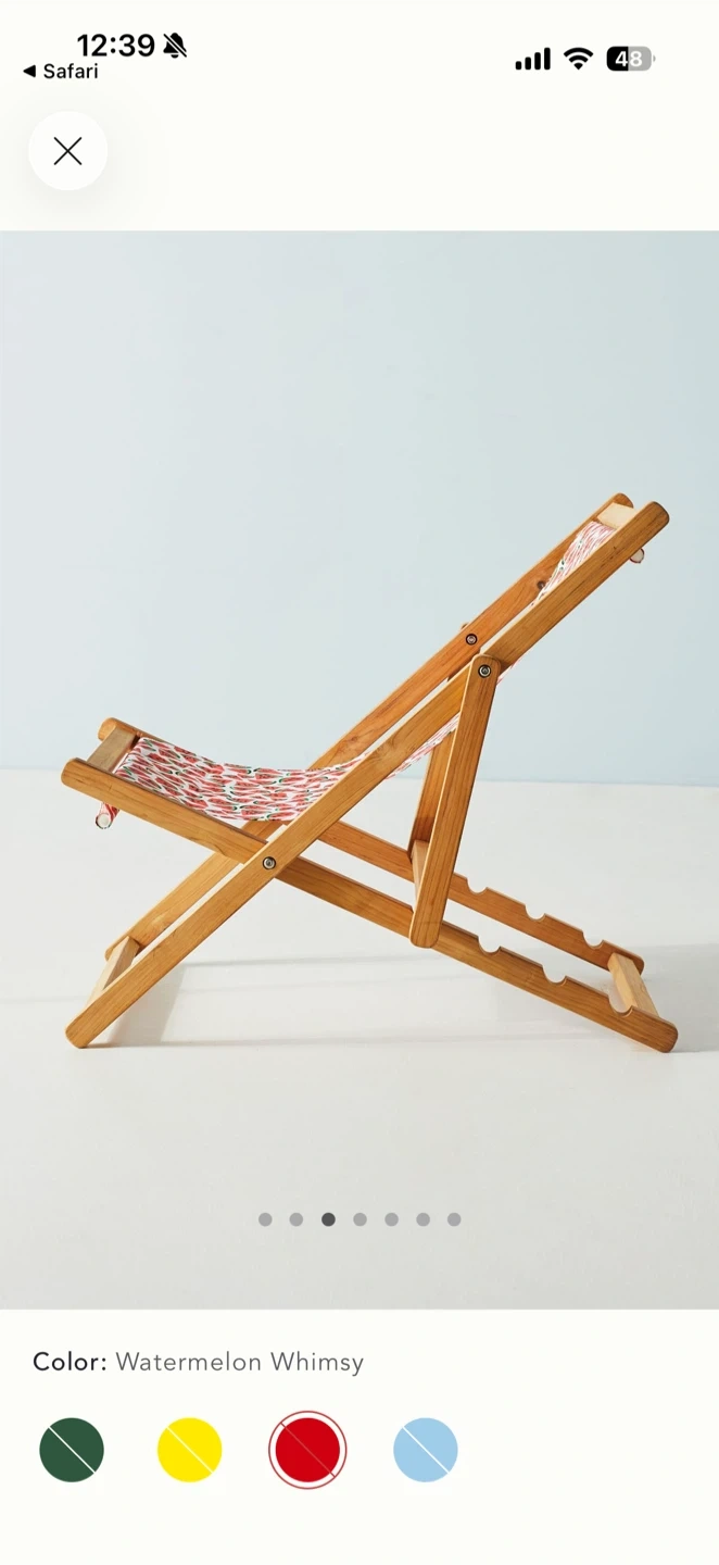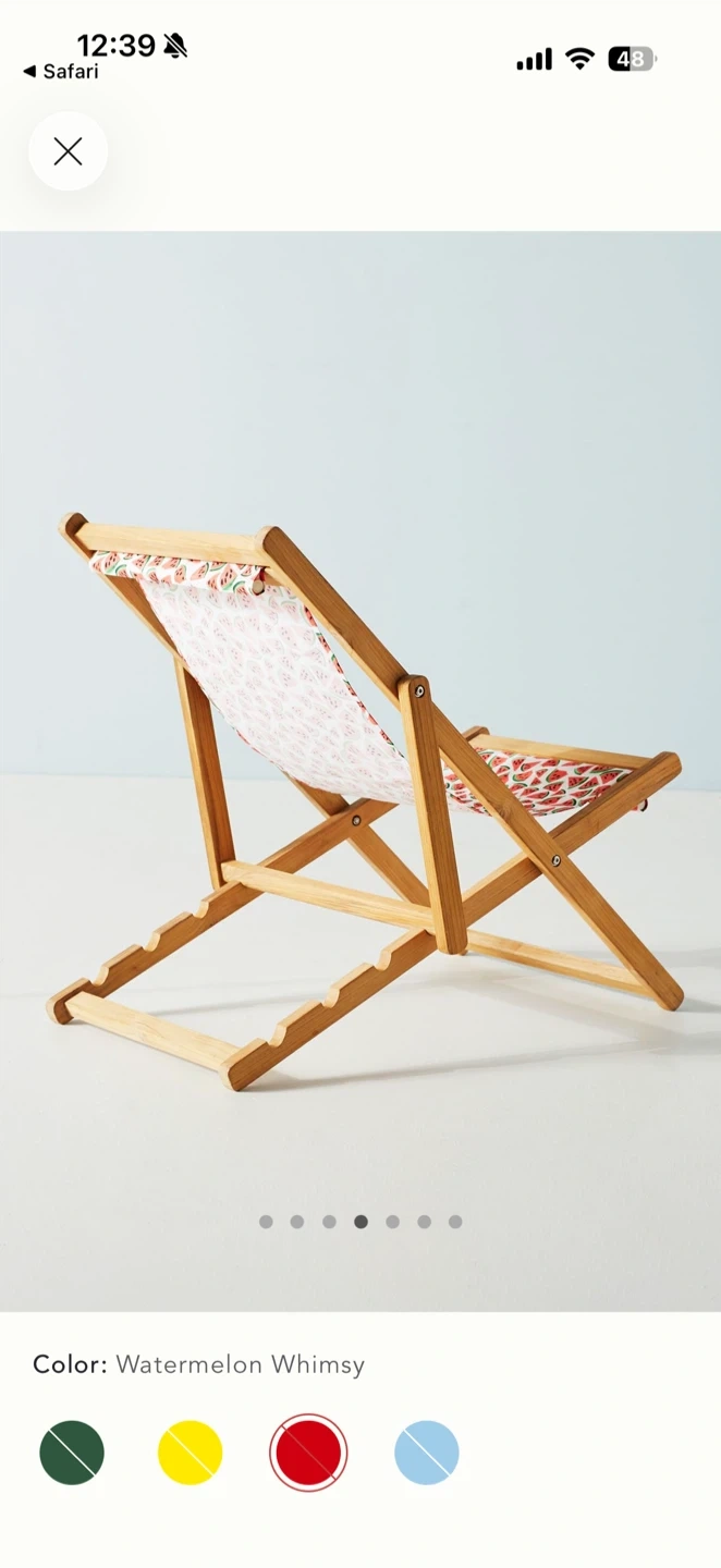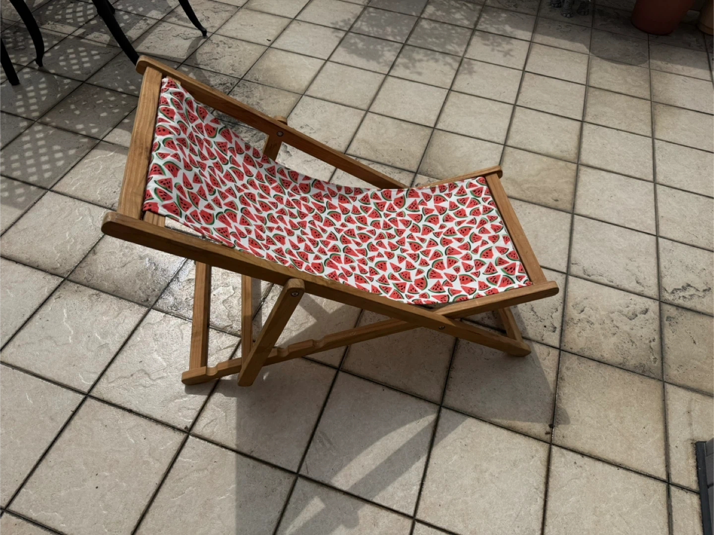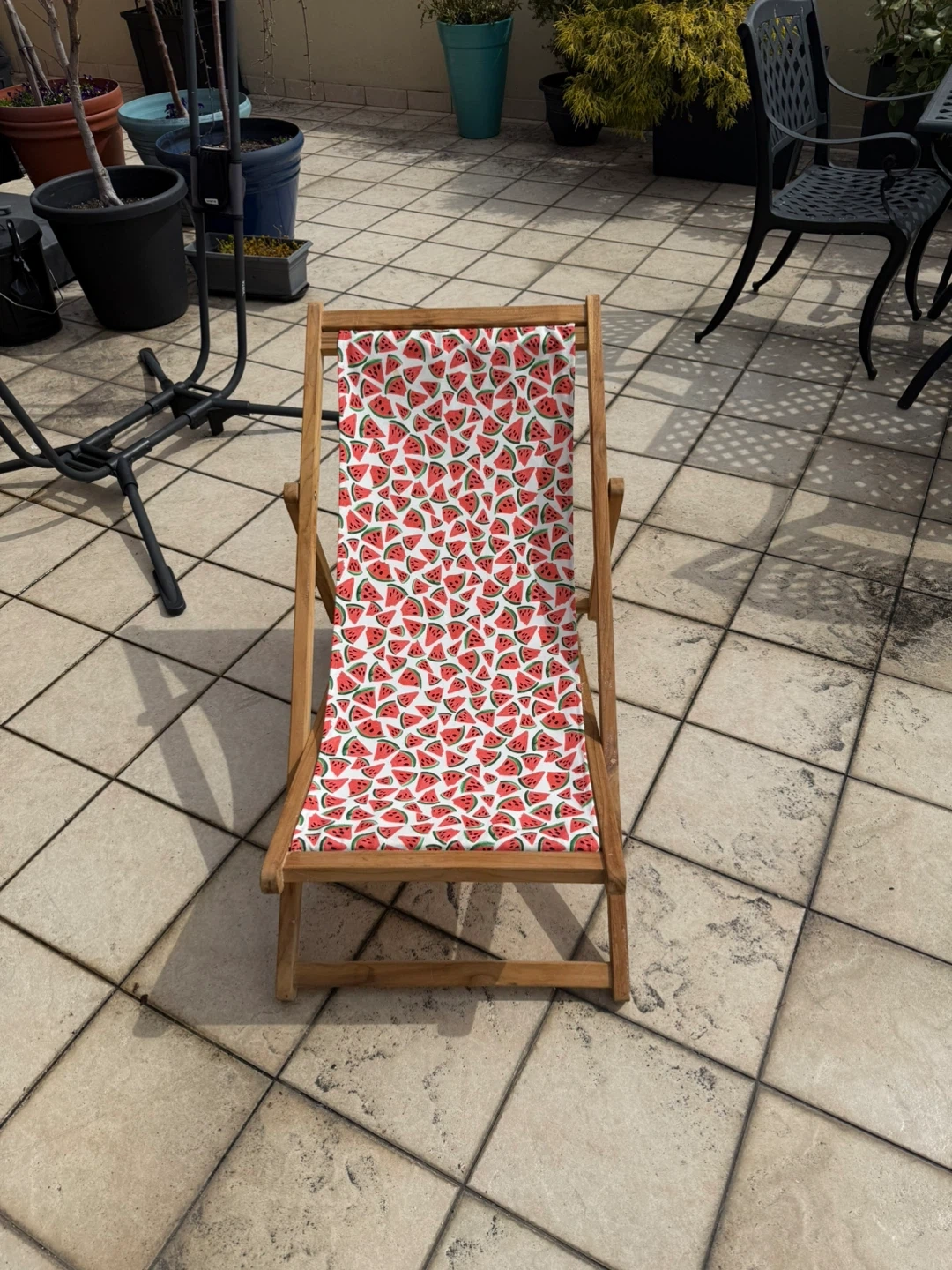This portable wooden deck chair features a fun watermelon print fabric. It's perfect for relaxing outdoors on a patio or deck. The chair is collapsible for easy storage.