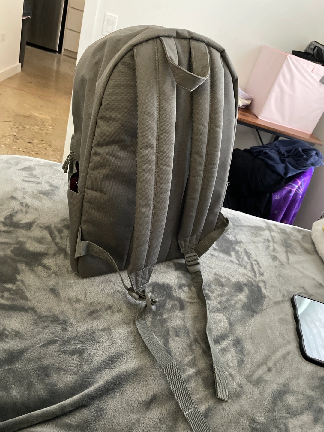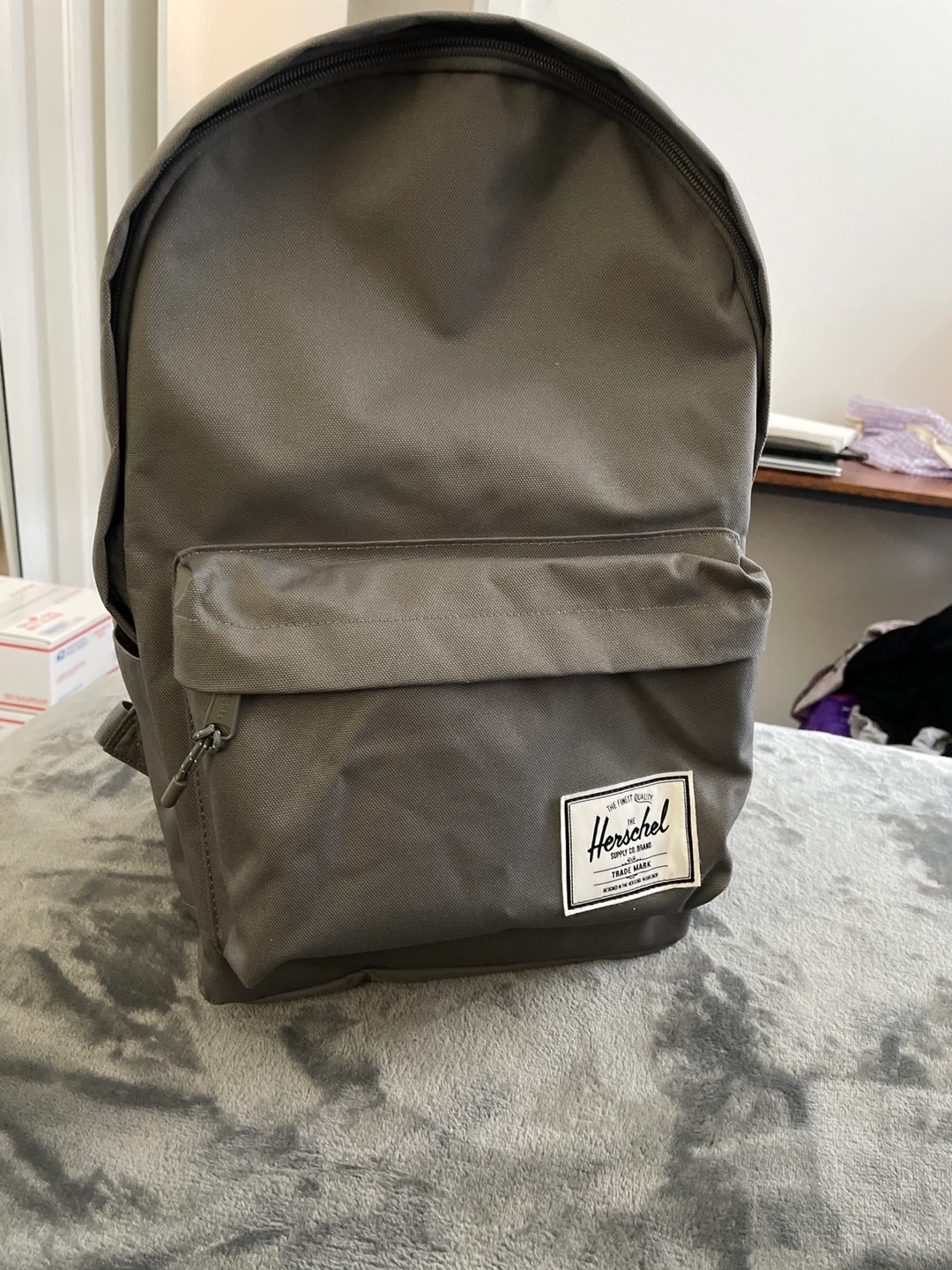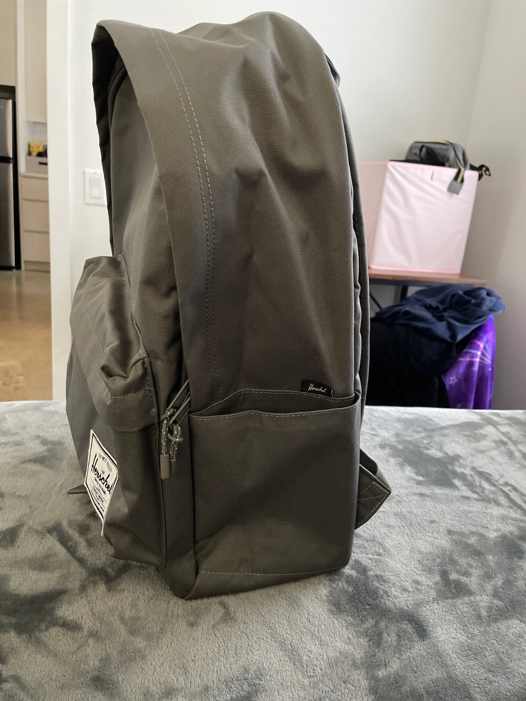 This is a Herschel Backpack in the color - Gargoyle - a medium toned grey. It has a padded laptop pocket and a pocket on each side.