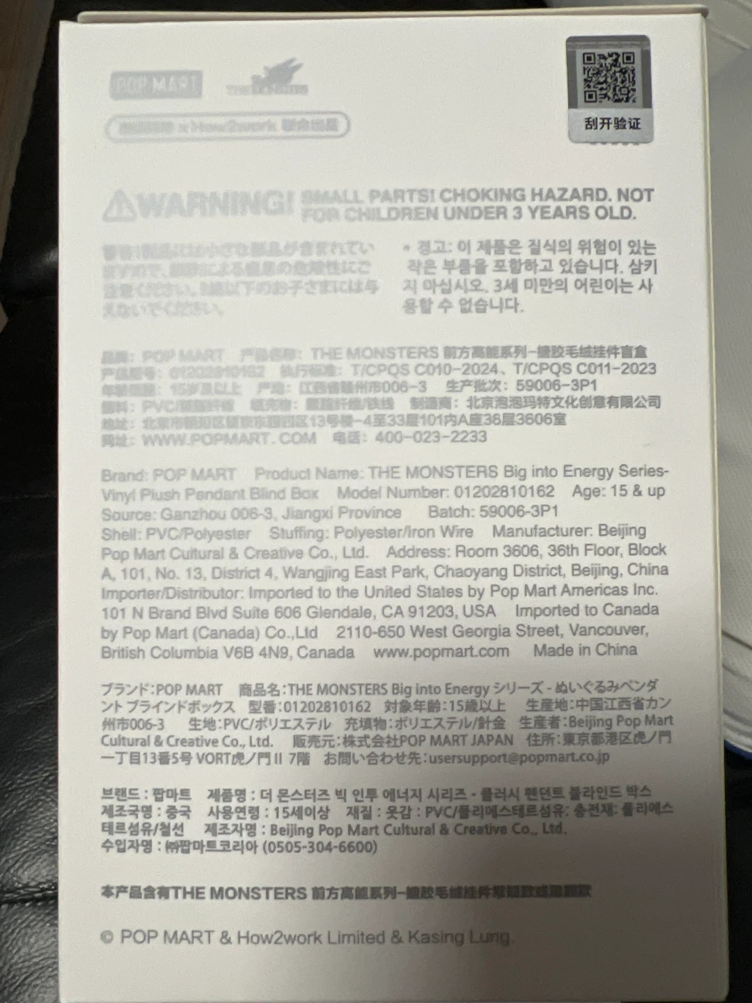 This is a POP MART Big Into Energy vinyl plush pendant blind box. It's part of the 'The Monsters' series. The box contains a collectible vinyl plush pendant.