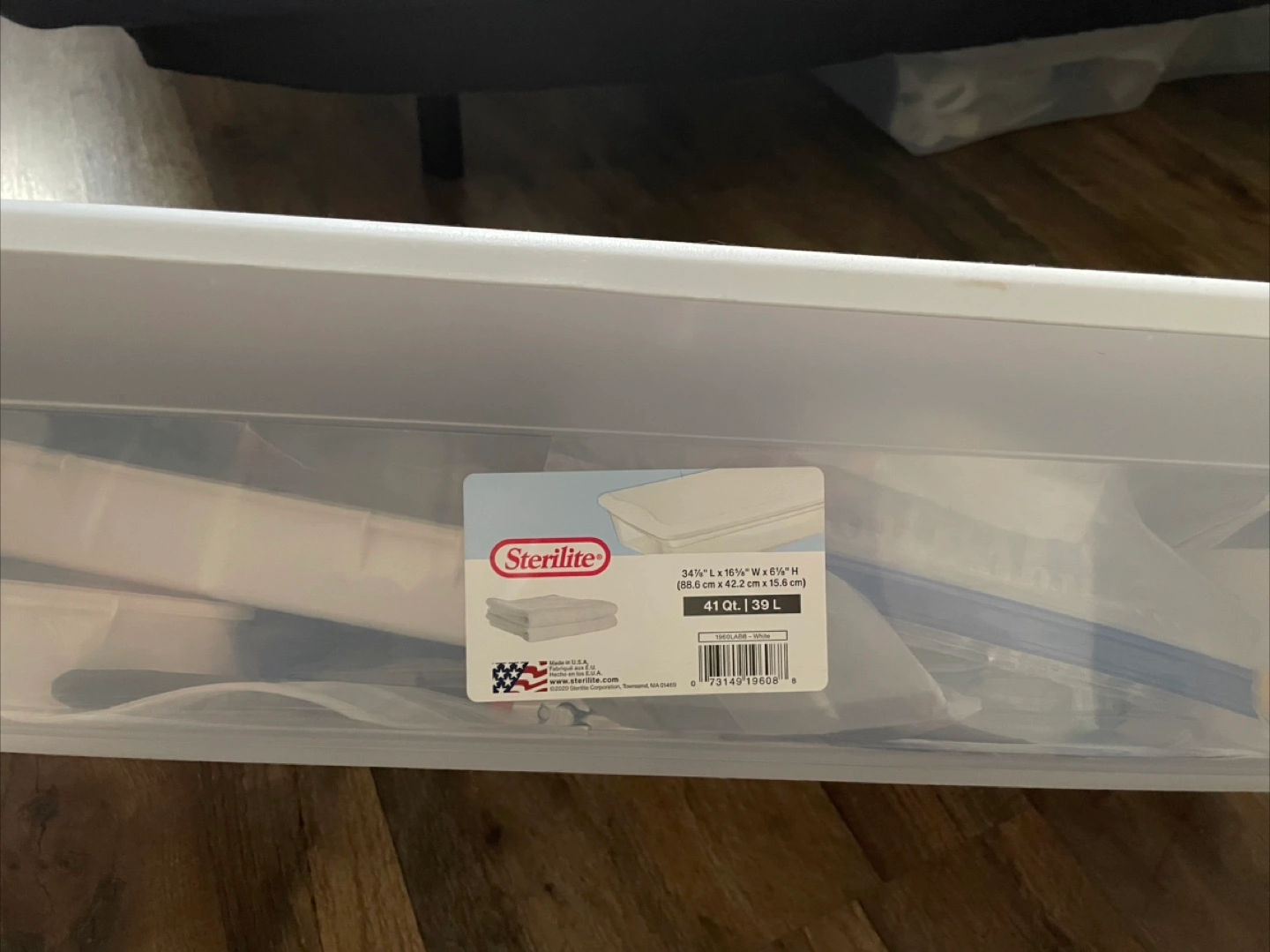 Selling a Sterilite 41 Qt storage box. It measures 34 1/8" L x 16 5/8" W x 6 1/8" H (86.6 cm x 42.2 cm x 15.6 cm). Great for organizing your belongings!