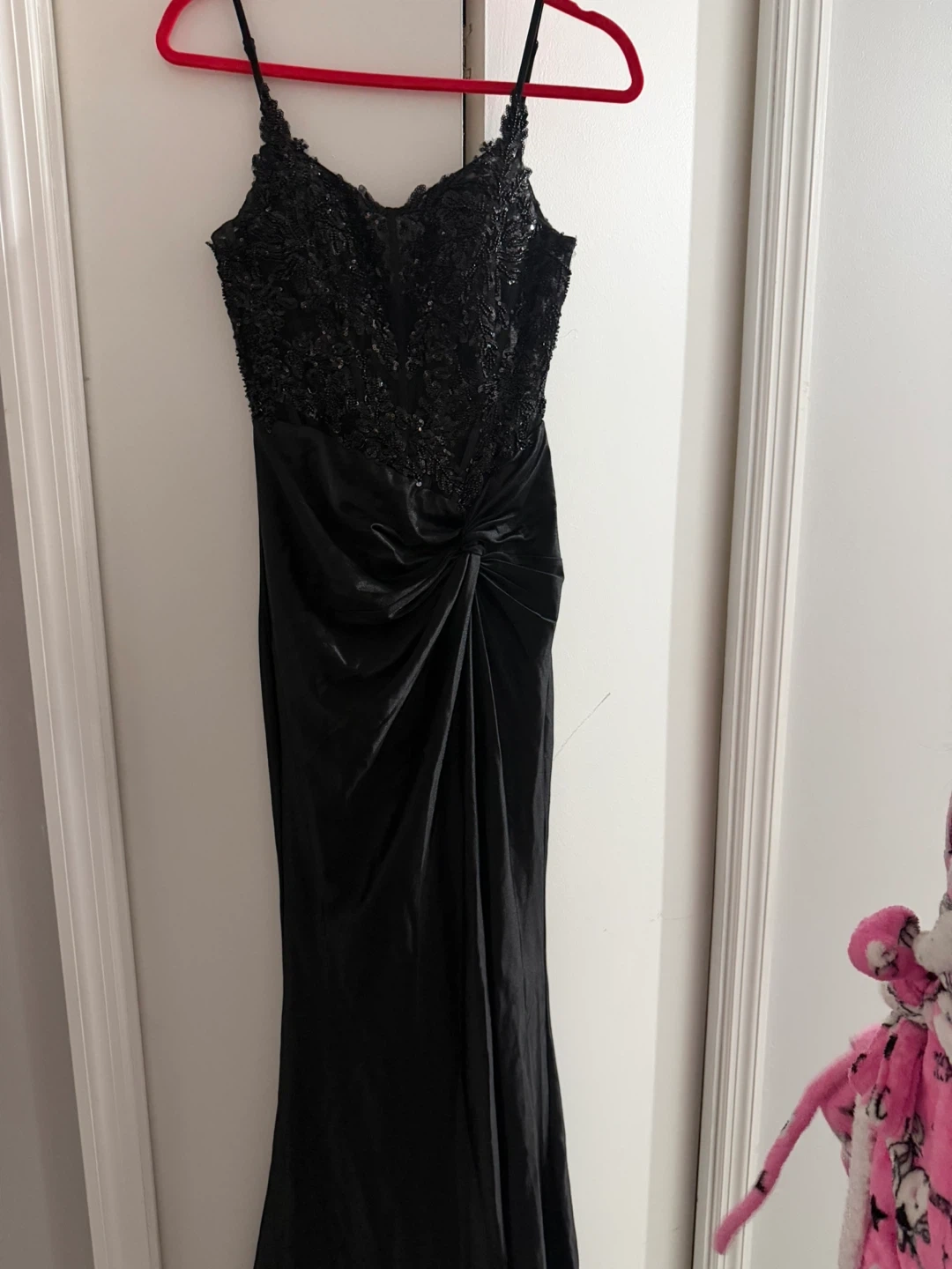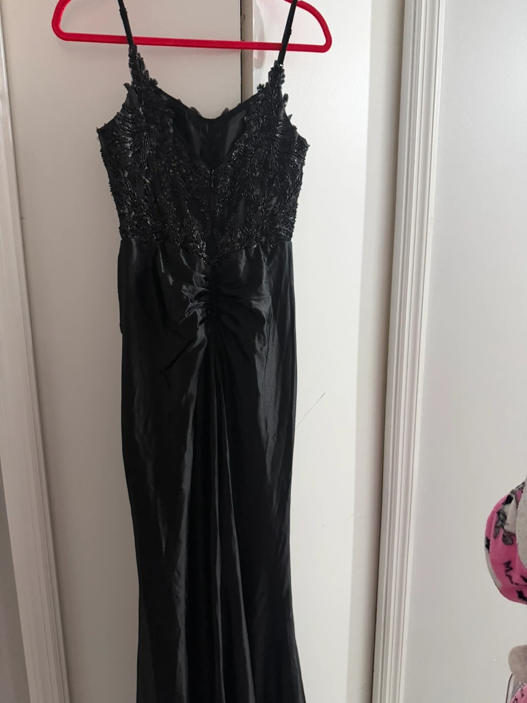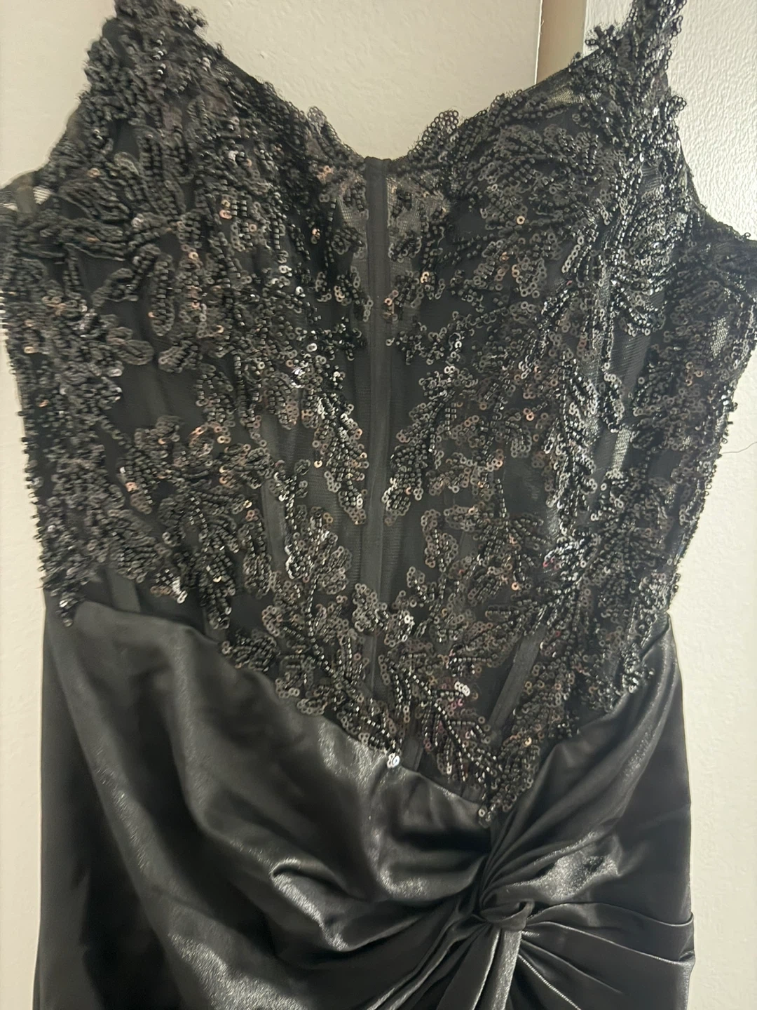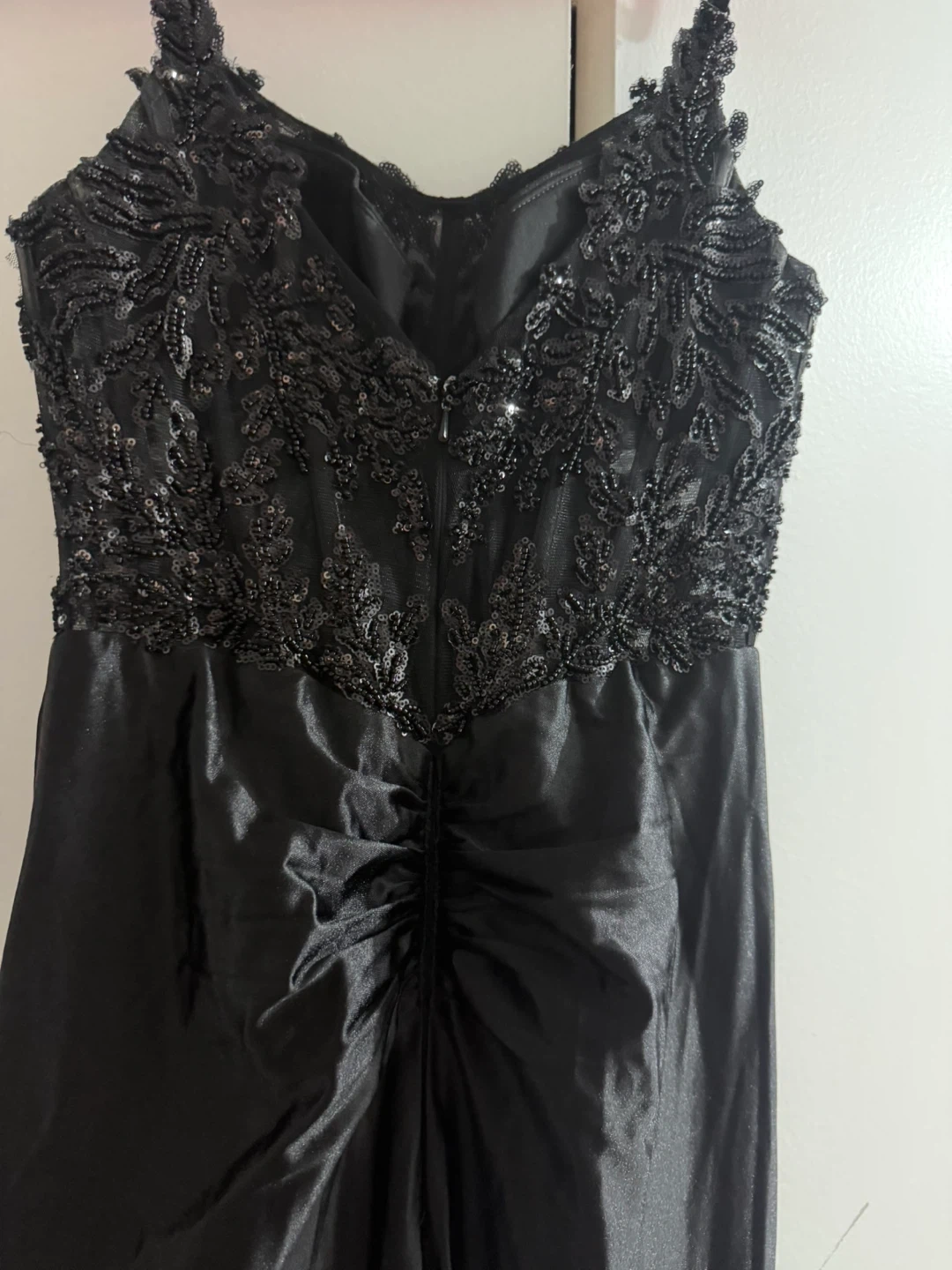 Elegant black evening gown with intricate sequin and lace detailing on the bodice. It features a flattering ruched waist and a high slit skirt. This dress is perfect for formal events and special occasions!