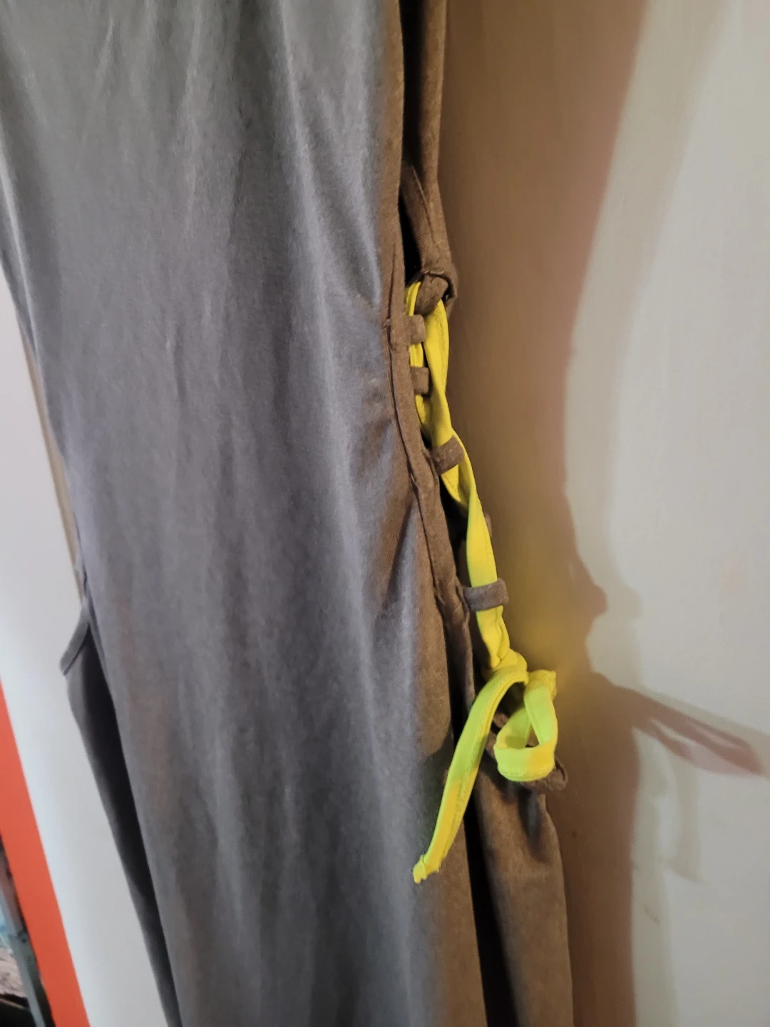 This is a grey sleeveless dress. It has neon green lace-up detailing on both sides. The material is soft and comfortable. It's a fun piece for a casual outing!
