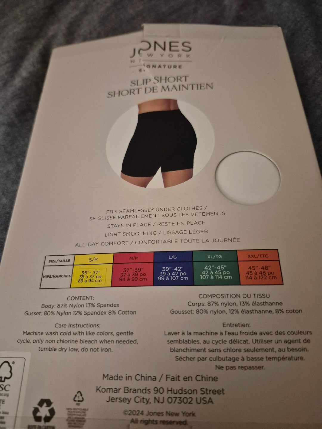 25Selling a 2-pack of Jones New York slip shorts! They are black and size L/G. These shorts are designed to fit seamlessly under clothes and provide light smoothing for all-day comfort. The material is 87% nylon and 13% spandex, with an 80% nylon, 12% spandex, and 8% cotton gusset.