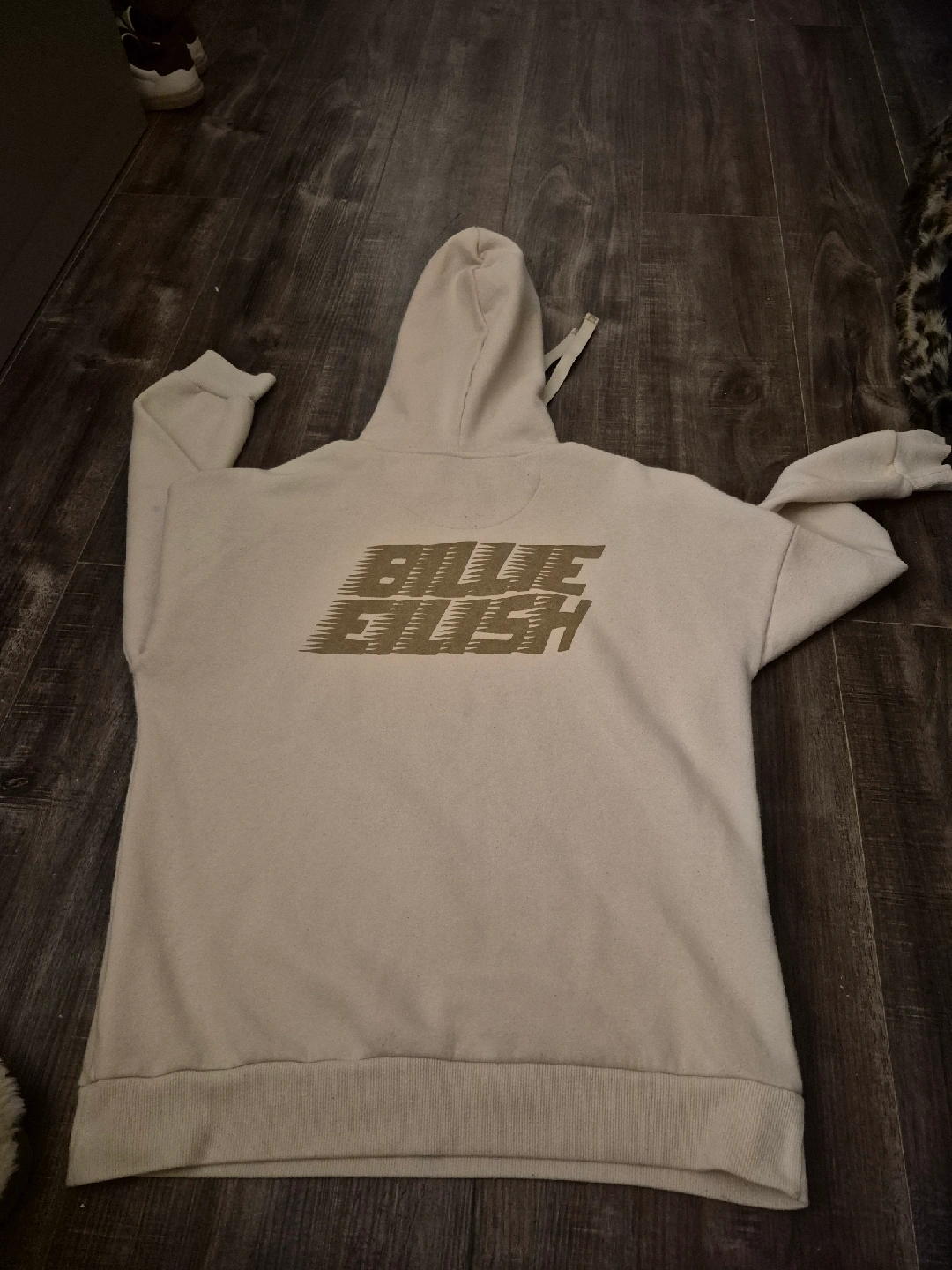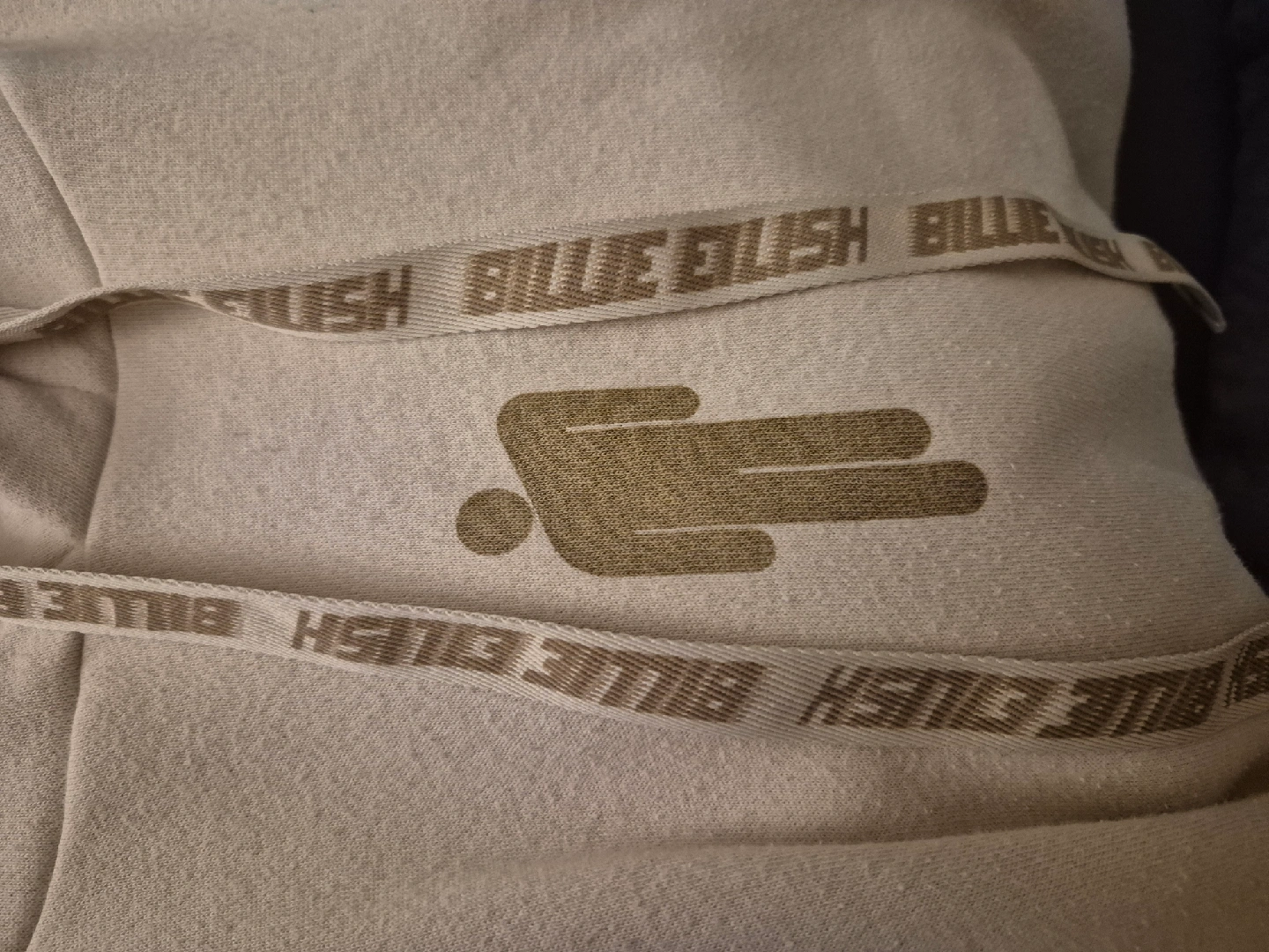 25Cozy Billie Eilish hoodie in a neutral beige colour. Features the Billie Eilish logo on the front and back. Perfect for any fan! i love this hoodie but its i have it in the wrong size.