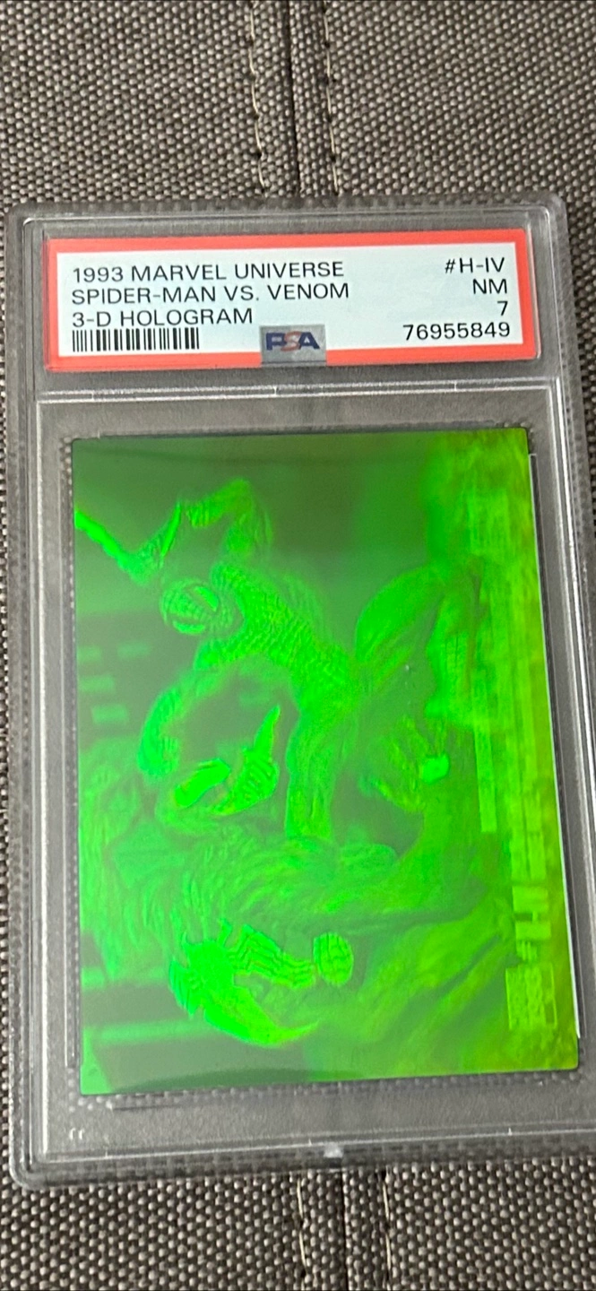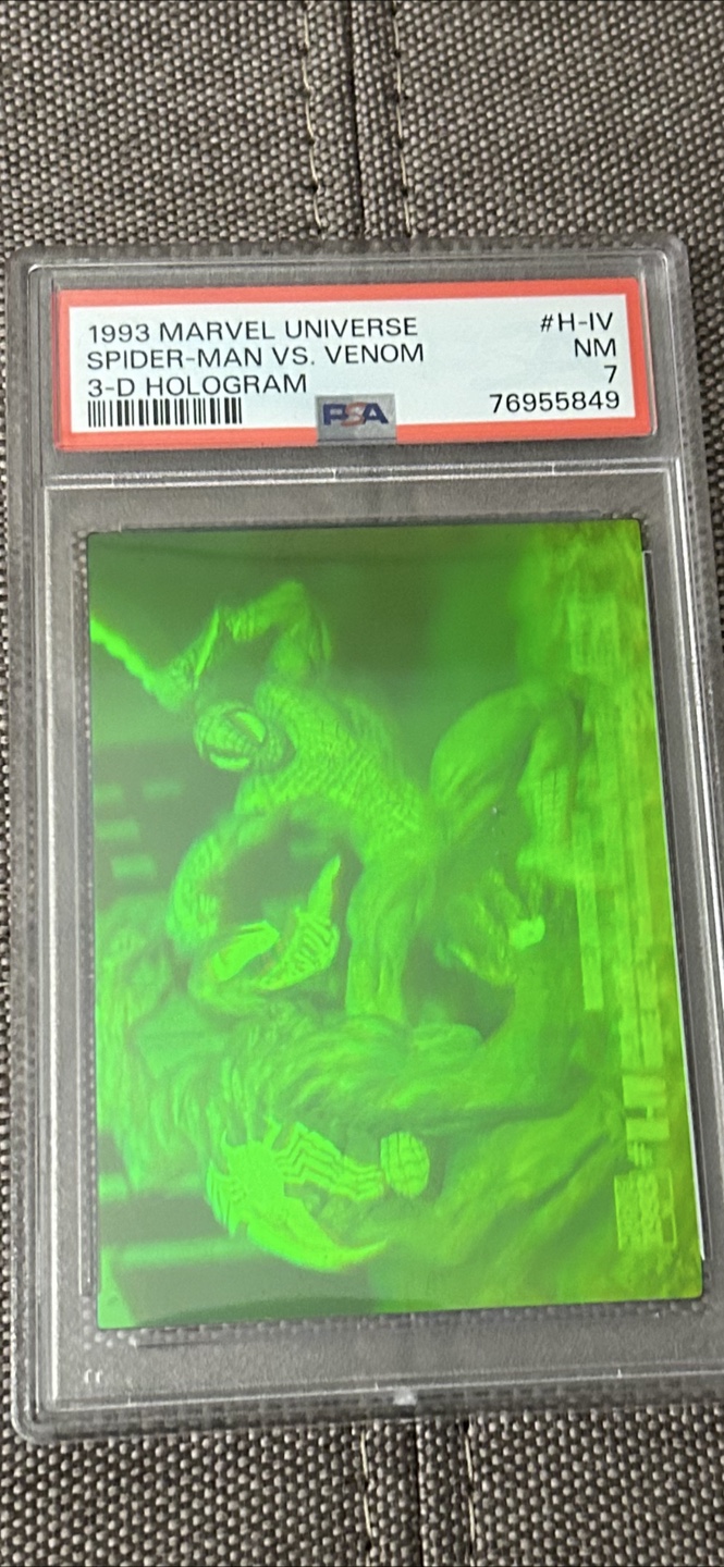 Selling a 1993 Marvel Universe Spider-Man vs. Venom 3-D Hologram trading card. It has been graded NM 7 by PSA. A great addition to any Marvel collection!
