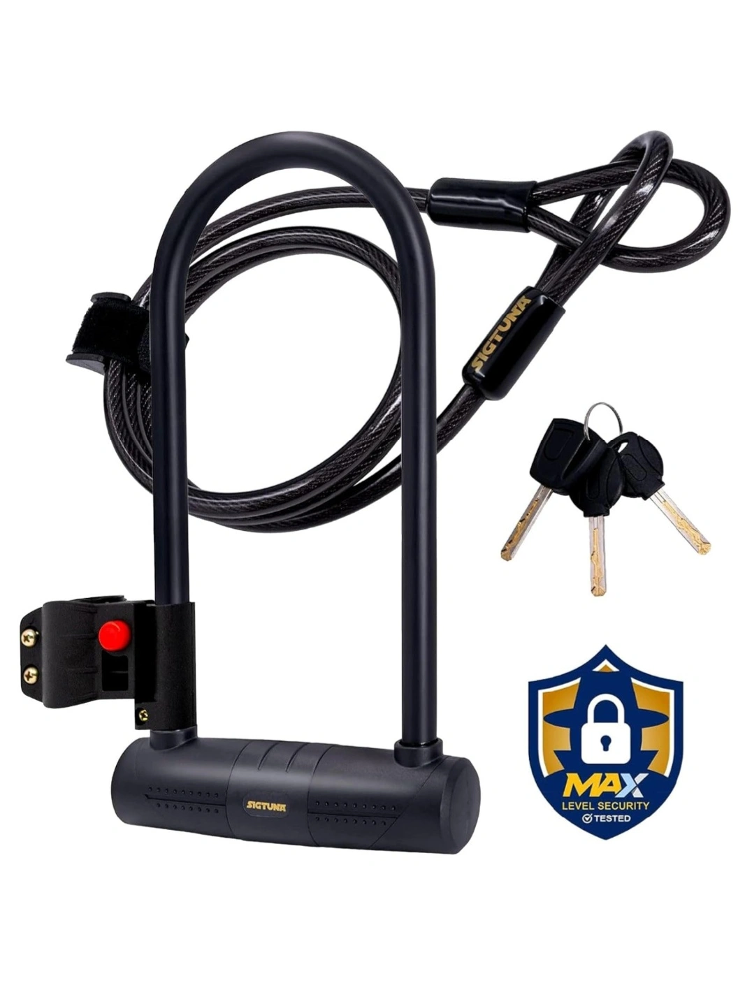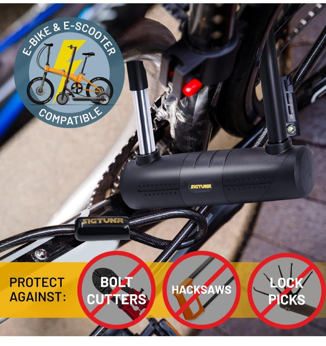 Keep your bike safe with this SIGTUNA U-lock! It comes with a braided steel cable for extra security. The lock features 16mm double deadbolts made of hardened ABS steel. It's also compatible with e-bikes and e-scooters, protecting against bolt cutters, hacksaws, and lock picks