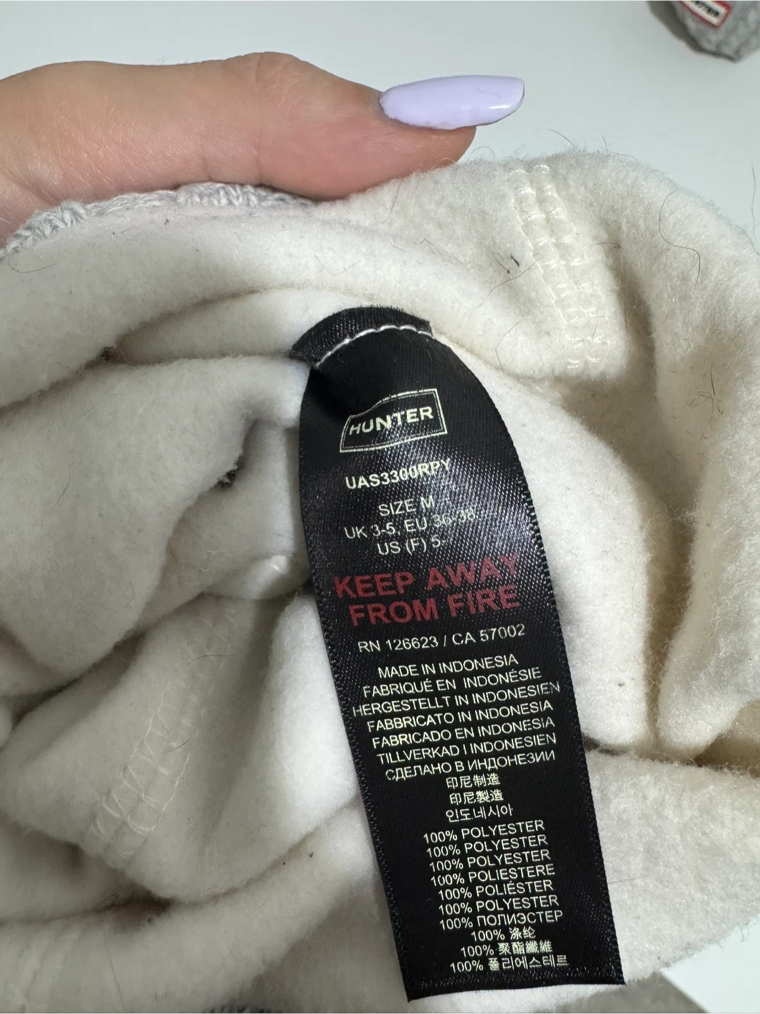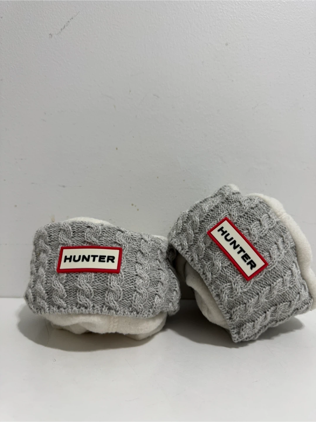 Cozy up your Hunter boots with these grey cable knit boot socks! They're a size M, which fits a US size 5. The outer layer is made of a stylish cable knit, and the inner layer is super soft and warm, made of 100% polyester