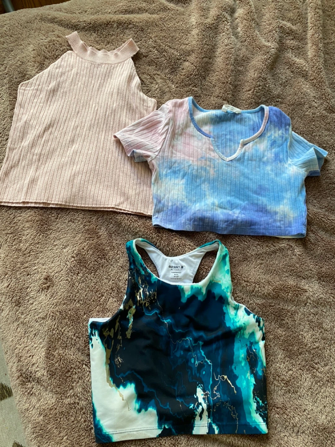 Selling a bundle of girls' tops. Includes a Zara pink ribbed top (size 8- 9), a Shein tie-dye top (size 9/134), and an Old Navy active top (size M). All in good condition and ready for a new home!