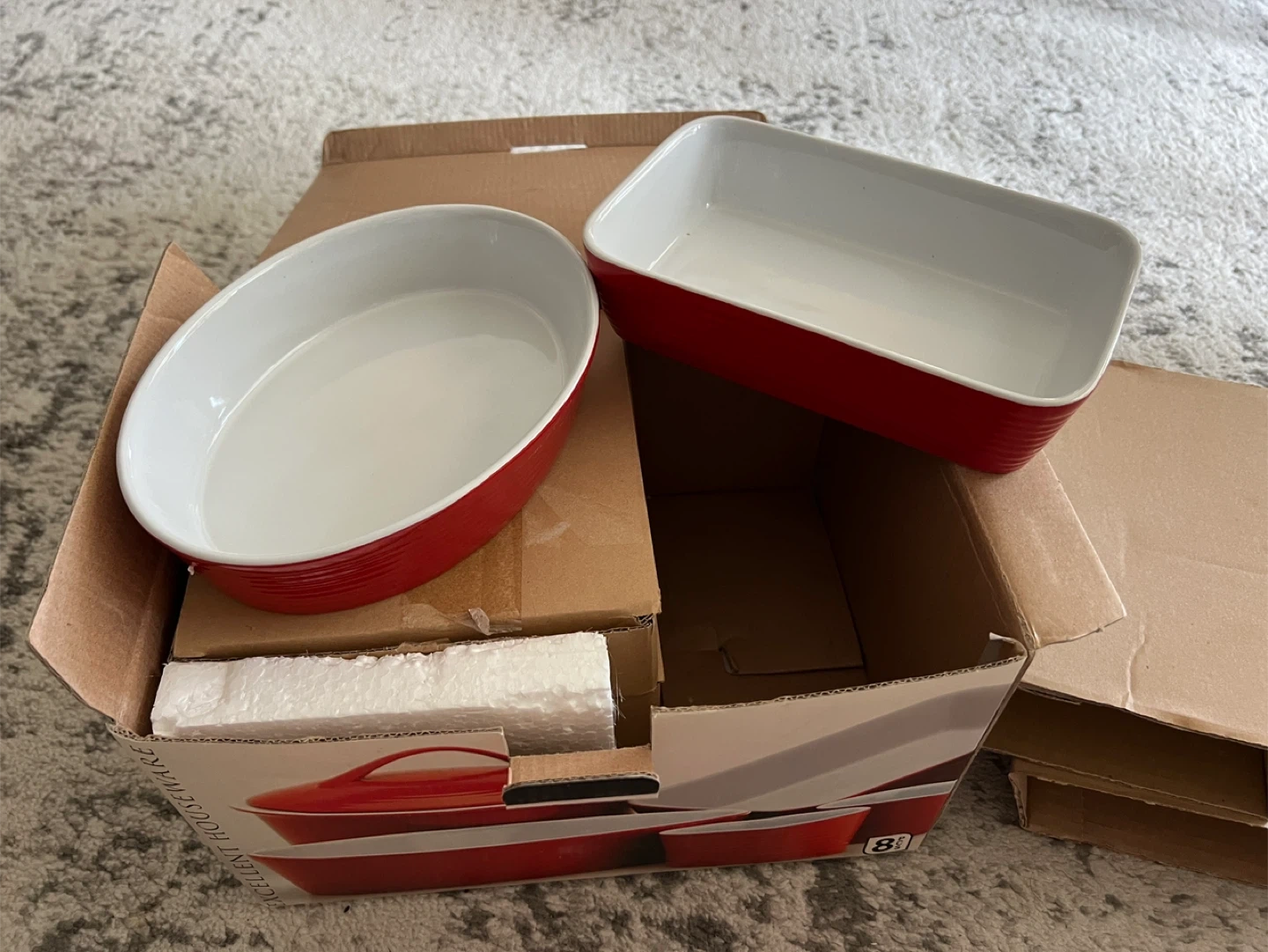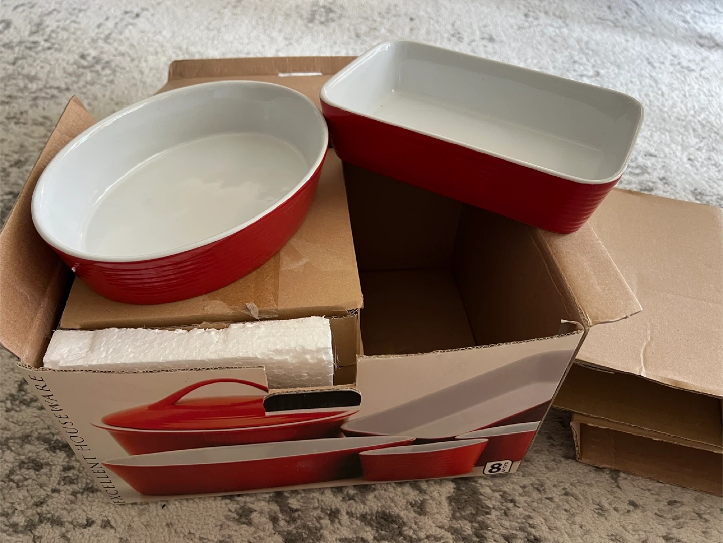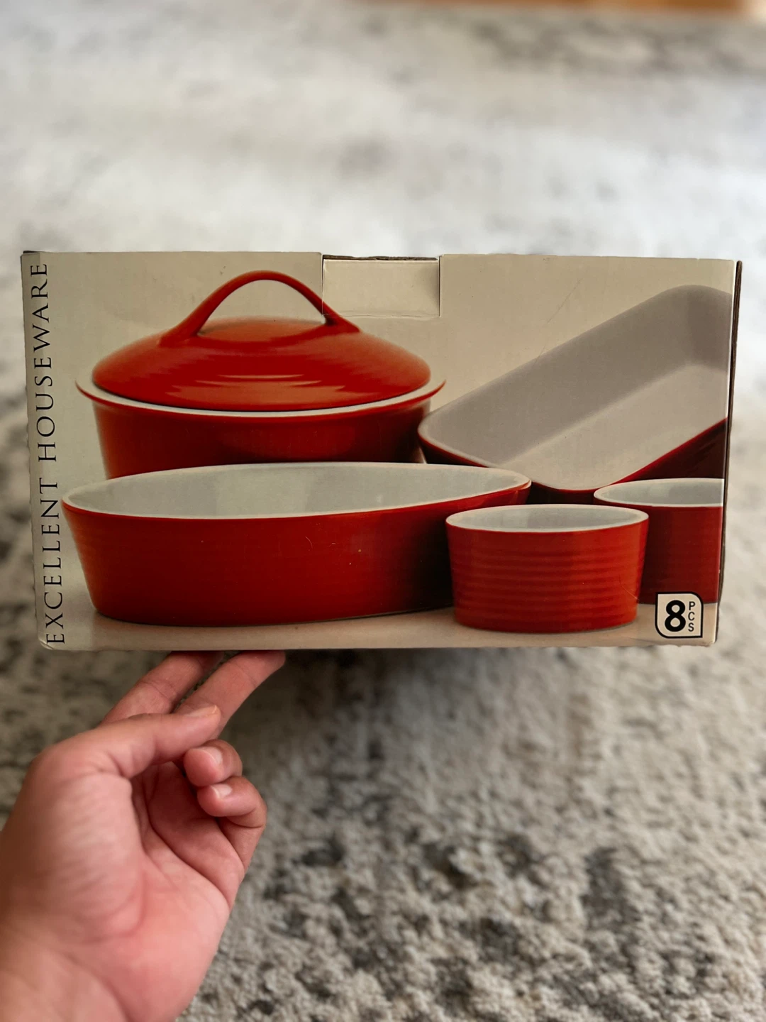 Selling a brand new, in-box Excellent Houseware 8-piece baking set! This set includes various red baking dishes, perfect for all your cooking needs. The set is complete and ready to use, making it a great addition to any kitchen. Never used, brand new in original packaging