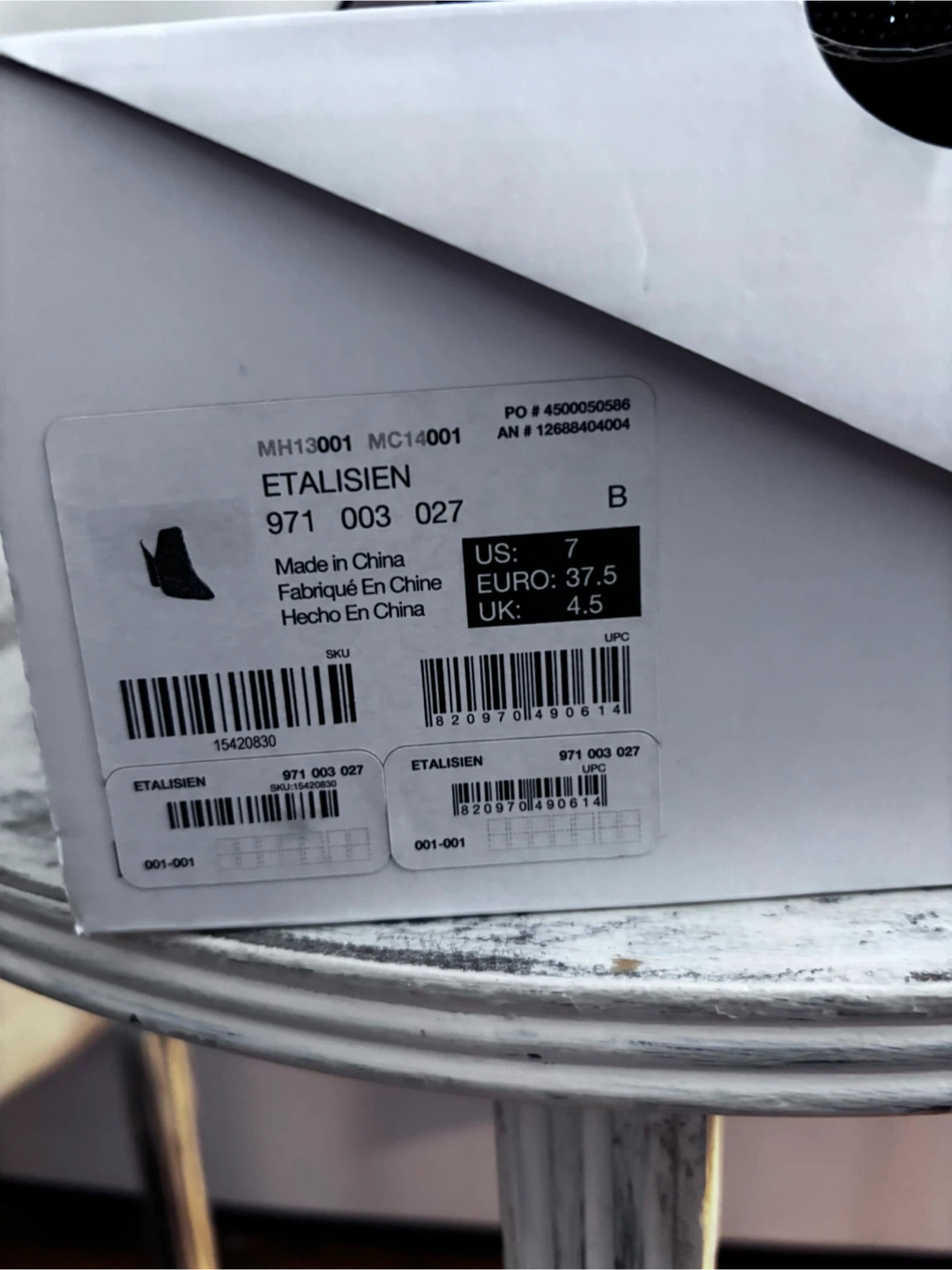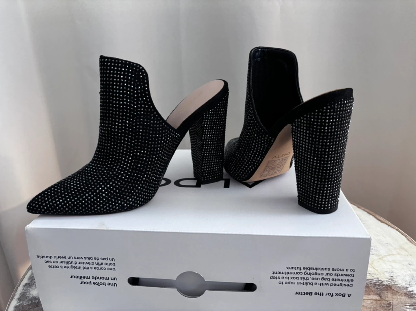These are a pair of Aldo Etalisien mules in size 7. They are black and feature rhinestone embellishments. The shoes come with the original box