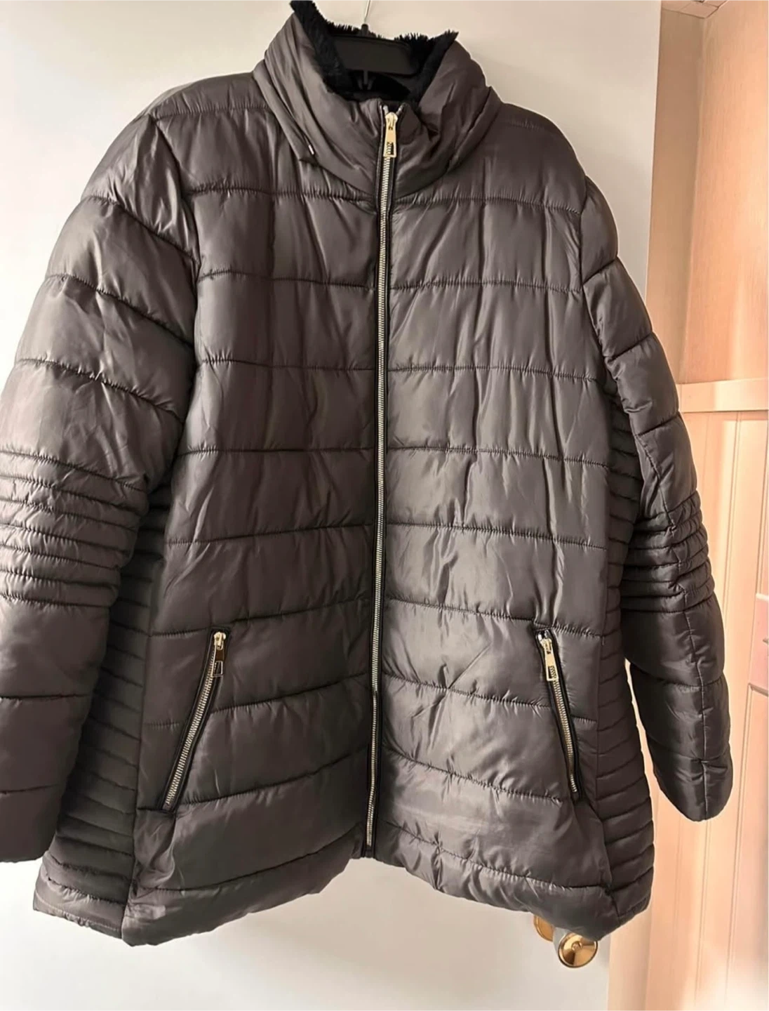 Winter jacket. Like new. Worn only a few times. Warm and comfortable. Copper-grey colour. Sfpfh. Has removable hood. YMI brand. Tag says 3x but fits like a 1x. $25. Firm price. Cash only. Please don’t ask for discounts. Originally purchased at Winners for $100 last season. Porch pick up near Glen Erin and the Collegeway. Mississauga west.