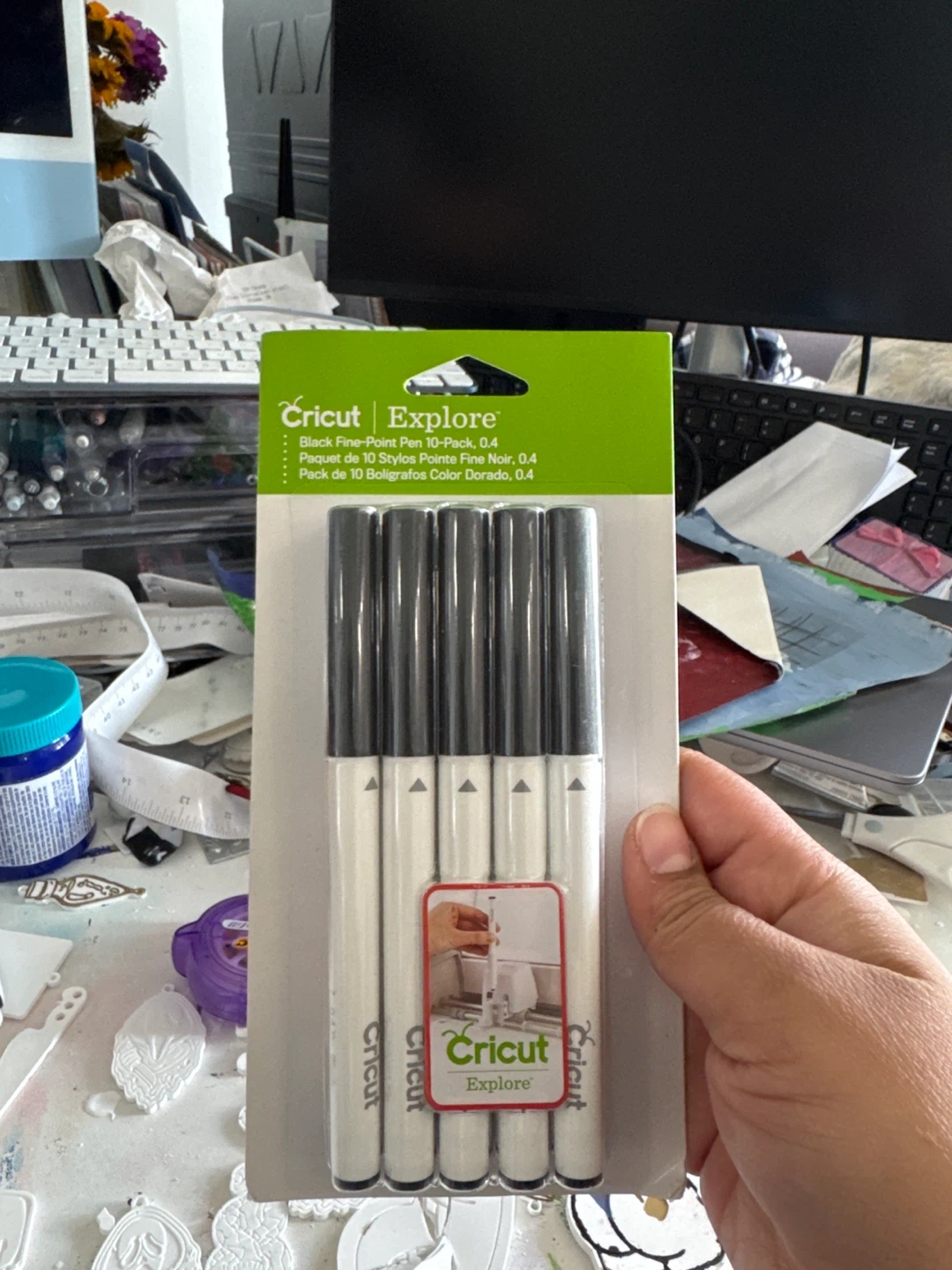 I'm selling a brand new 10-pack of Cricut Explore Black Fine Point Pens! These are perfect for all your crafting needs. Each pen has a 0.4 tip for precise lines and details. Get creative with this pack of 10 fine-point pens!