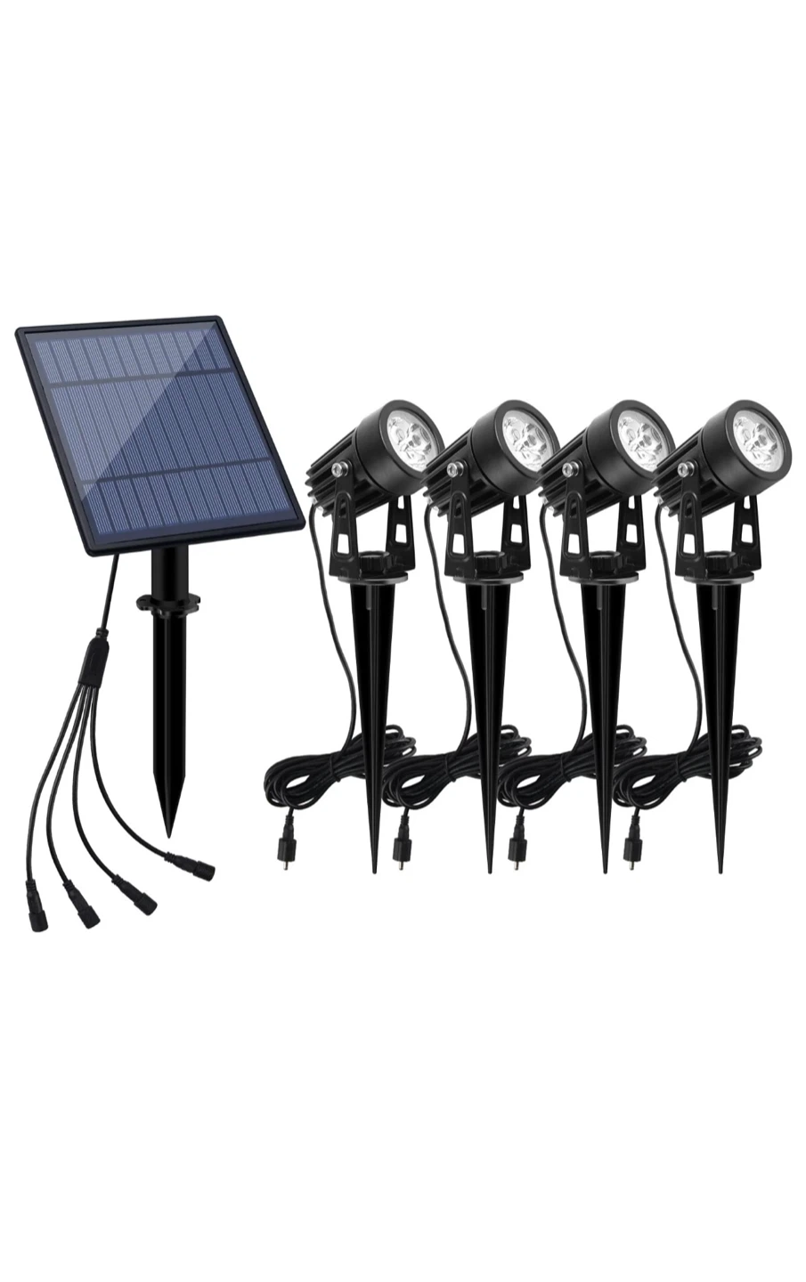 These spotlights are perfect for adding some light to your garden or walkway! They are solar powered, so you don't have to worry about wiring or batteries. The spotlights are waterproof with an IP65 rating, and they have two lighting modes: high brightness and low brightness. The solar panel is 6.1in x 7in, and the spotlight is 1.5in x 2.4in x 2.2in. The cable is 9.84ft/3m long