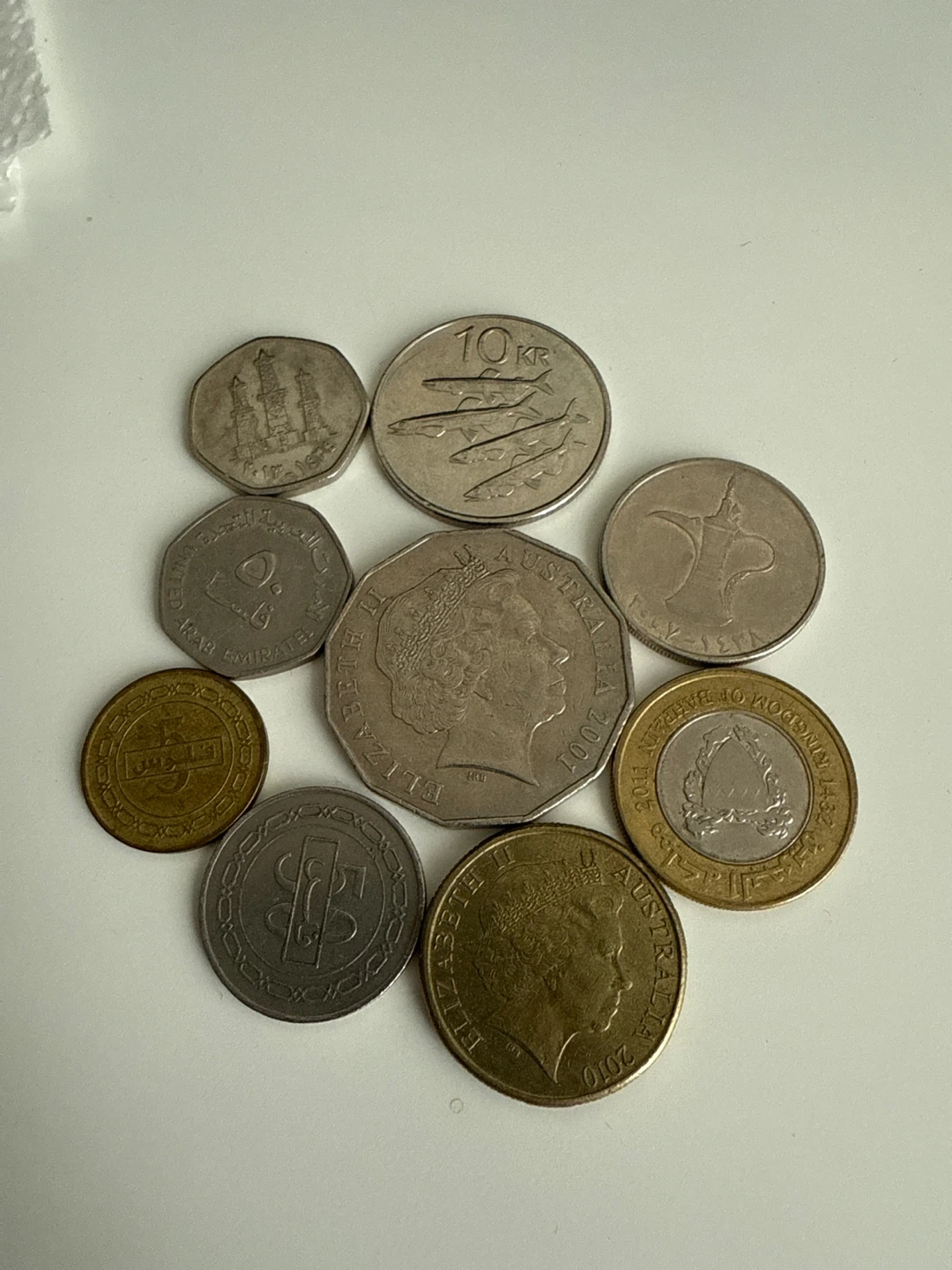 A collection of various international coins, including coins from Australia, United Arab Emirates, and more. Great for collectors or anyone interested in foreign currency