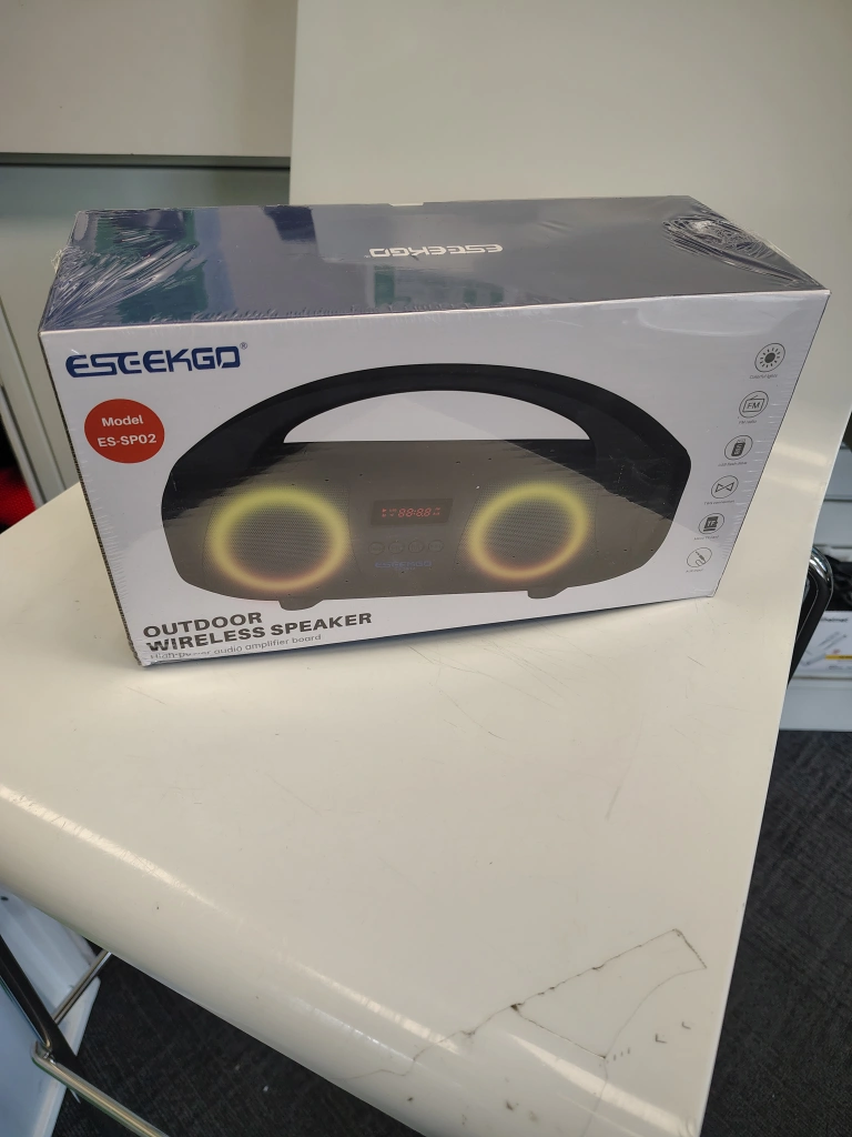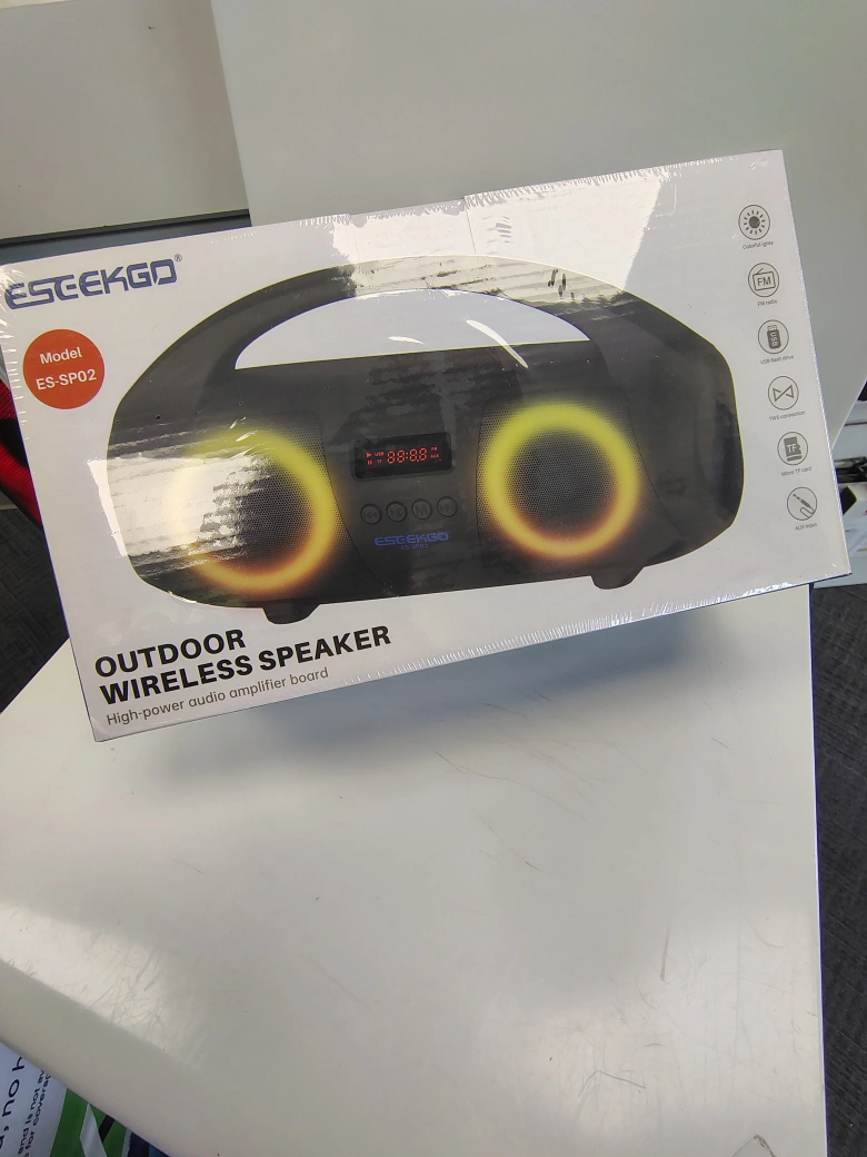 Selling a brand new Esteekgo ES-SP02 Outdoor Wireless Speaker! It's still in its original packaging. The speaker features a high-power audio amplifier board and colorful lights. Perfect for outdoor gatherings and enjoying your favorite tunes