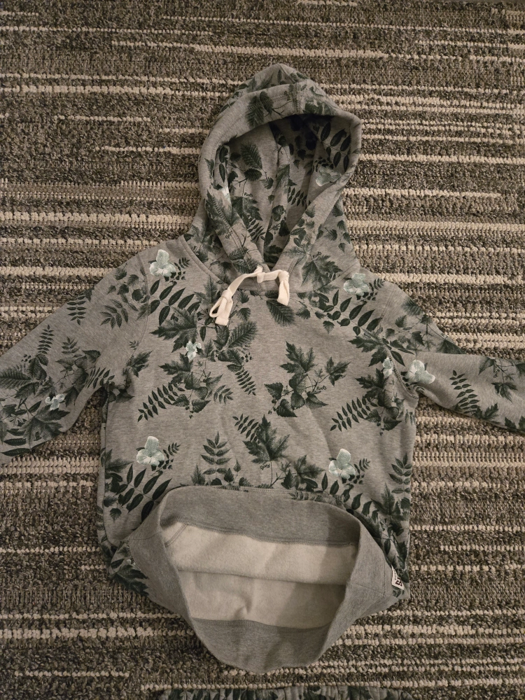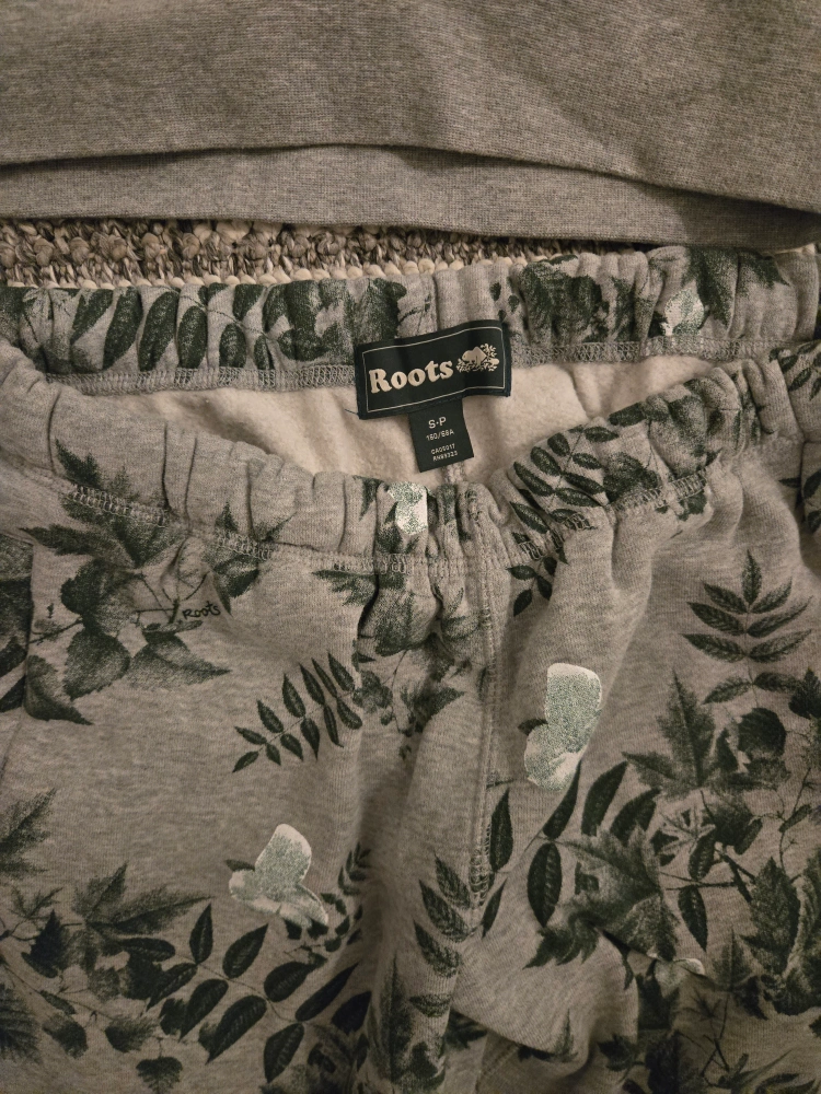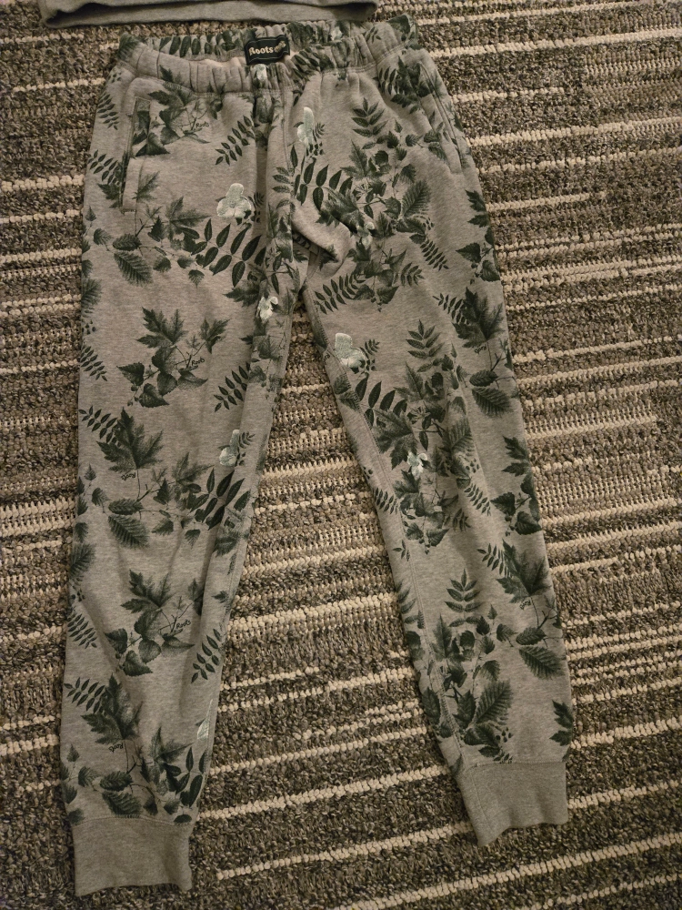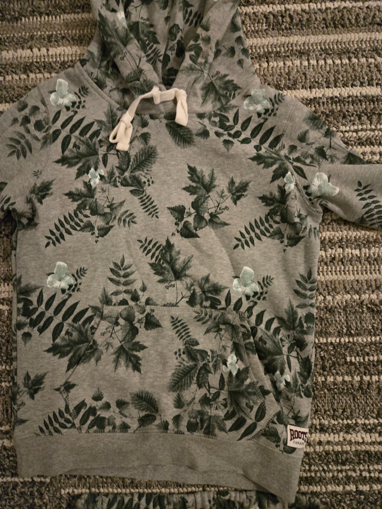 Selling a cute Roots set with a grey floral pattern! The set includes a hoodie and a pair of sweatpants. Both pieces are a size small. Perfect for lounging or running errands!