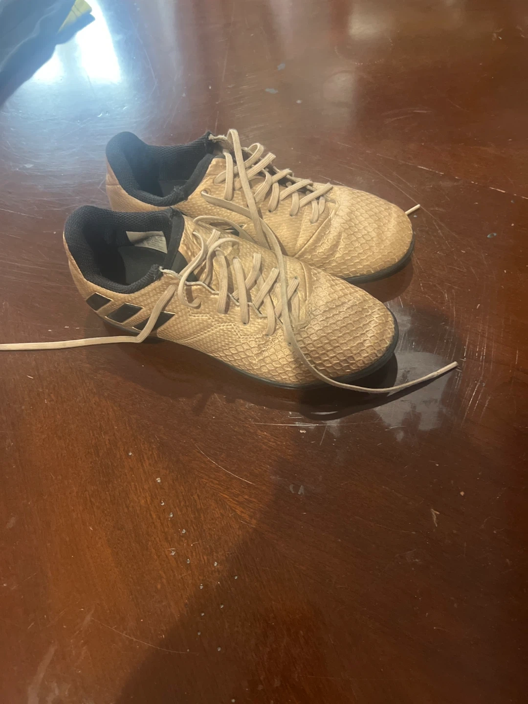 Selling a pair of Adidas soccer cleats in gold. They show some signs of wear, as you can see in the photos, but still have plenty of life left for some games! Size 1