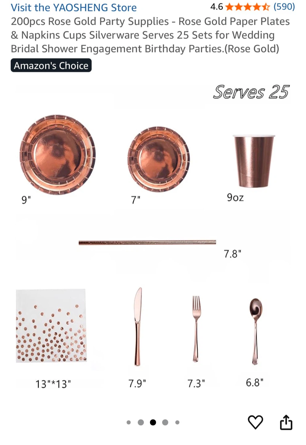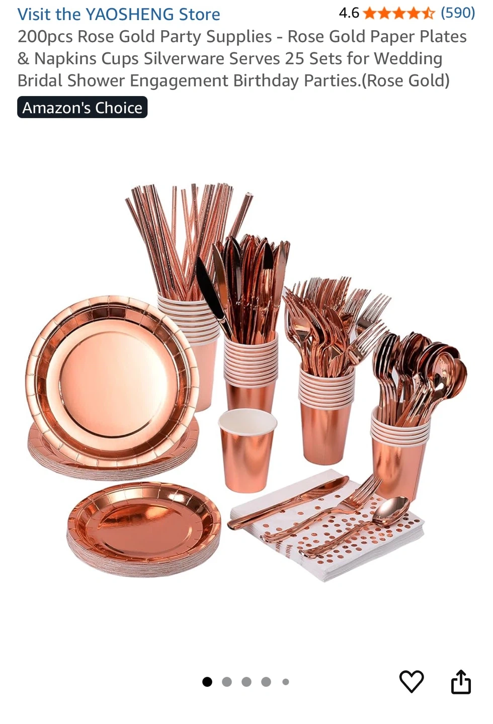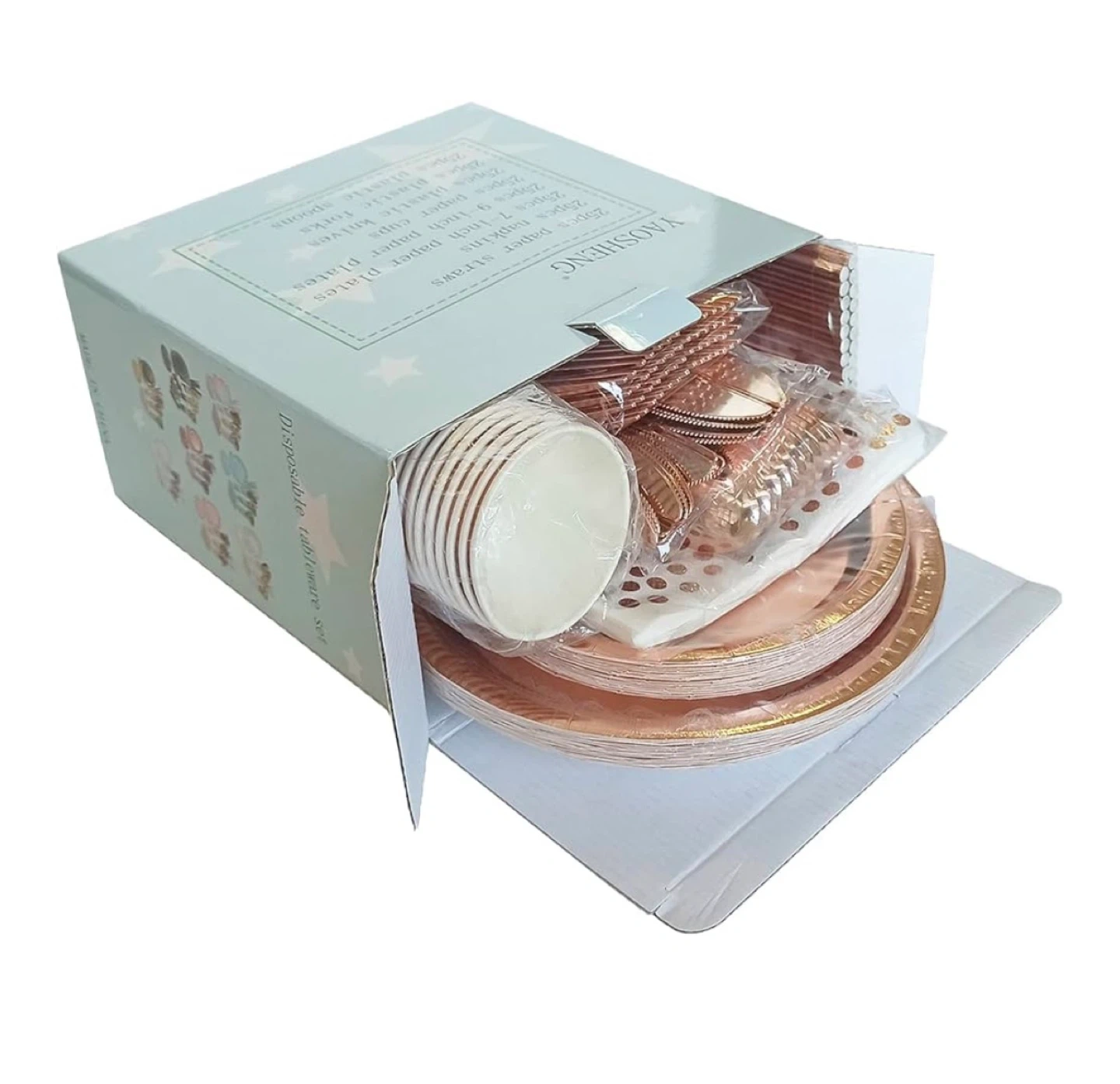 Get ready to party with this rose gold party supplies set! Includes plates, napkins, cups, and silverware for 25 guests. Perfect for weddings, bridal showers, engagement parties, and birthday celebrations. The set includes 9-inch and 7-inch plates, 9oz cups, napkins, straws, knives, forks and spoons. Comes in the original box!