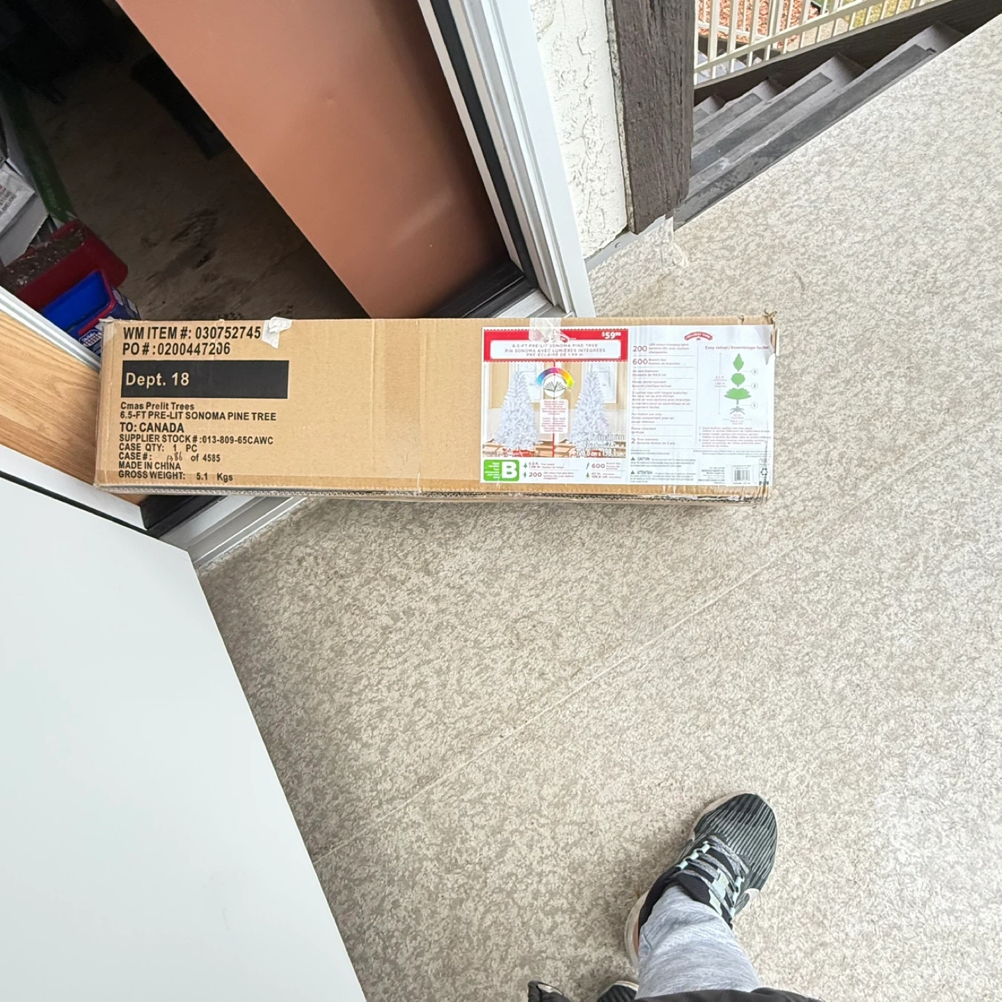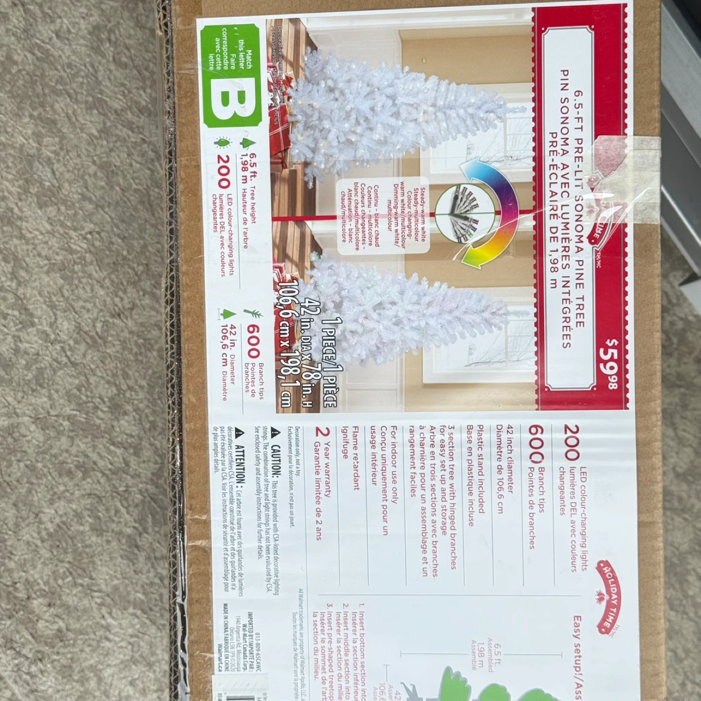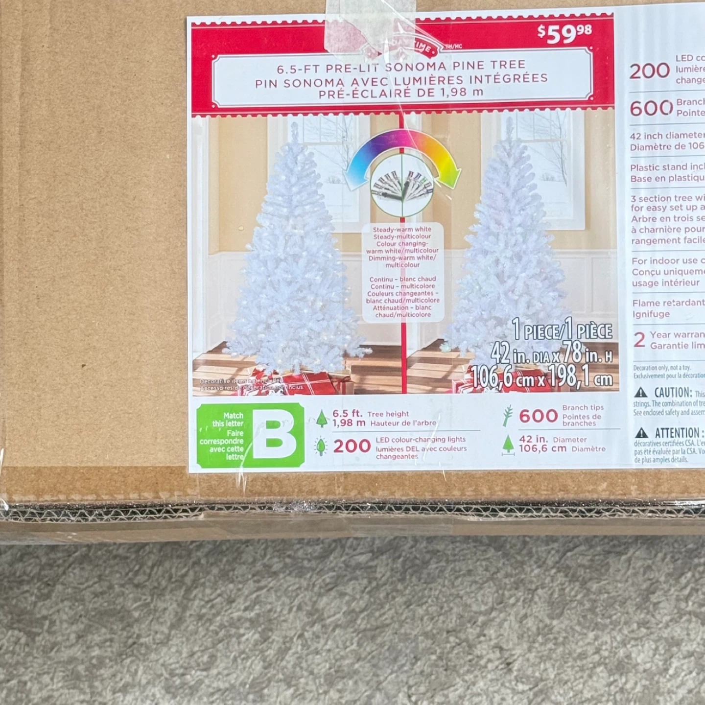 Selling a 6.5 ft pre-lit Sonoma Pine Tree. It comes in its original box. This tree features 200 LED colour-changing lights and 600 branch tips. It's 42 inches in diameter and 78 inches in height when assembled. Originally bought for $59.98