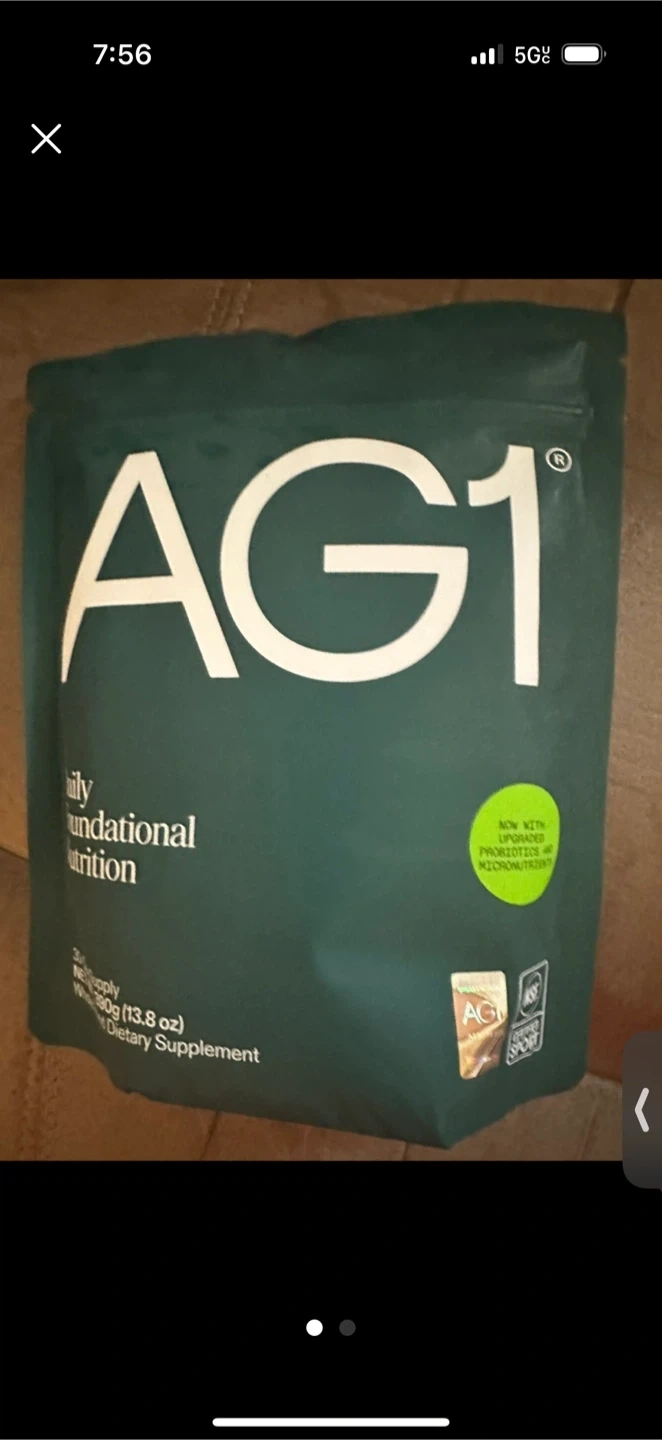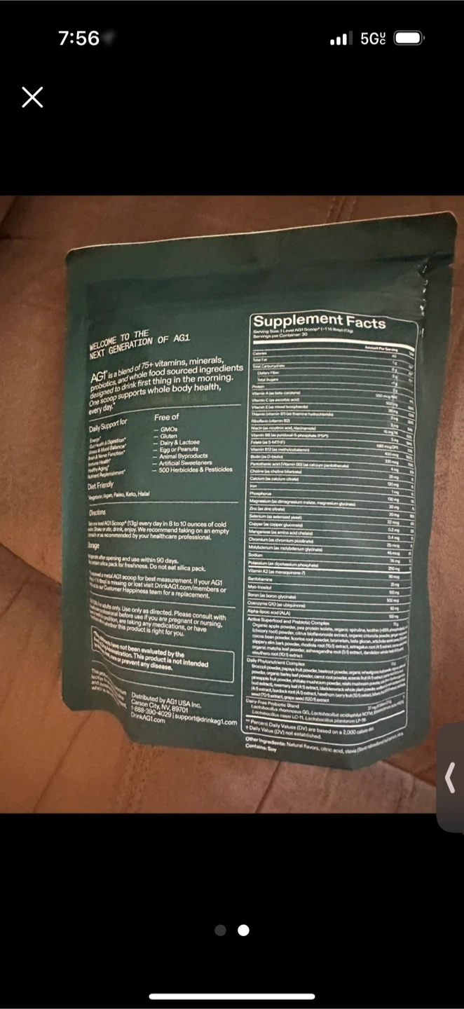 I'm selling a bag of AG1 Daily Foundational Nutrition. It's a blend of 75+ vitamins, minerals, probiotics, and whole food-sourced ingredients. This is designed to drink first thing every day for whole body health. The supplement facts are listed on the back of the bag.